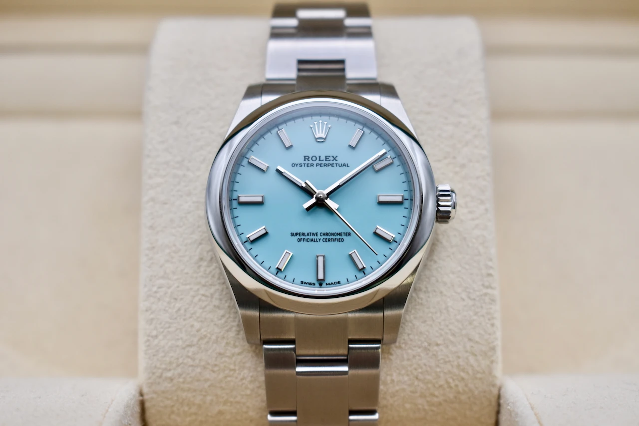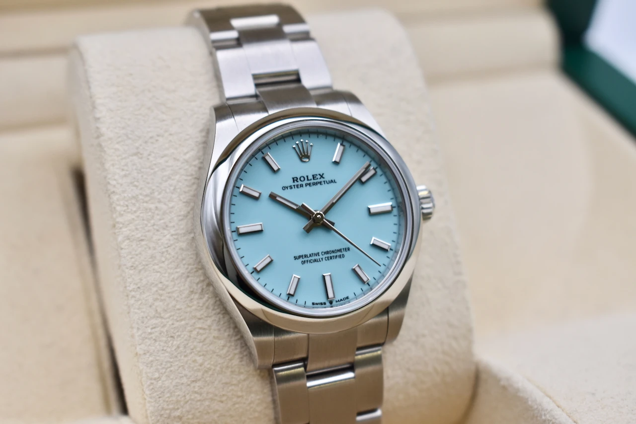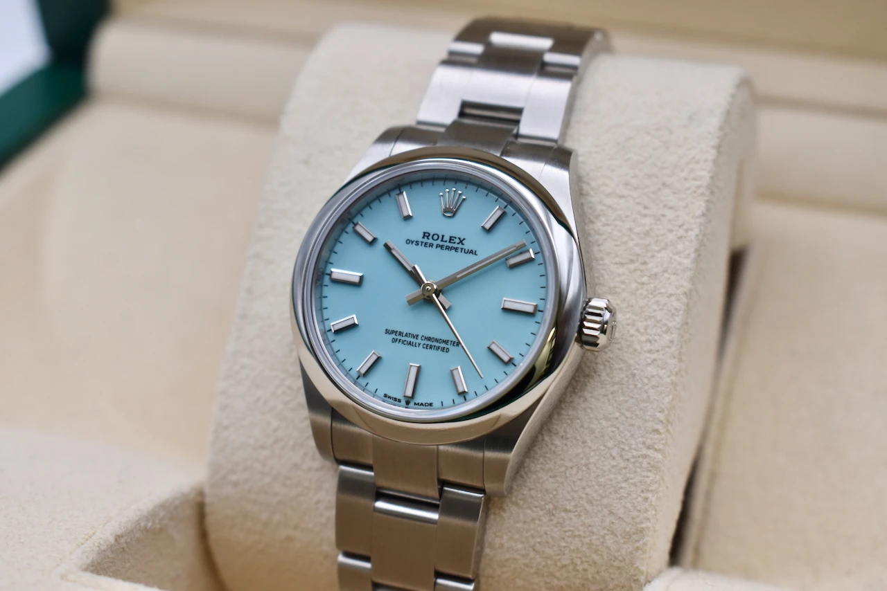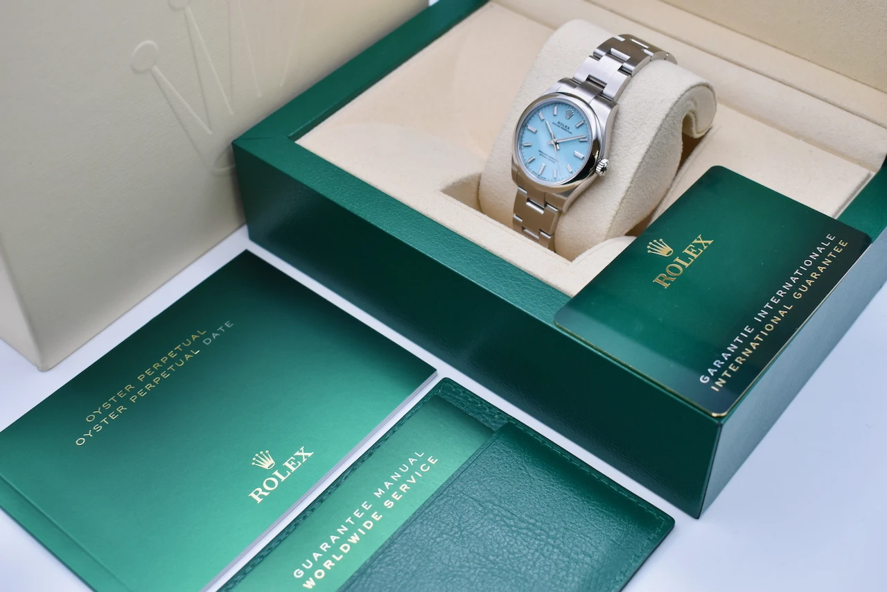 The Rolex Oyster Perpetual 31 (Ref. 277200) in stainless steel with the sought-after Tiffany Blue dial is one of the most desirable modern Rolex watches. Loved for its fresh, vibrant colour and timeless Rolex craftsmanship, this watch has become a true collector’s favourite and an icon in contemporary luxury watchmaking.Crafted from durable Oystersteel, the 31mm Oyster case ensures both elegance and resilience, housing Rolex’s precise automatic movement. The smooth bezel, polished finish, and iconic Oyster bracelet make this a versatile timepiece, equally at home as a daily wearer or a standout piece in any watch collection. The striking Tiffany Blue dial adds a bold yet refined touch, instantly recognisable and highly sought after worldwide.
