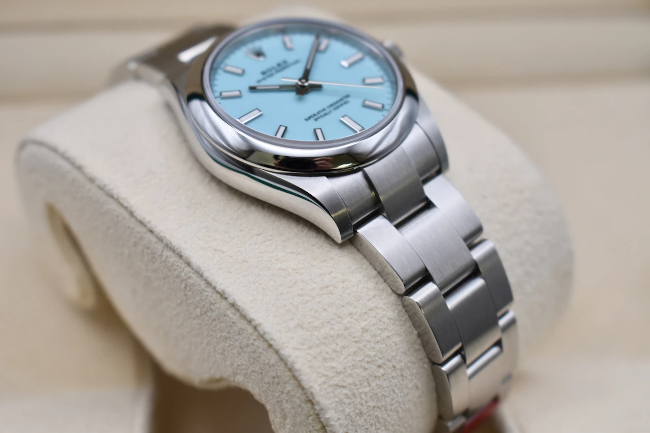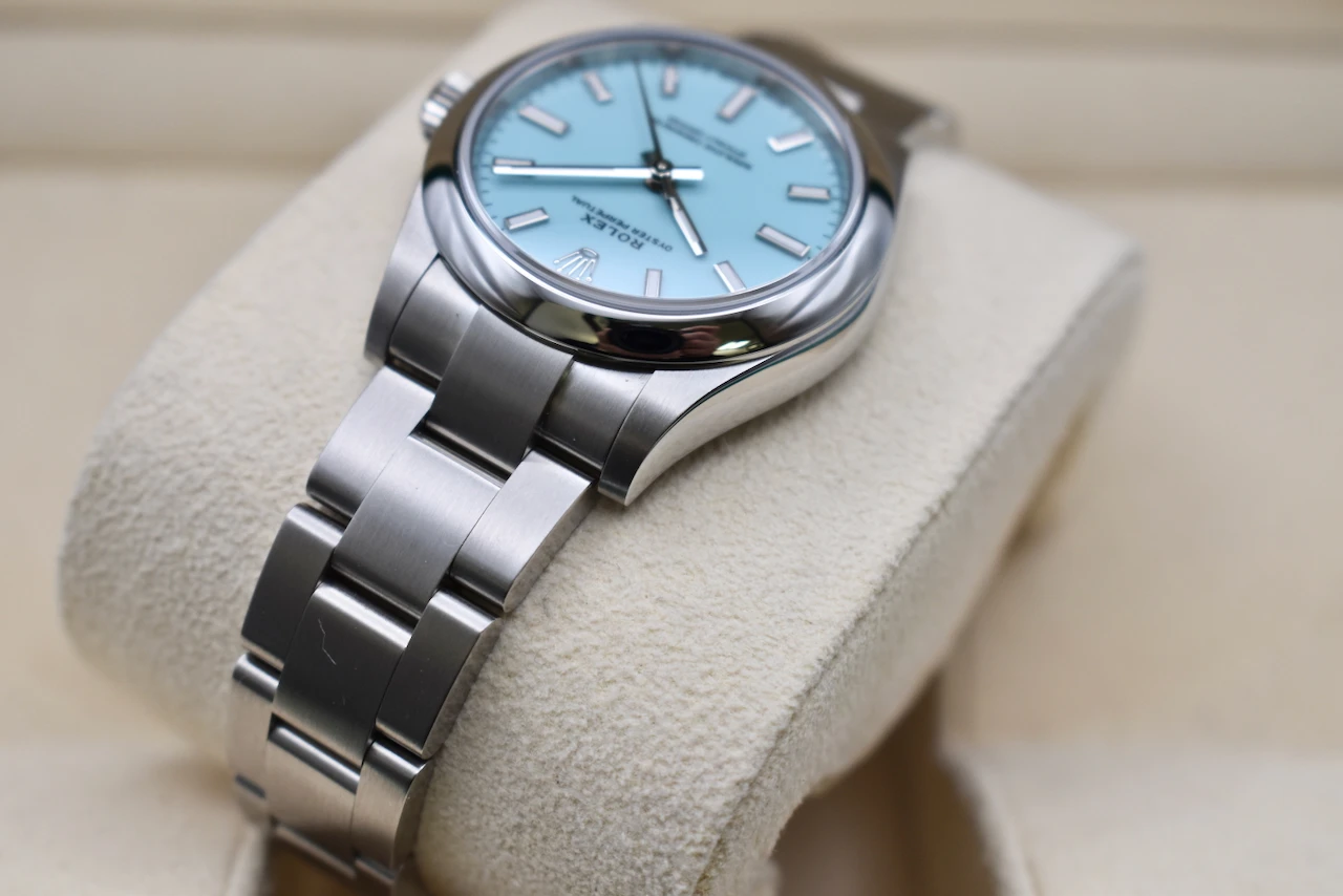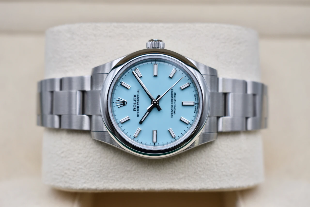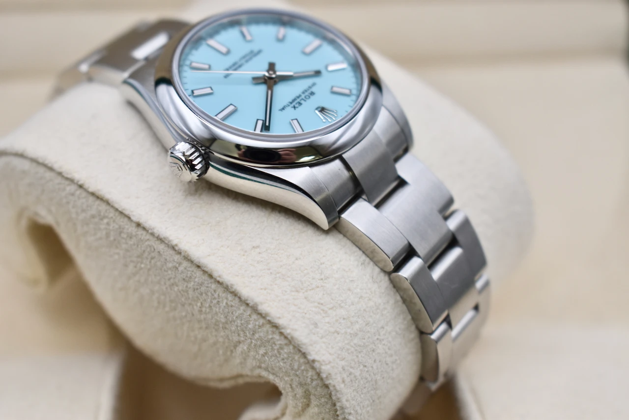 The Rolex Oyster Perpetual 31 (Ref. 277200) in stainless steel with the sought-after Tiffany Blue dial is one of the most desirable modern Rolex watches. Loved for its fresh, vibrant colour and timeless Rolex craftsmanship, this watch has become a true collector’s favourite and an icon in contemporary luxury watchmaking.Crafted from durable Oystersteel, the 31mm Oyster case ensures both elegance and resilience, housing Rolex’s precise automatic movement. The smooth bezel, polished finish, and iconic Oyster bracelet make this a versatile timepiece, equally at home as a daily wearer or a standout piece in any watch collection. The striking Tiffany Blue dial adds a bold yet refined touch, instantly recognisable and highly sought after worldwide.