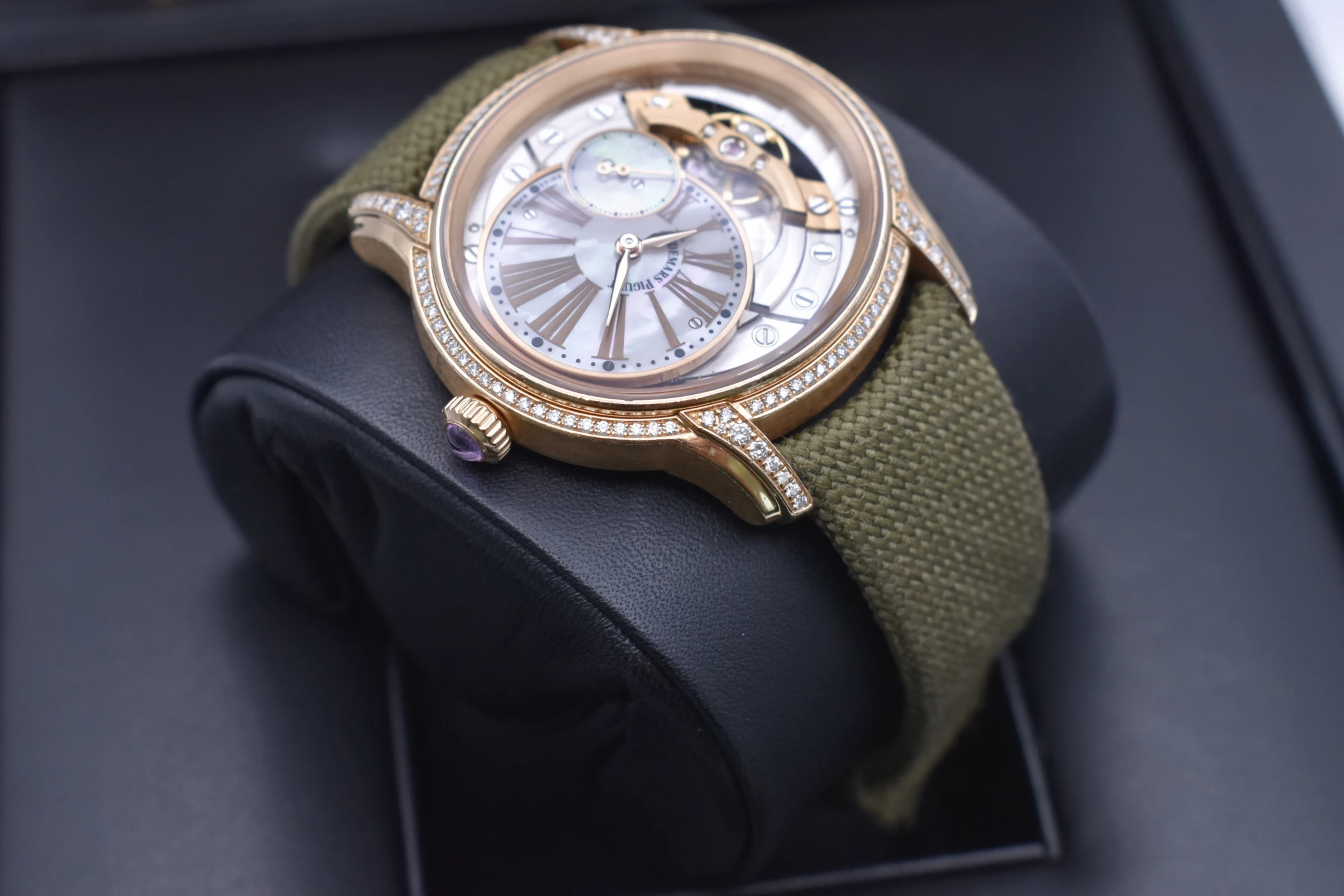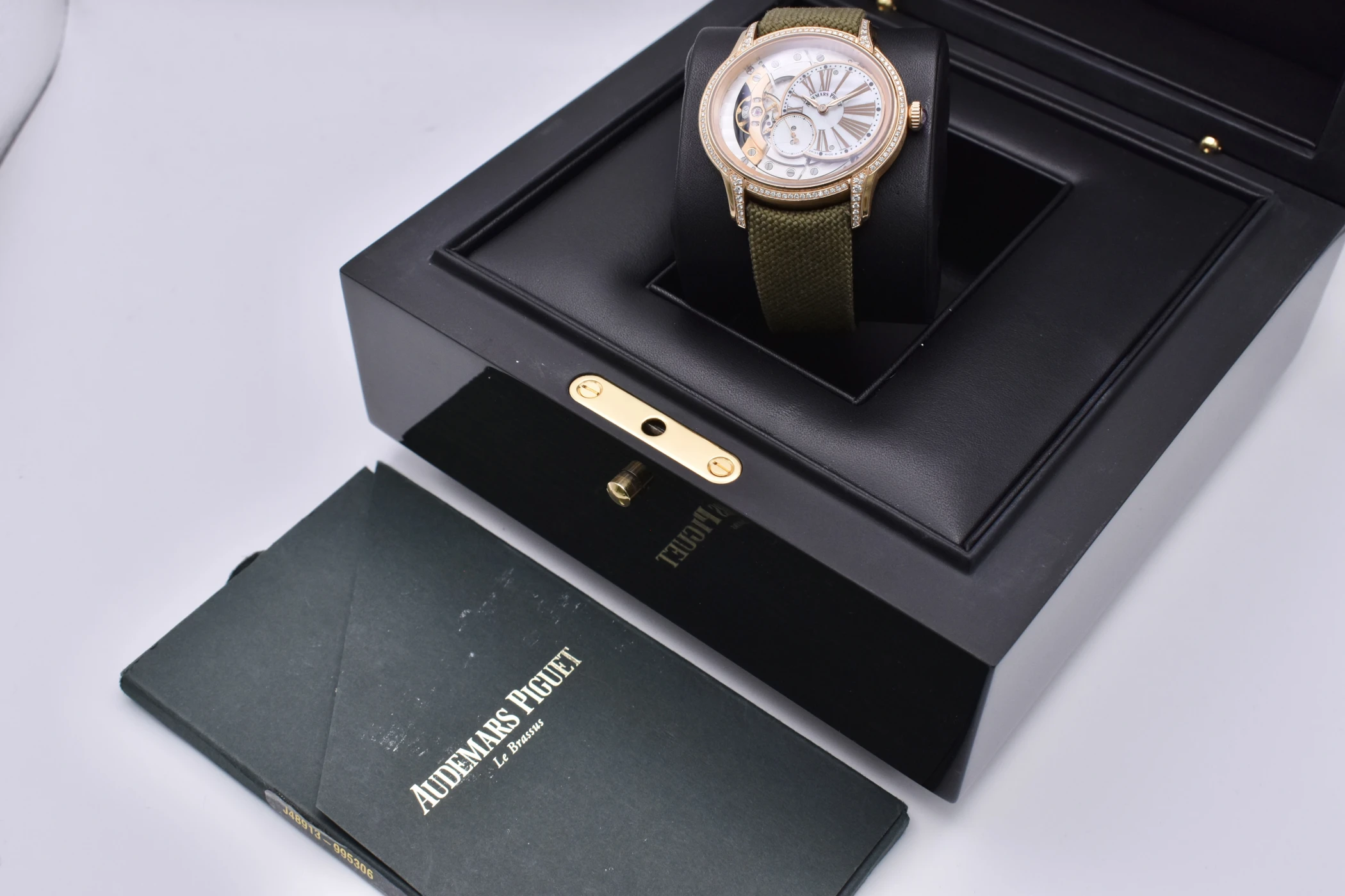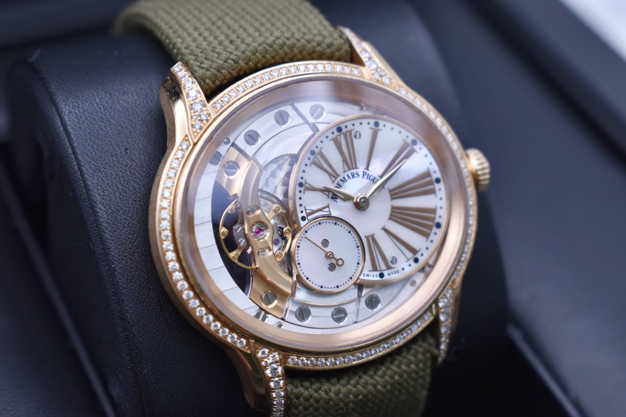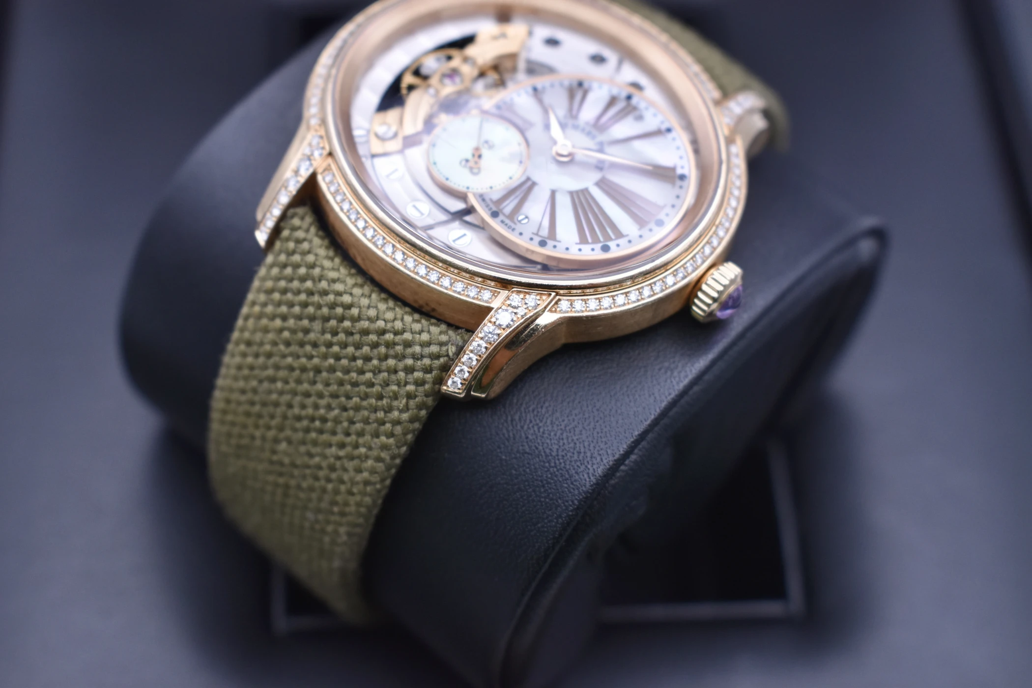 The Audemars Piguet Millenary 77247OR.ZZ.A812CR.01 is a masterpiece of haute horlogerie, blending 18K rose gold, a skeletonised movement, and a refined mother-of-pearl dial into a timepiece of unrivalled elegance. With its distinctive oval case, this ladies’ Audemars Piguet Millenary showcases the perfect balance between mechanical artistry and high jewellery design.Set with dazzling brilliant-cut diamonds on the bezel and lugs, the watch radiates sophistication while revealing its openworked movement, allowing you to admire the precision of Swiss craftsmanship. The combination of rose gold, mother of pearl, and skeleton dial makes this Millenary not just a watch, but a wearable work of art.