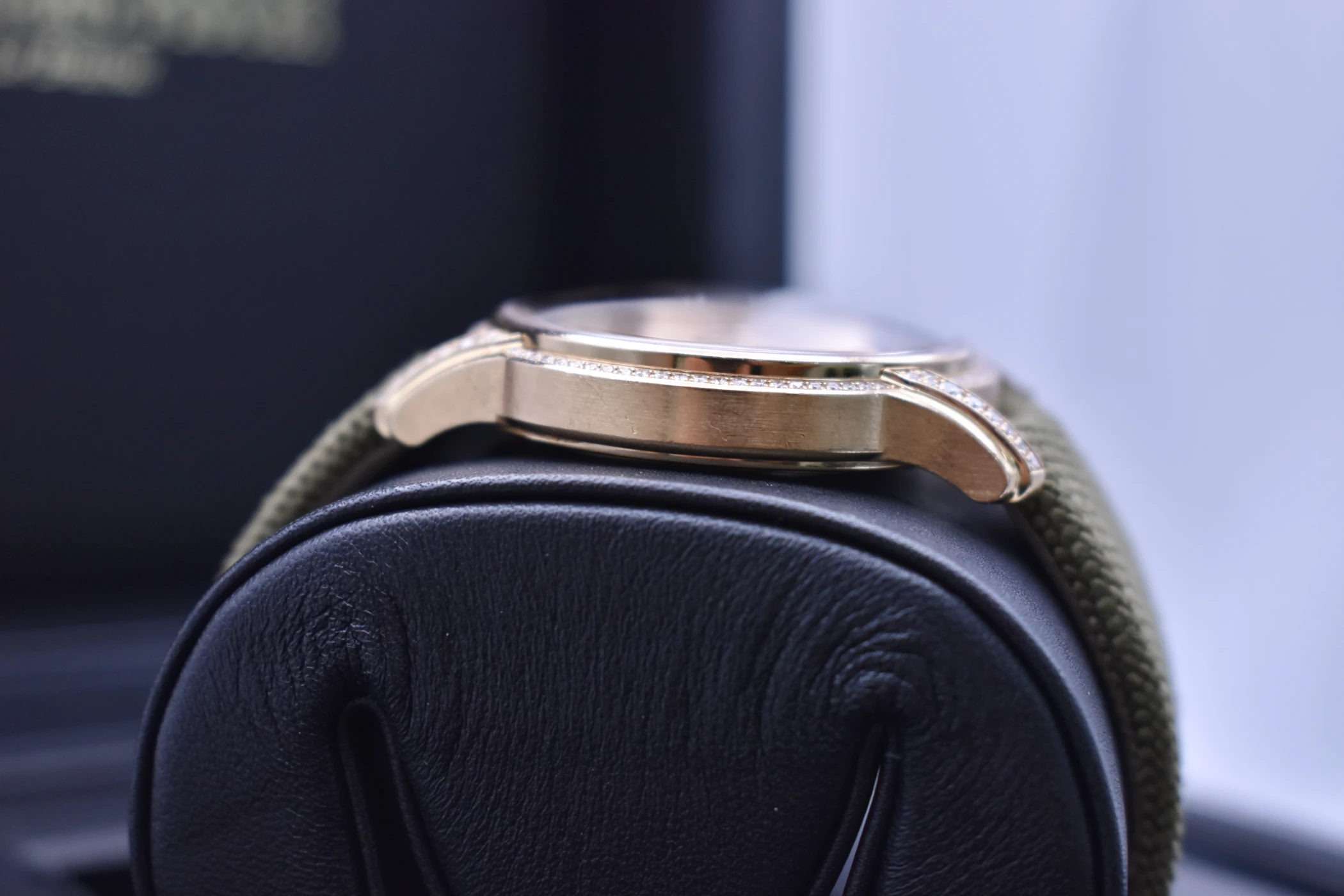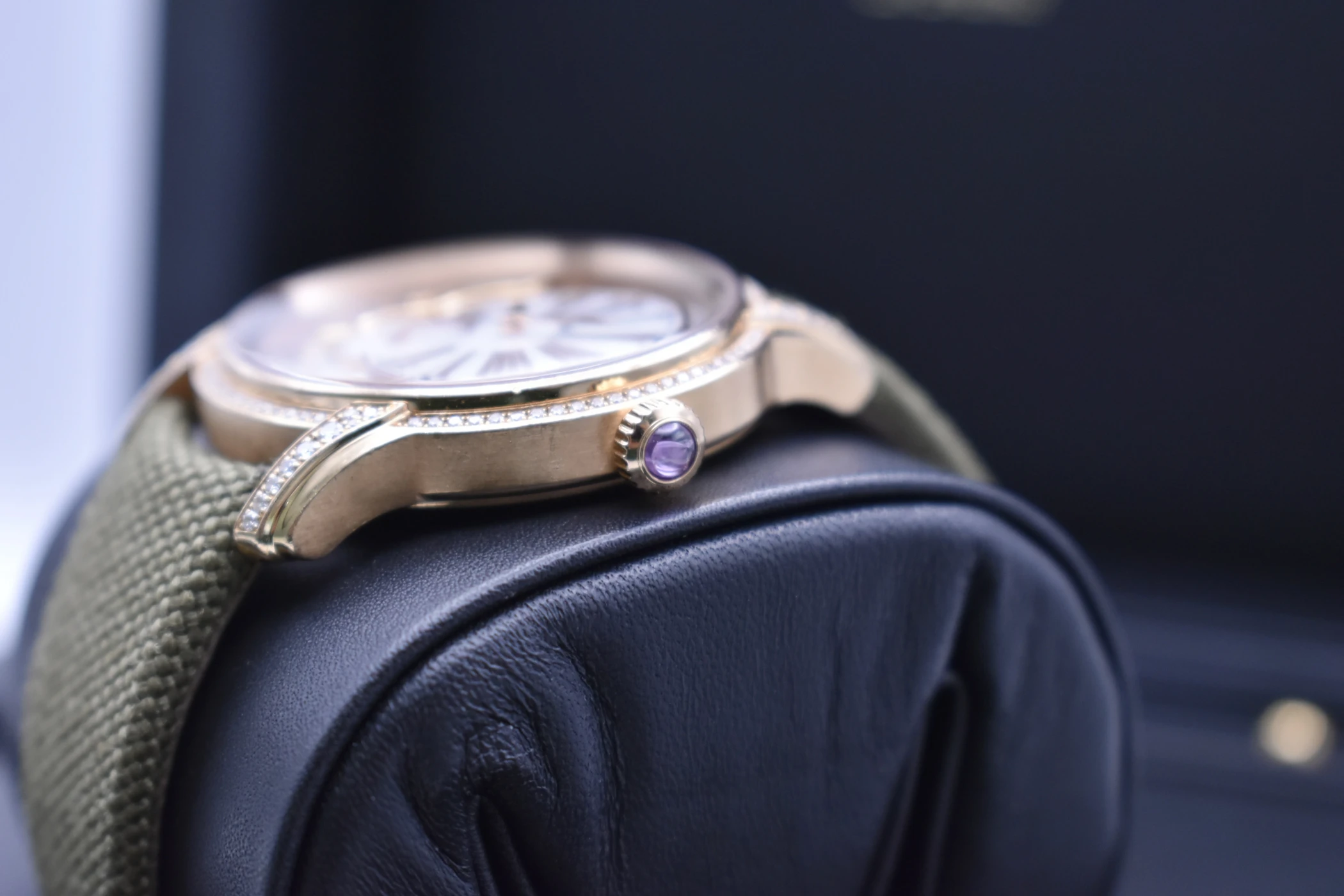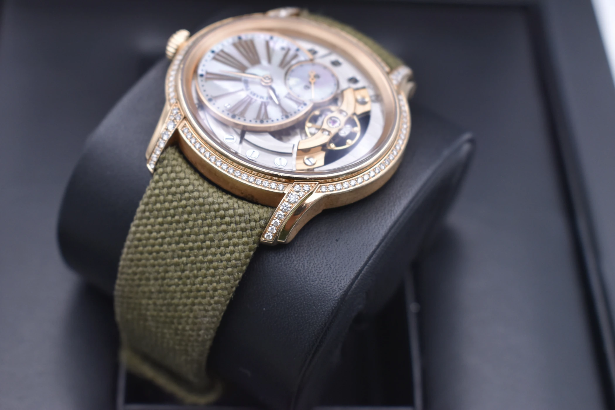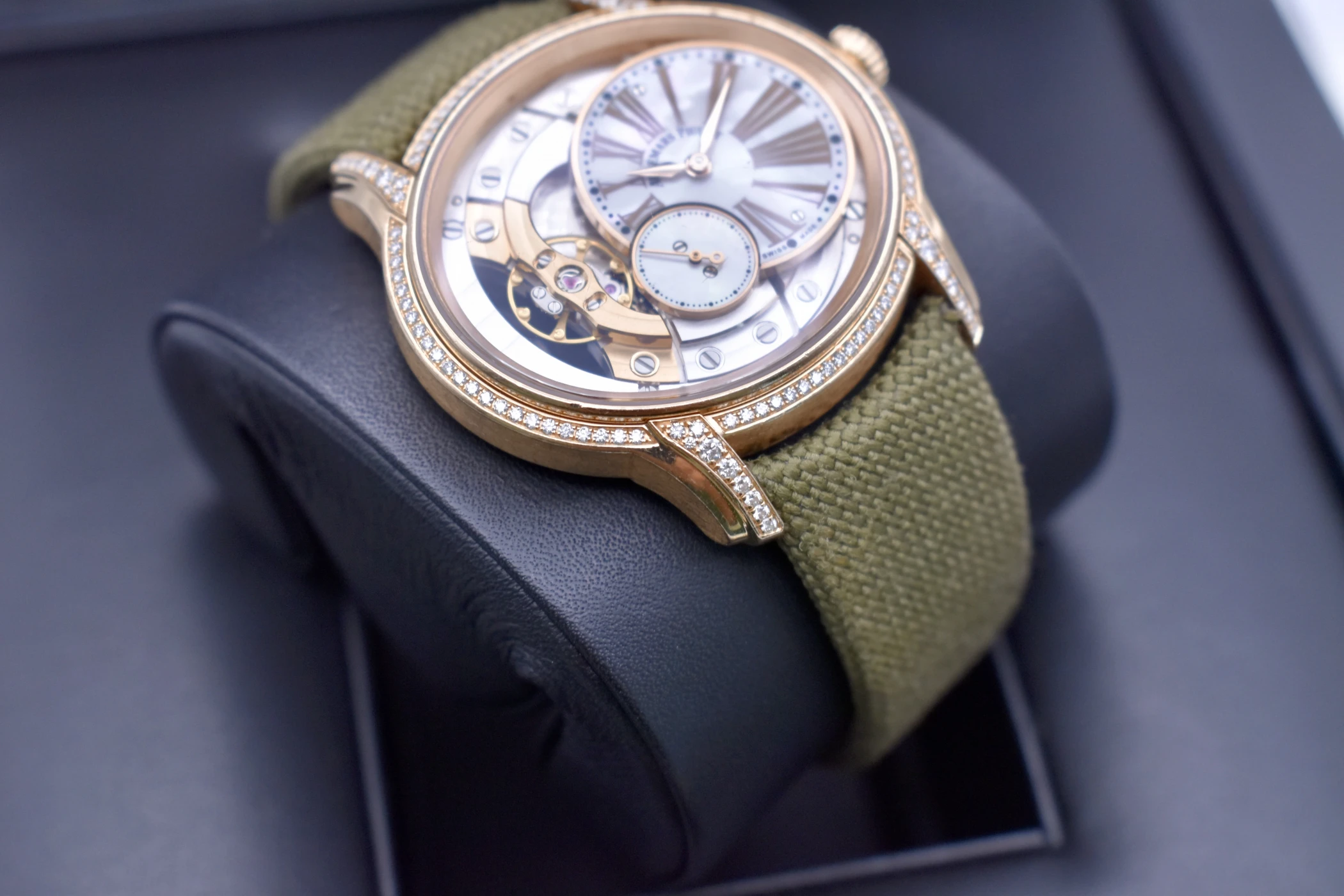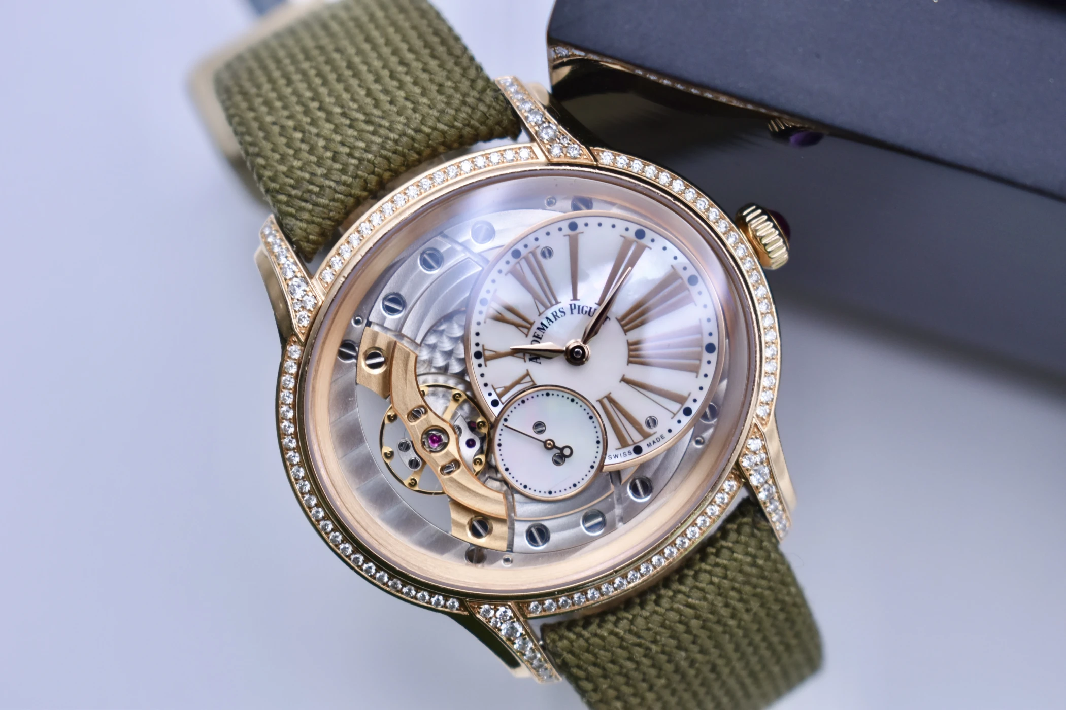 The Audemars Piguet Millenary 77247OR.ZZ.A812CR.01 is a masterpiece of haute horlogerie, blending 18K rose gold, a skeletonised movement, and a refined mother-of-pearl dial into a timepiece of unrivalled elegance. With its distinctive oval case, this ladies’ Audemars Piguet Millenary showcases the perfect balance between mechanical artistry and high jewellery design.Set with dazzling brilliant-cut diamonds on the bezel and lugs, the watch radiates sophistication while revealing its openworked movement, allowing you to admire the precision of Swiss craftsmanship. The combination of rose gold, mother of pearl, and skeleton dial makes this Millenary not just a watch, but a wearable work of art.