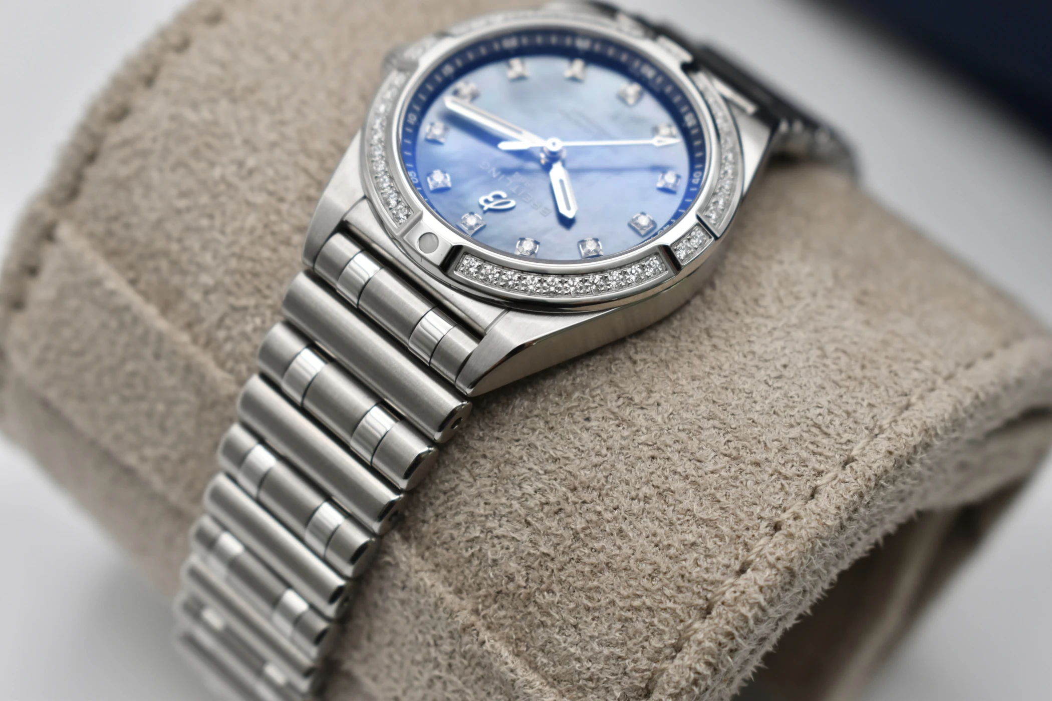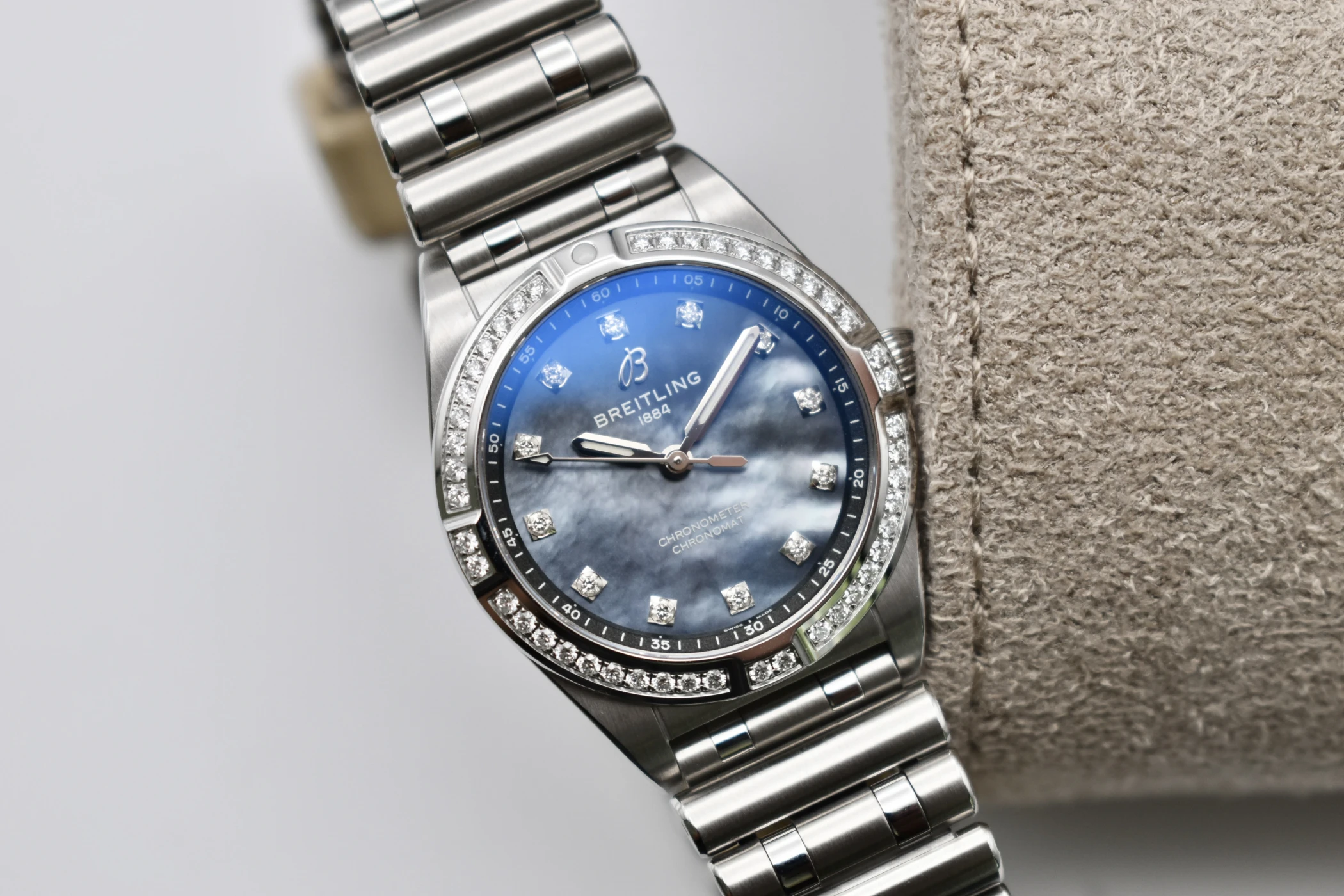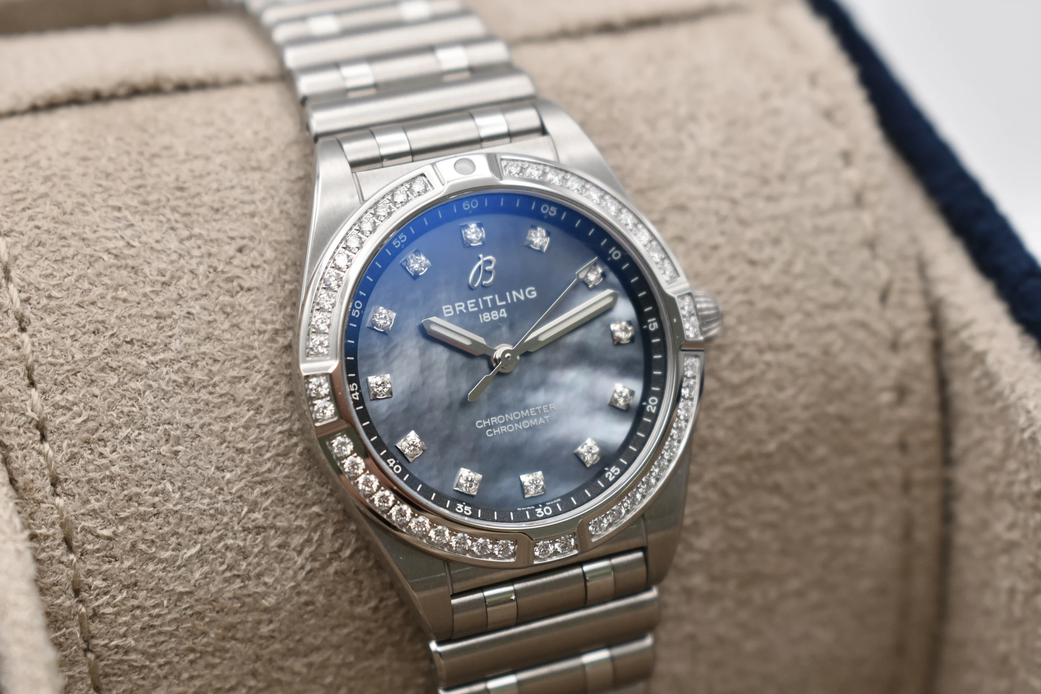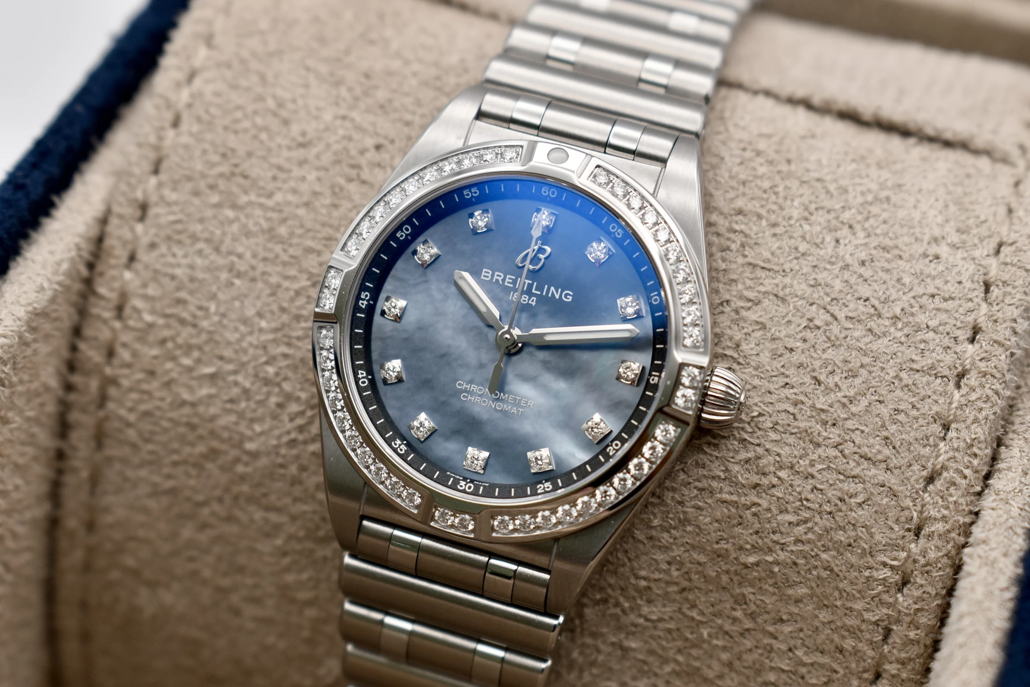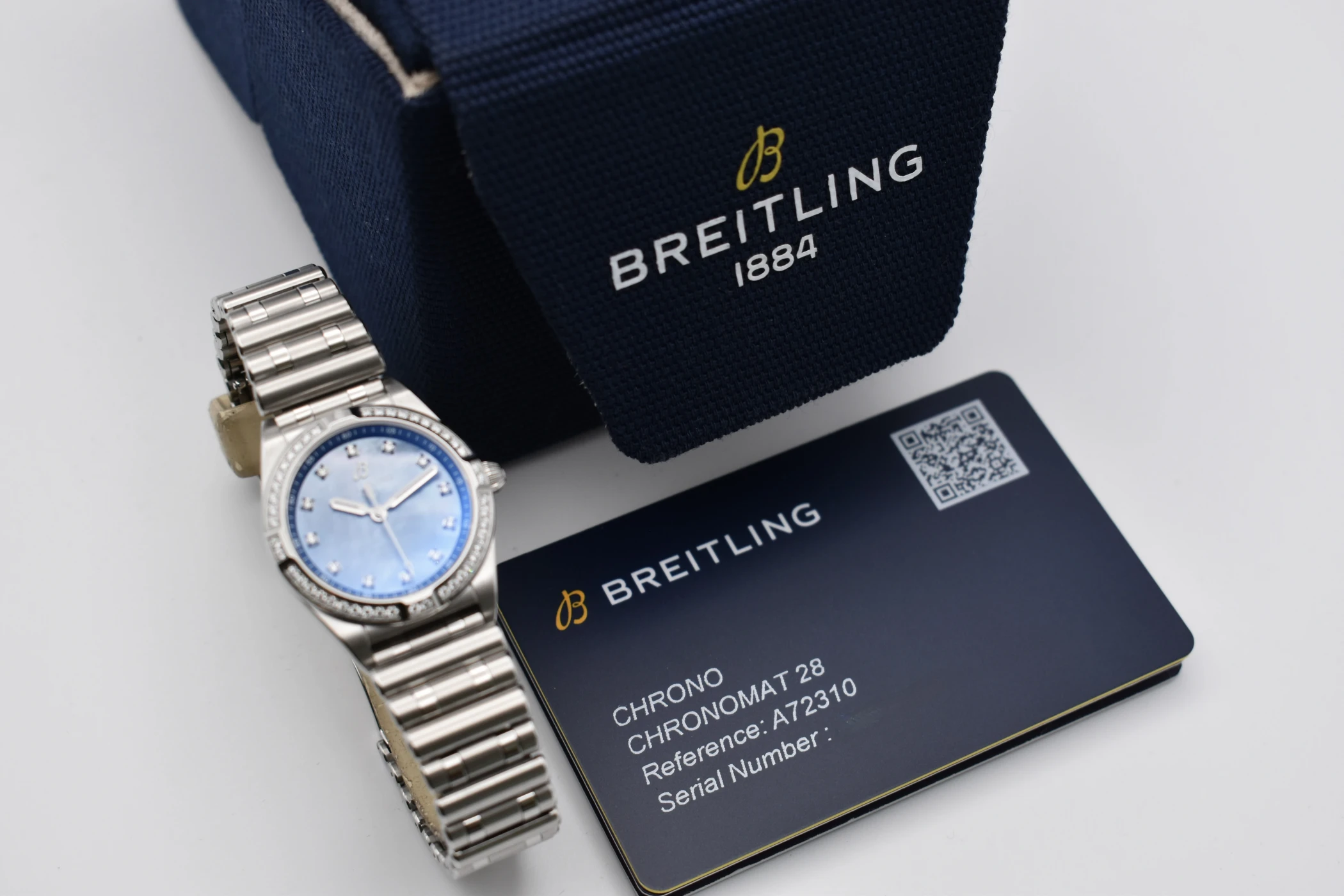 Elevate your style with the Breitling Chronomat 28 Blue MOP Diamond (Ref. A72310531G1A1), a luxurious ladies’ timepiece that perfectly blends Swiss precision with elegant design. Featuring a mother-of-pearl dial, diamond-set bezel, and stainless steel bracelet, this watch embodies Breitling’s signature craftsmanship and iconic Chronomat styling.The Chronomat 28 collection is celebrated for its sophisticated curves, precise Swiss movement, and dazzling diamond accents, making it a statement of elegance and refinement. The blue mother-of-pearl dial adds a unique iridescence, while the diamond markers elevate it to a fine jewellery standard, ideal for collectors and connoisseurs of luxury watches.