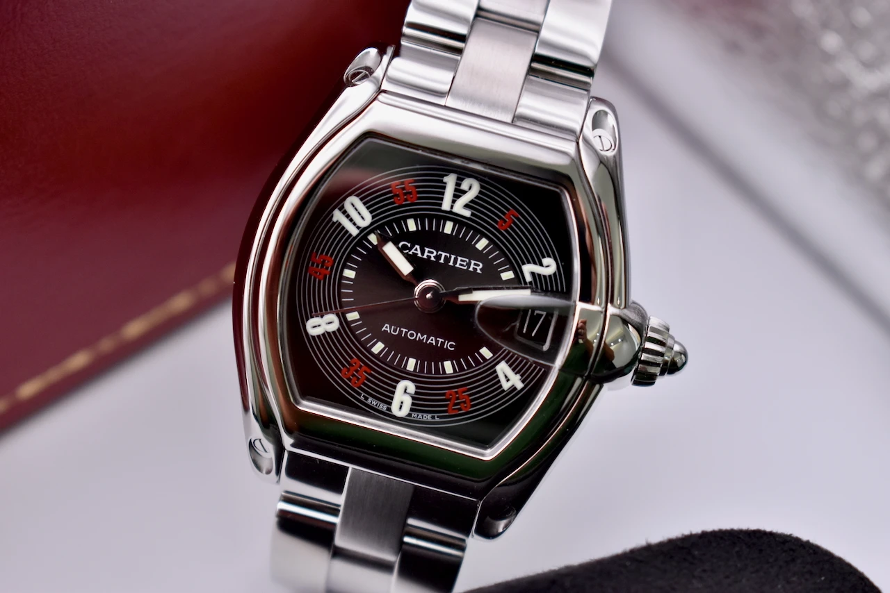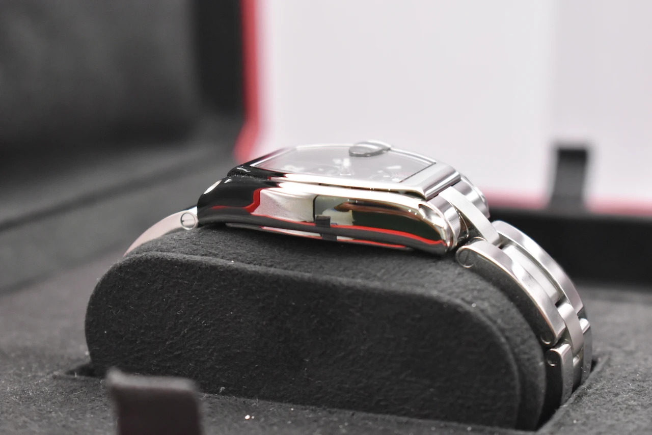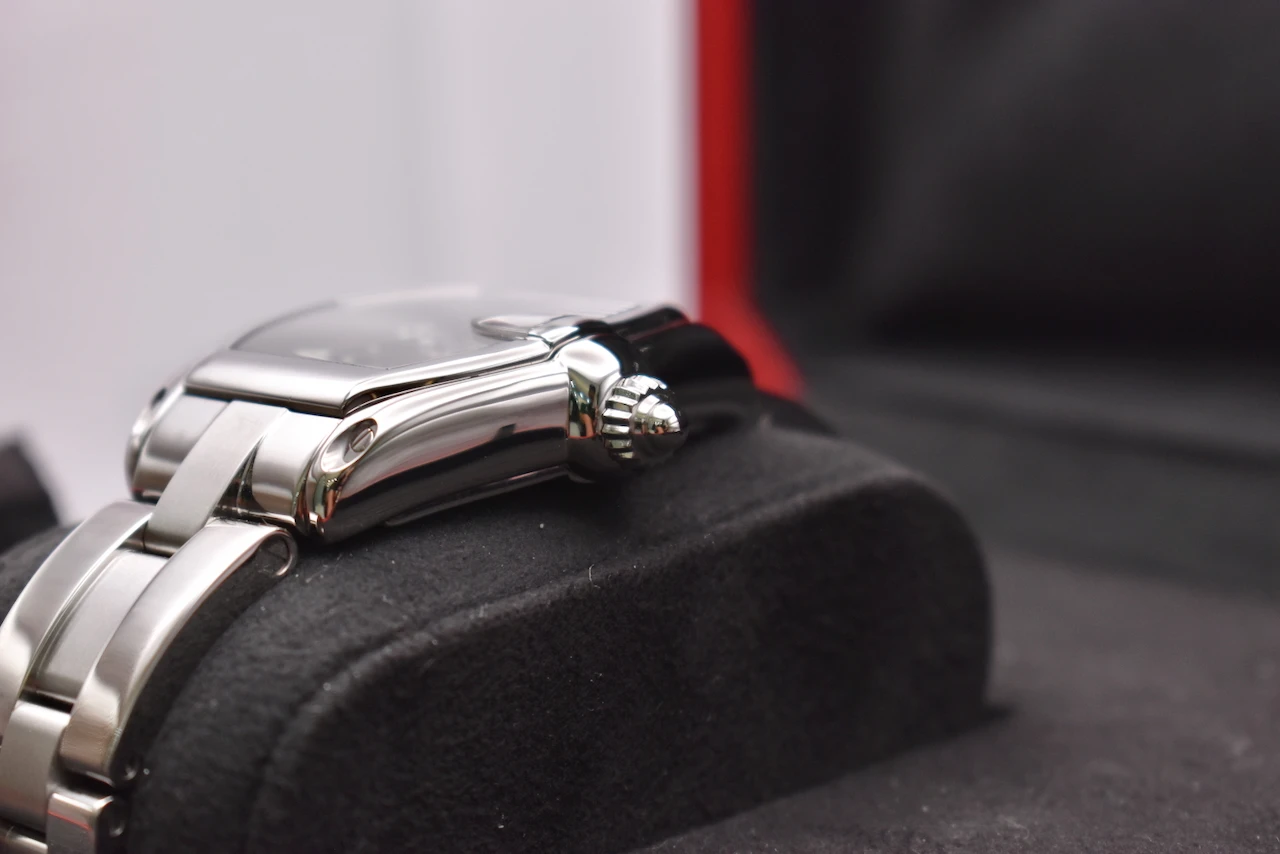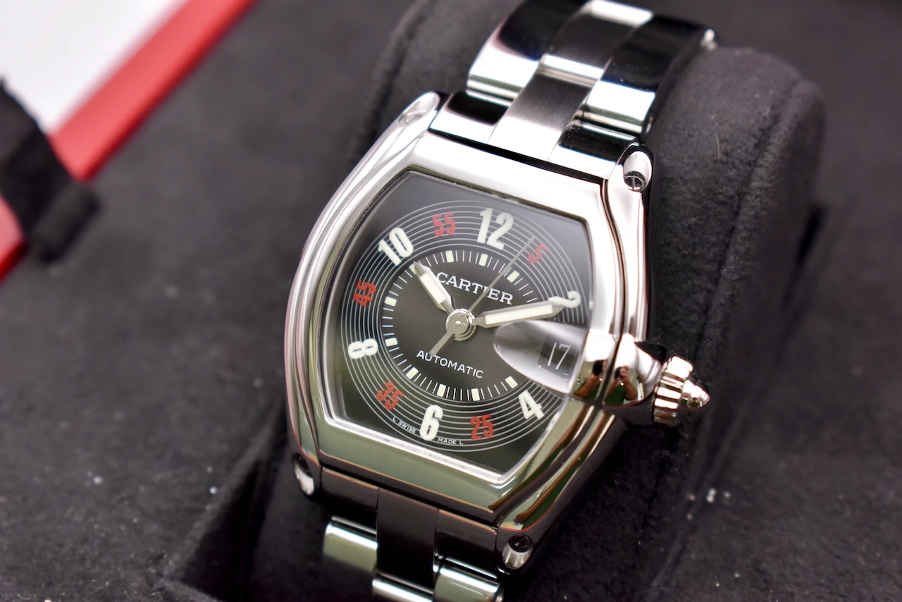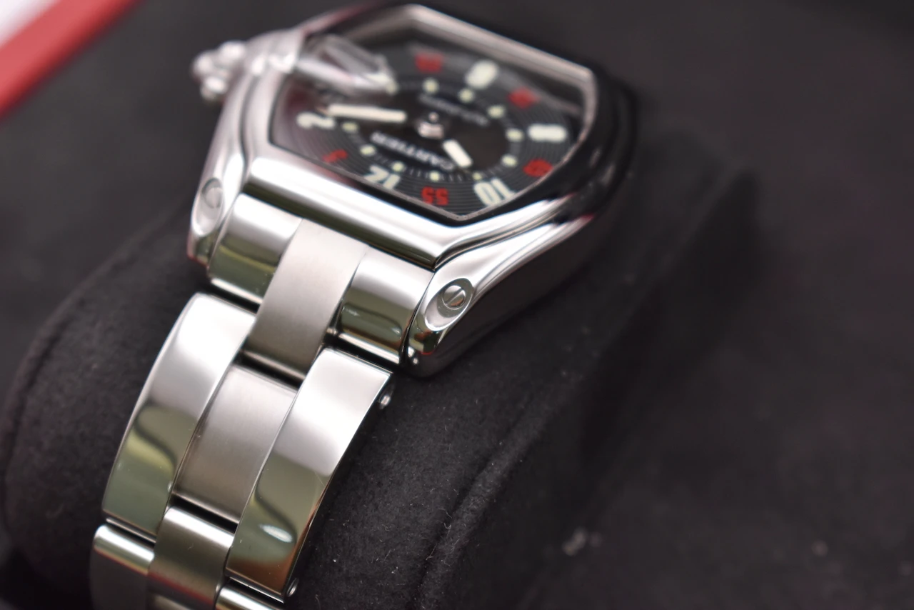 Experience the perfect blend of bold design and timeless elegance with the Cartier Roadster Vegas Dial Automatic Stainless Steel Watch (Ref. 2510). This striking edition of the iconic Roadster line features a distinctive “Vegas” dial, showcasing vibrant accent colours inspired by classic casino motifs—making it a standout piece for collectors and enthusiasts alike.Crafted from premium stainless steel, the 38mm tonneau-shaped case carries the unmistakable Roadster profile, complete with the signature screw-down crown and sleek, aerodynamic contours. The polished steel bracelet offers comfort, durability, and refined style, while the curved sapphire crystal enhances the watch’s unique presence on the wrist.Powered by a reliable Swiss automatic movement, the Roadster Vegas Dial delivers precision timekeeping and smooth performance, embodying Cartier’s commitment to horological excellence. Its bold dial layout, luminous hands, and date magnifier at 3 o’clock add both character and functionality.This model is ideal for those who appreciate luxury with personality—an expressive timepiece that stands out without sacrificing sophistication.Sold exclusively by Tempus Lord, trusted luxury watch specialists located in Hatton Garden, London’s historic jewellery quarter. Authenticity and quality are guaranteed.