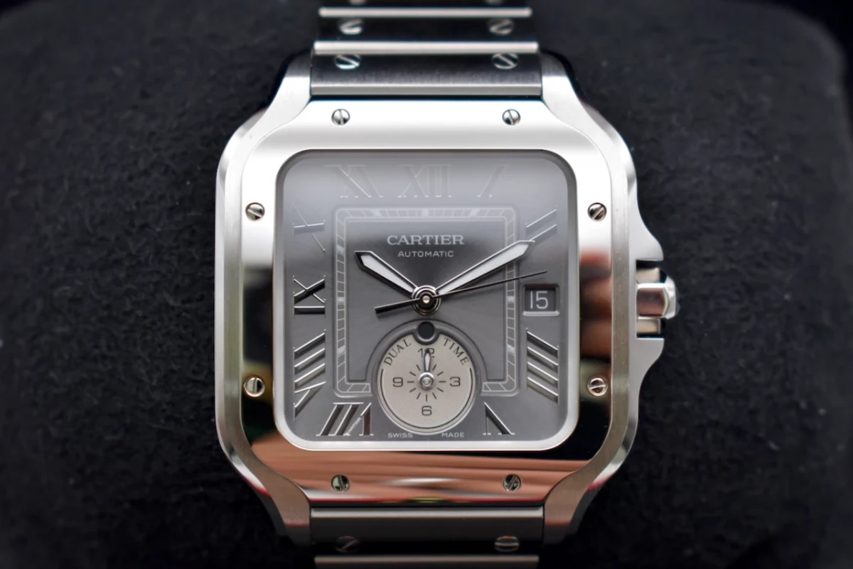 The Cartier Santos De Cartier Dual Time (Ref. WSSA0076) is a modern reinterpretation of one of Cartier’s most iconic timepieces. Crafted in stainless steel with a bold square case and exposed screws, this watch embodies the aviation heritage of the original Santos while introducing a practical dual time complication for today’s global traveller.This sophisticated model features a silvered opaline dial with sword-shaped blue steel hands, Roman numeral markers, and a second time zone sub-dial, allowing you to track two time zones at once with style and precision. Powered by a Swiss automatic movement, the WSSA0076 combines Cartier’s timeless design with contemporary functionality.