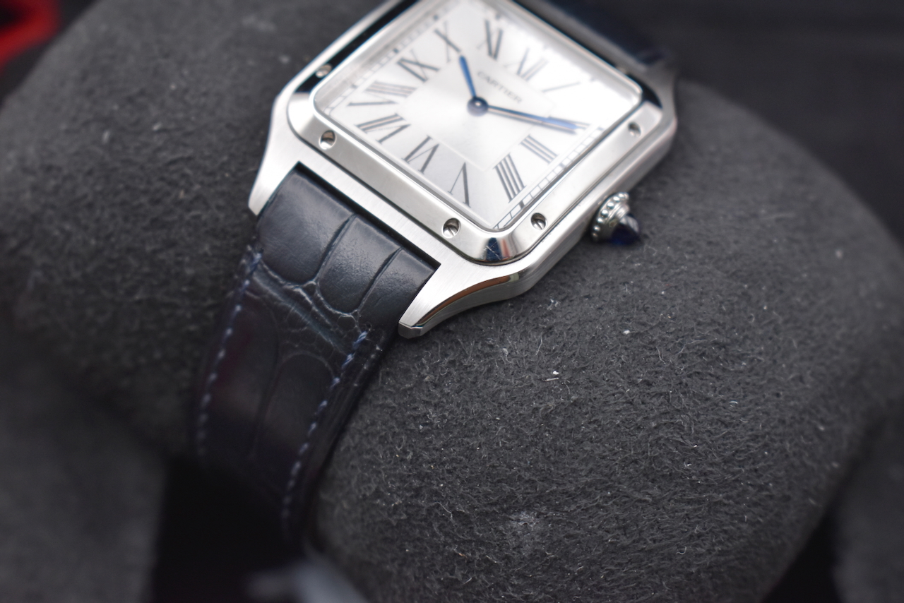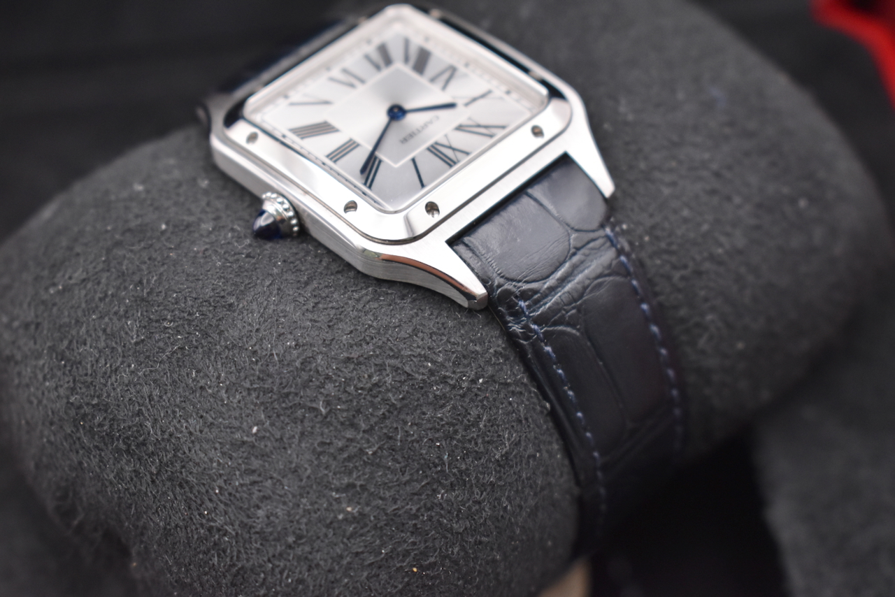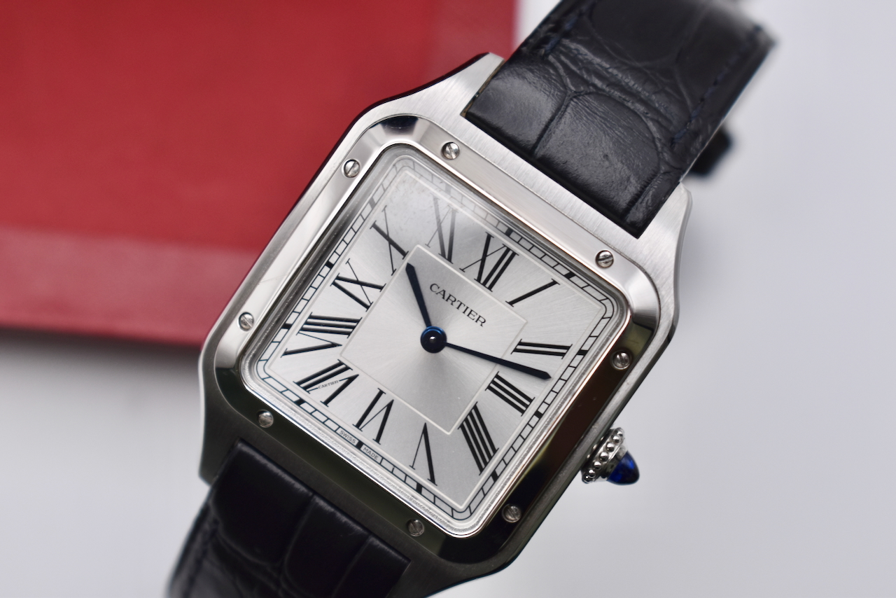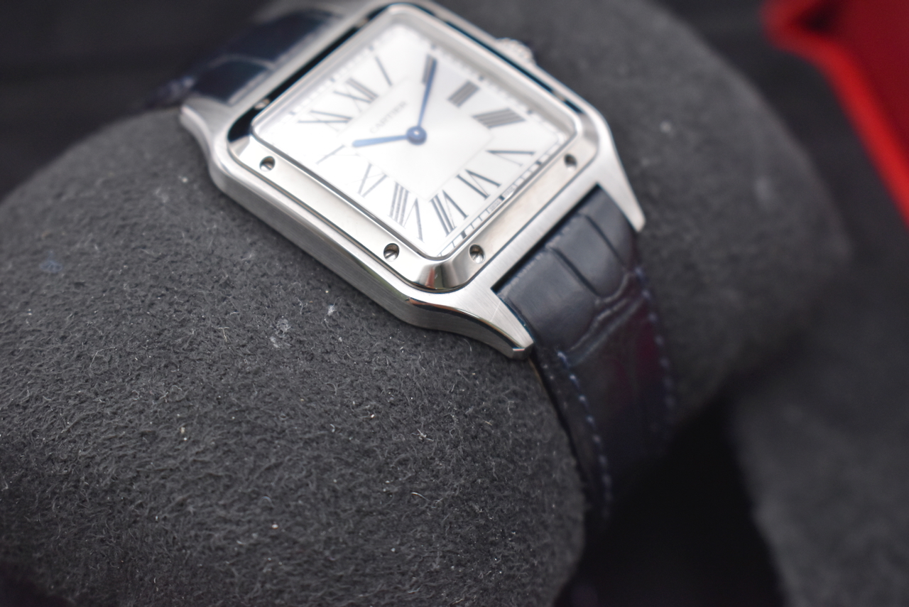 The Cartier Santos Dumont Large Stainless Steel Watch (WSSA0022) is a true icon of refined watchmaking, blending timeless design with unmistakable Cartier elegance. Inspired by aviation heritage and celebrated for its slim profile and square case, the Santos Dumont is the perfect dress watch for those who appreciate understated luxury.This example is presented in excellent condition, having been carefully maintained, with crisp case lines and a beautifully preserved dial featuring Cartier’s signature Roman numerals and blued steel hands. Crafted in stainless steel, the watch sits effortlessly on the wrist, offering both comfort and sophistication for daily wear or special occasions.Importantly, this watch is supplied as a complete set, coming with its original Cartier box and papers, adding confidence, collectability, and long-term value.Offered by Tempus Lord, a trusted independent luxury watch specialist based in Hatton Garden, London, this timepiece has been thoroughly inspected for authenticity and quality. Buying from Tempus Lord ensures peace of mind, expert knowledge, and exceptional service from one of the UK’s most respected watch districts.A timeless classic with enduring appeal, the Cartier Santos Dumont WSSA0022 is an outstanding choice for collectors and first-time Cartier owners alike.