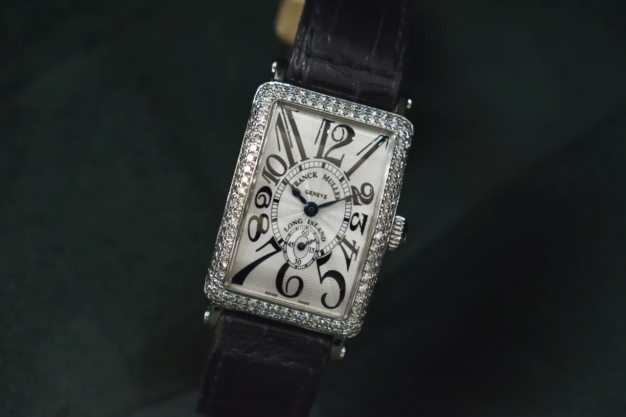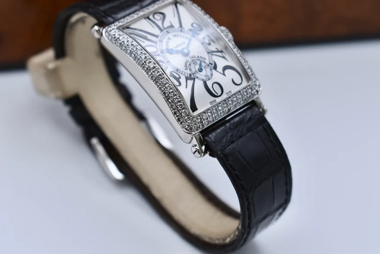 Discover timeless elegance with the Franck Muller Long Island 18ct White Gold Diamond-Set Watch, reference 900 S6 D—a masterpiece of Swiss haute horology. This exquisite timepiece showcases Franck Muller’s iconic rectangular Long Island case, crafted from luxurious 18ct white gold and adorned with a stunning factory-set diamond bezel that radiates sophistication from every angle.The beautifully curved case houses Franck Muller’s signature stylised numerals and an impeccably finished dial, combining modern glamour with classic artistry. Powered by a precise Swiss movement, the watch embodies the brand’s reputation for exceptional craftsmanship and mechanical excellence.This exceptional piece is offered with its original Franck Muller box and papers, ensuring full authenticity and adding to its desirability for collectors and connoisseurs alike. Whether worn as a statement piece or added to a curated collection, this diamond-set Long Island stands out as a symbol of refined luxury.Expertly sourced and presented by Tempus Lord, trusted luxury watch specialists based in Hatton Garden, London’s historic jewellery quarter.