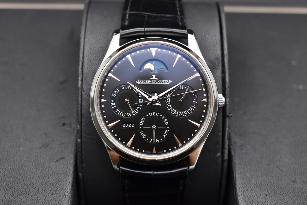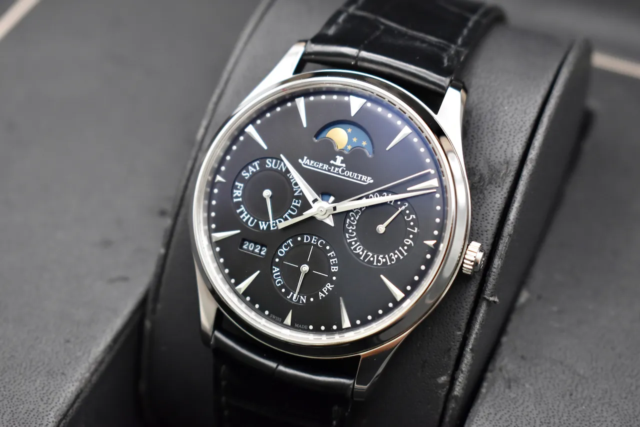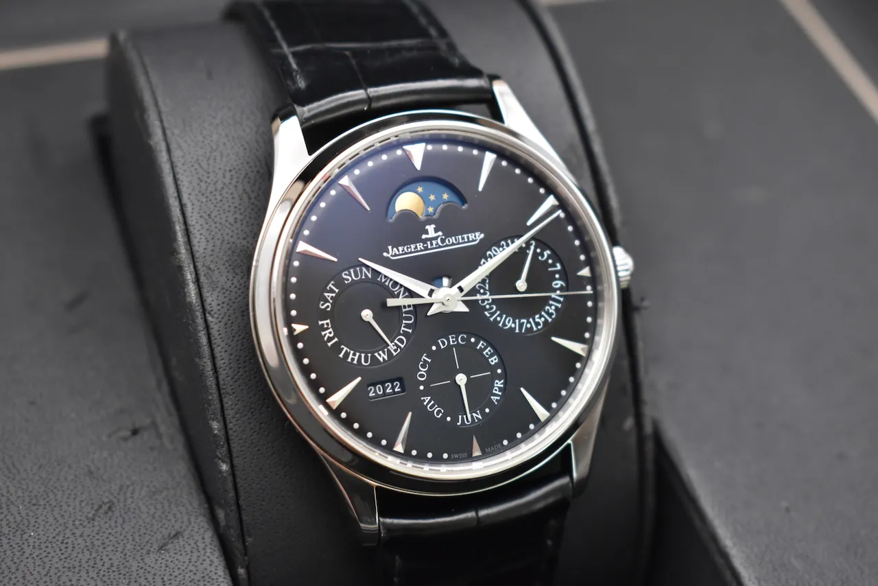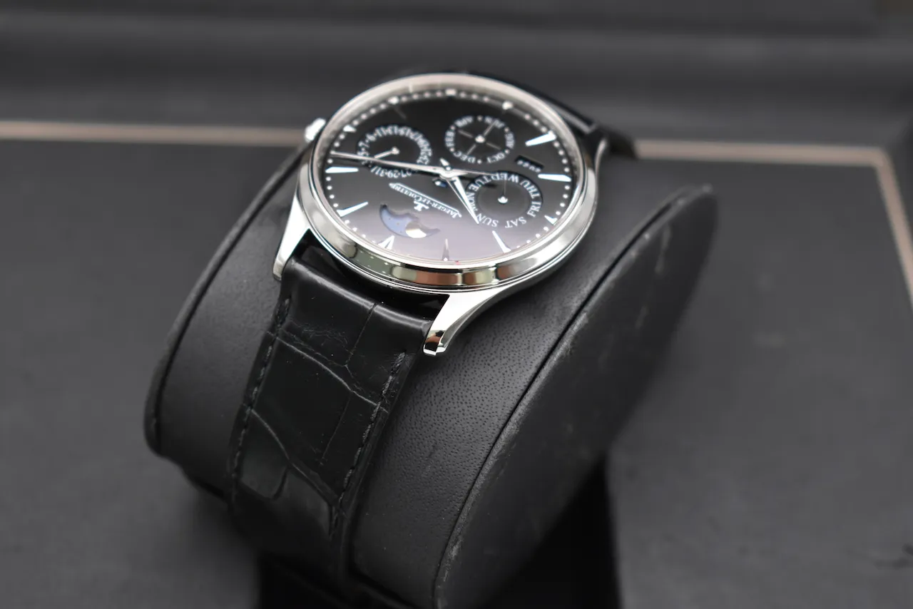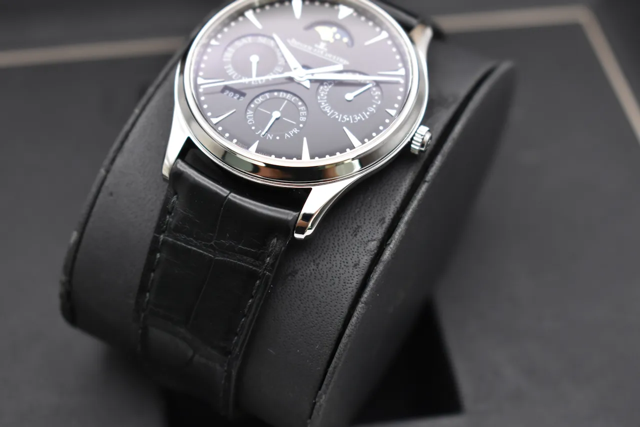 A true masterpiece of Swiss horology, this Jaeger-LeCoultre Master Ultra Thin Perpetual Calendar embodies elegance, technical excellence, and timeless design. Crafted for the discerning collector, this exceptional timepiece combines one of watchmaking’s most prestigious complications with an ultra-slim, sophisticated profile.This 2016 example, reference Q1308470, is presented in excellent condition and comes complete with its original box and papers, making it a highly desirable full set for both collectors and enthusiasts.Housed in a beautifully finished case, the watch features a clean and balanced dial displaying a perpetual calendar complication—automatically accounting for varying month lengths and leap years. The refined layout includes day, date, month, moonphase, and year indication, all designed with Jaeger-LeCoultre’s signature understated aesthetic.Powered by an in-house automatic movement, this model showcases the brand’s renowned craftsmanship and technical innovation, while maintaining an impressively slim profile that sits effortlessly under a cuff—perfect for both formal occasions and everyday luxury. Offered by Tempus Lord, a trusted luxury watch specialist based in Hatton Garden, London, this is a rare opportunity to acquire one of Jaeger-LeCoultre’s most iconic and technically impressive dress watches.