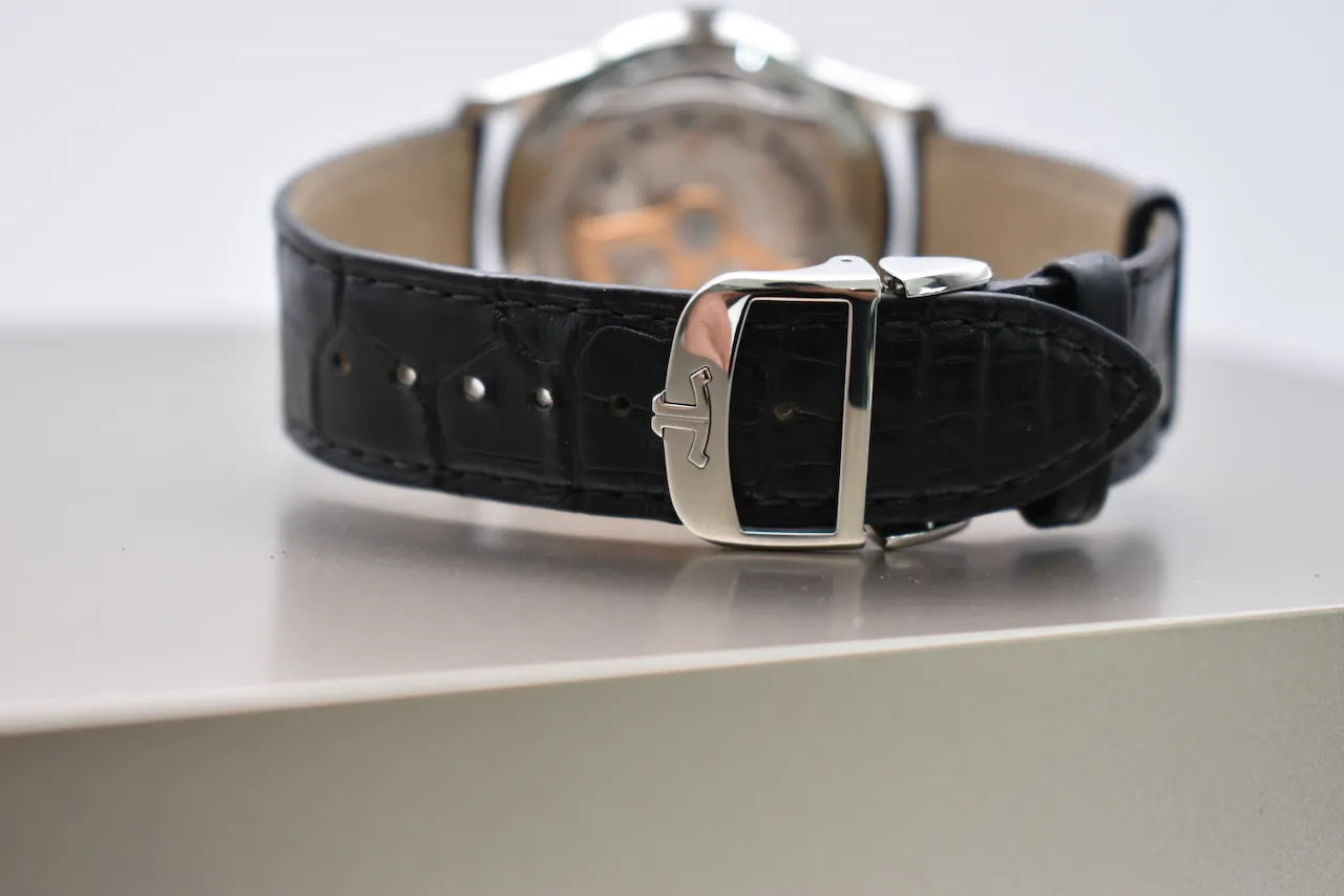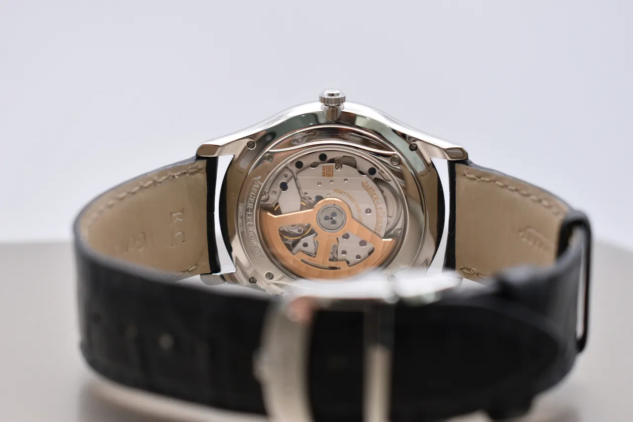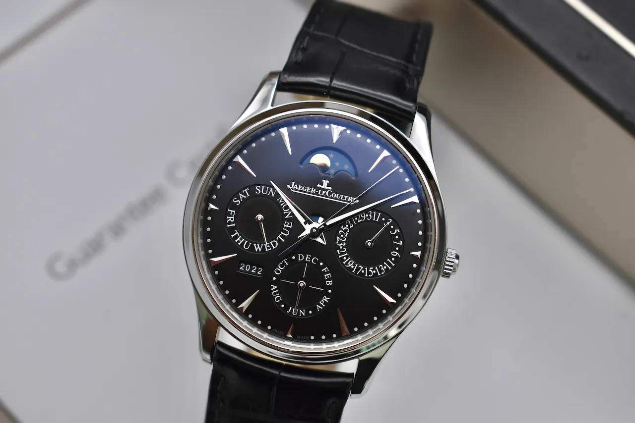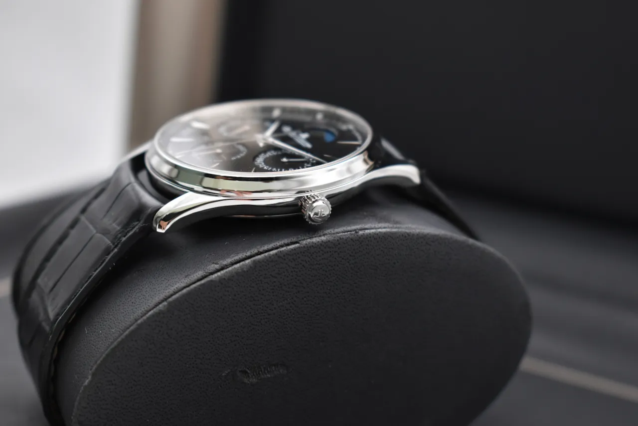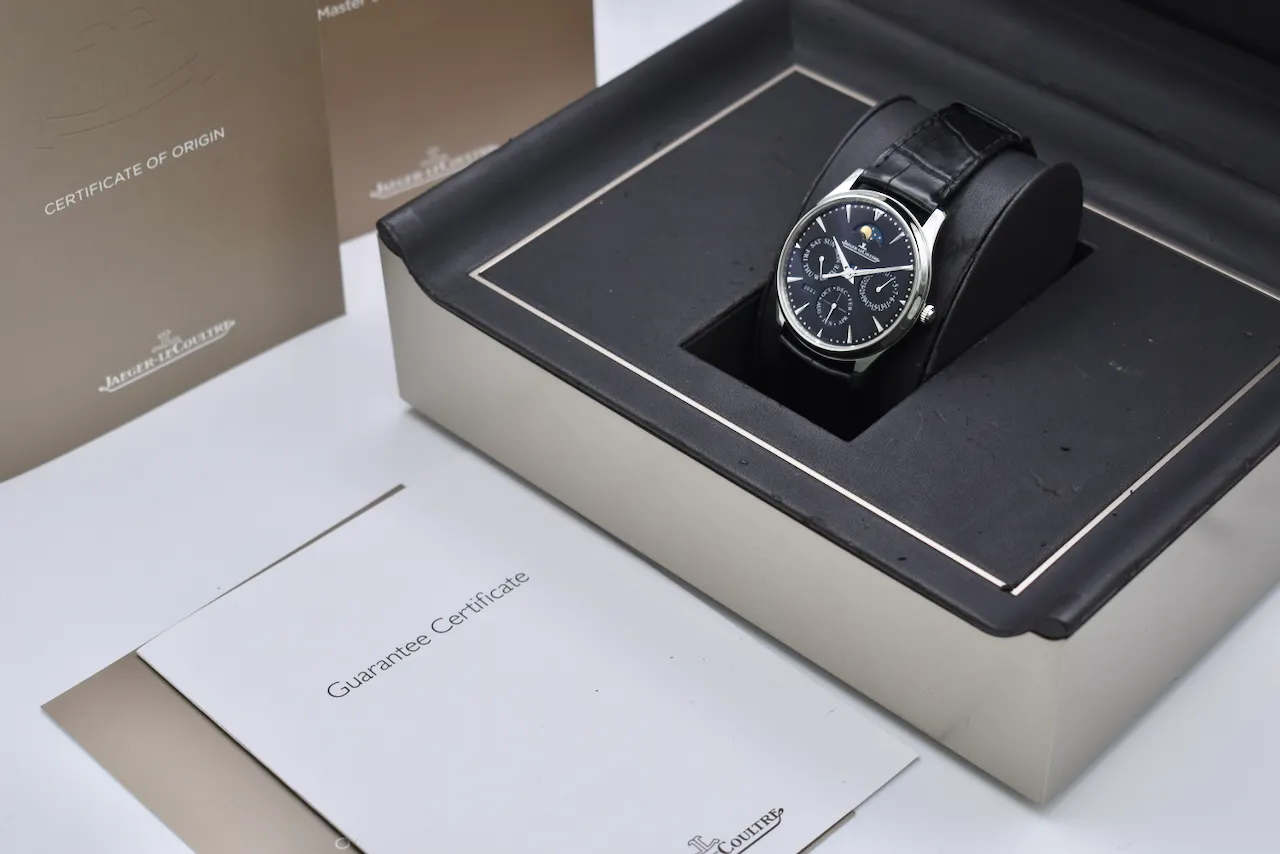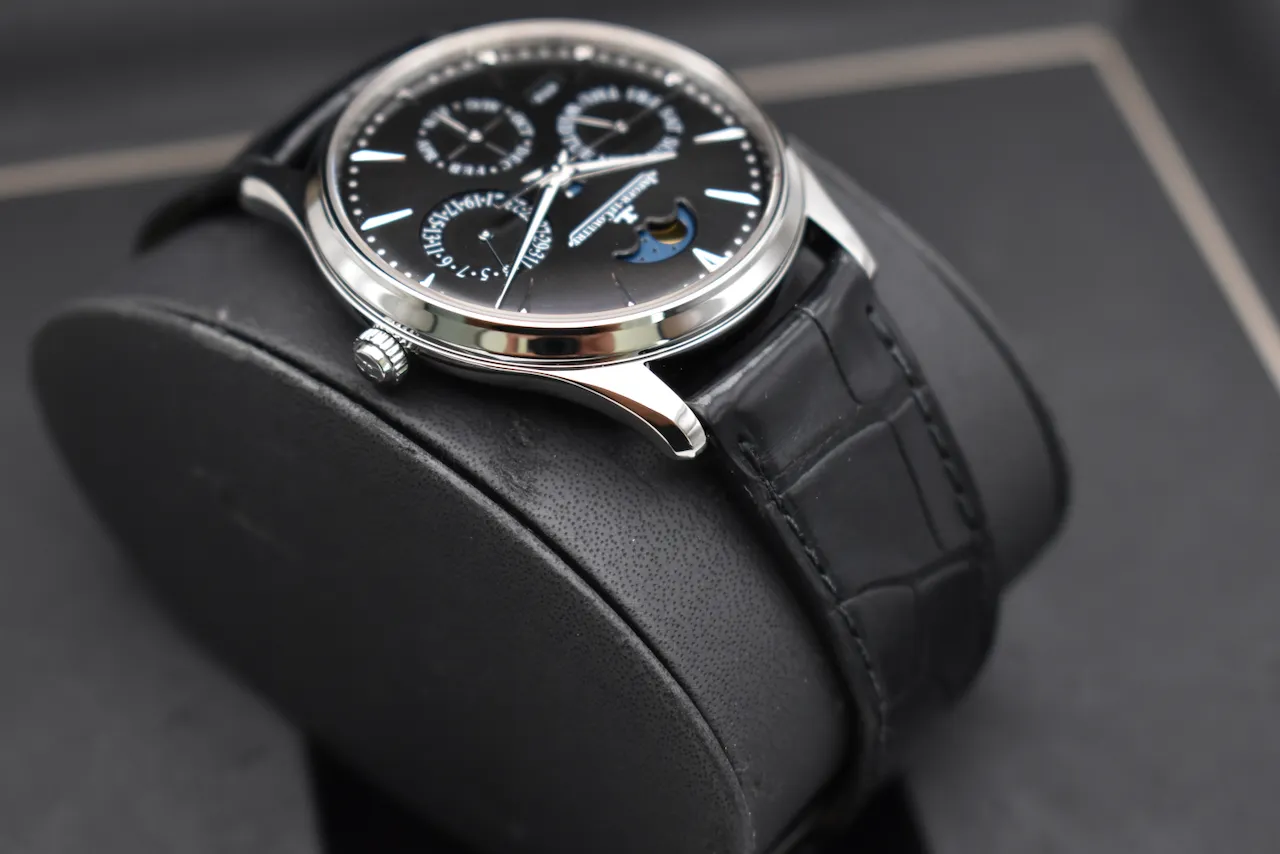 A true masterpiece of Swiss horology, this Jaeger-LeCoultre Master Ultra Thin Perpetual Calendar embodies elegance, technical excellence, and timeless design. Crafted for the discerning collector, this exceptional timepiece combines one of watchmaking’s most prestigious complications with an ultra-slim, sophisticated profile.This 2016 example, reference Q1308470, is presented in excellent condition and comes complete with its original box and papers, making it a highly desirable full set for both collectors and enthusiasts.Housed in a beautifully finished case, the watch features a clean and balanced dial displaying a perpetual calendar complication—automatically accounting for varying month lengths and leap years. The refined layout includes day, date, month, moonphase, and year indication, all designed with Jaeger-LeCoultre’s signature understated aesthetic.Powered by an in-house automatic movement, this model showcases the brand’s renowned craftsmanship and technical innovation, while maintaining an impressively slim profile that sits effortlessly under a cuff—perfect for both formal occasions and everyday luxury. Offered by Tempus Lord, a trusted luxury watch specialist based in Hatton Garden, London, this is a rare opportunity to acquire one of Jaeger-LeCoultre’s most iconic and technically impressive dress watches.
