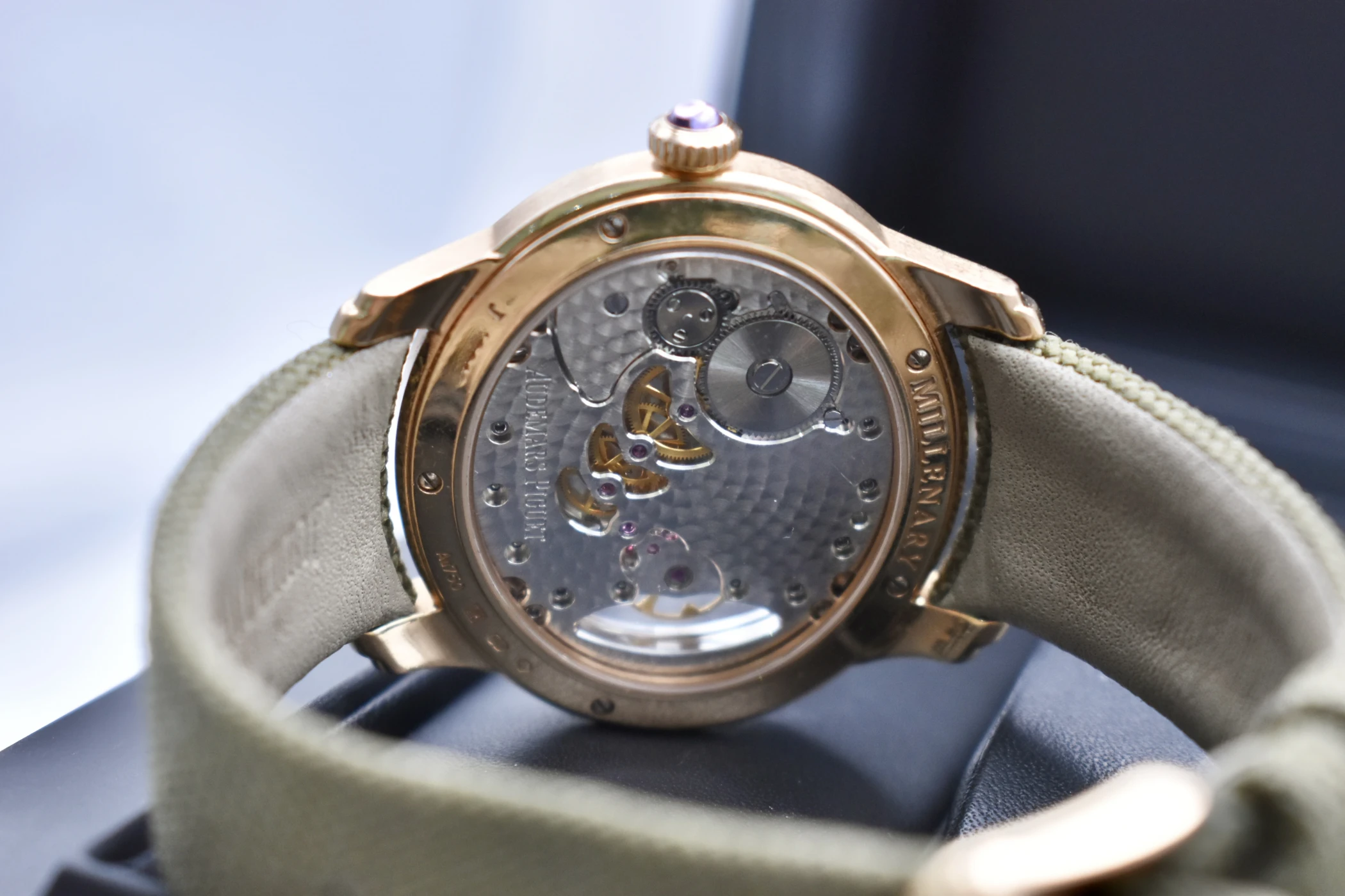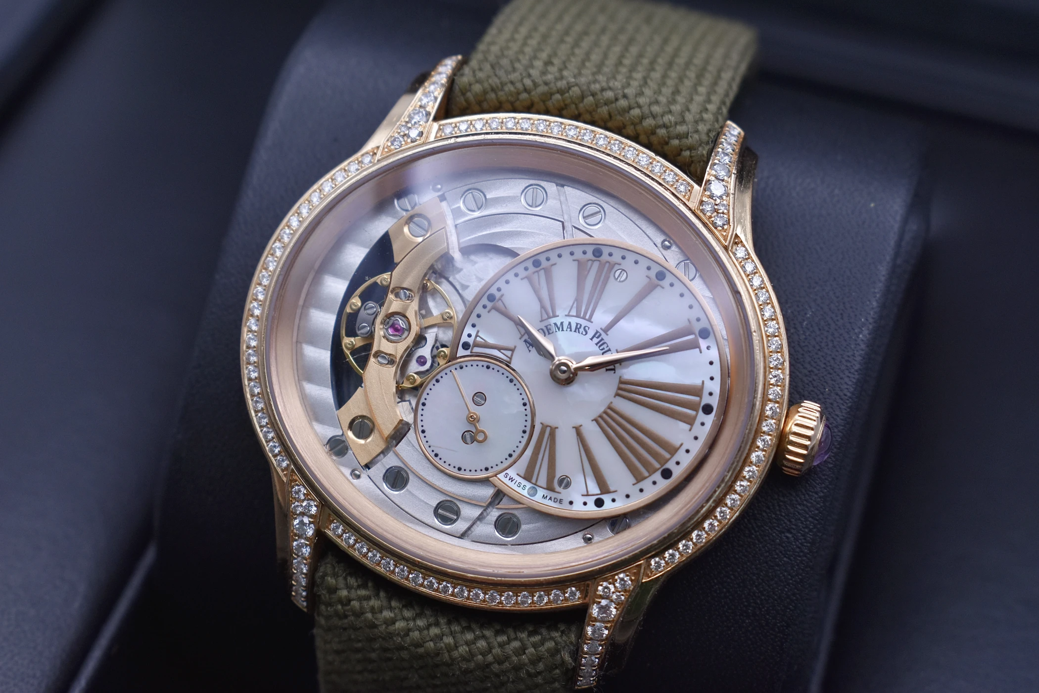 The Audemars Piguet Millenary 77247OR.ZZ.A812CR.01 is a masterpiece of haute horlogerie, blending 18K rose gold, a skeletonised movement, and a refined mother-of-pearl dial into a timepiece of unrivalled elegance. With its distinctive oval case, this ladies’ Audemars Piguet Millenary showcases the perfect balance between mechanical artistry and high jewellery design.Set with dazzling brilliant-cut diamonds on the bezel and lugs, the watch radiates sophistication while revealing its openworked movement, allowing you to admire the precision of Swiss craftsmanship. The combination of rose gold, mother of pearl, and skeleton dial makes this Millenary not just a watch, but a wearable work of art.