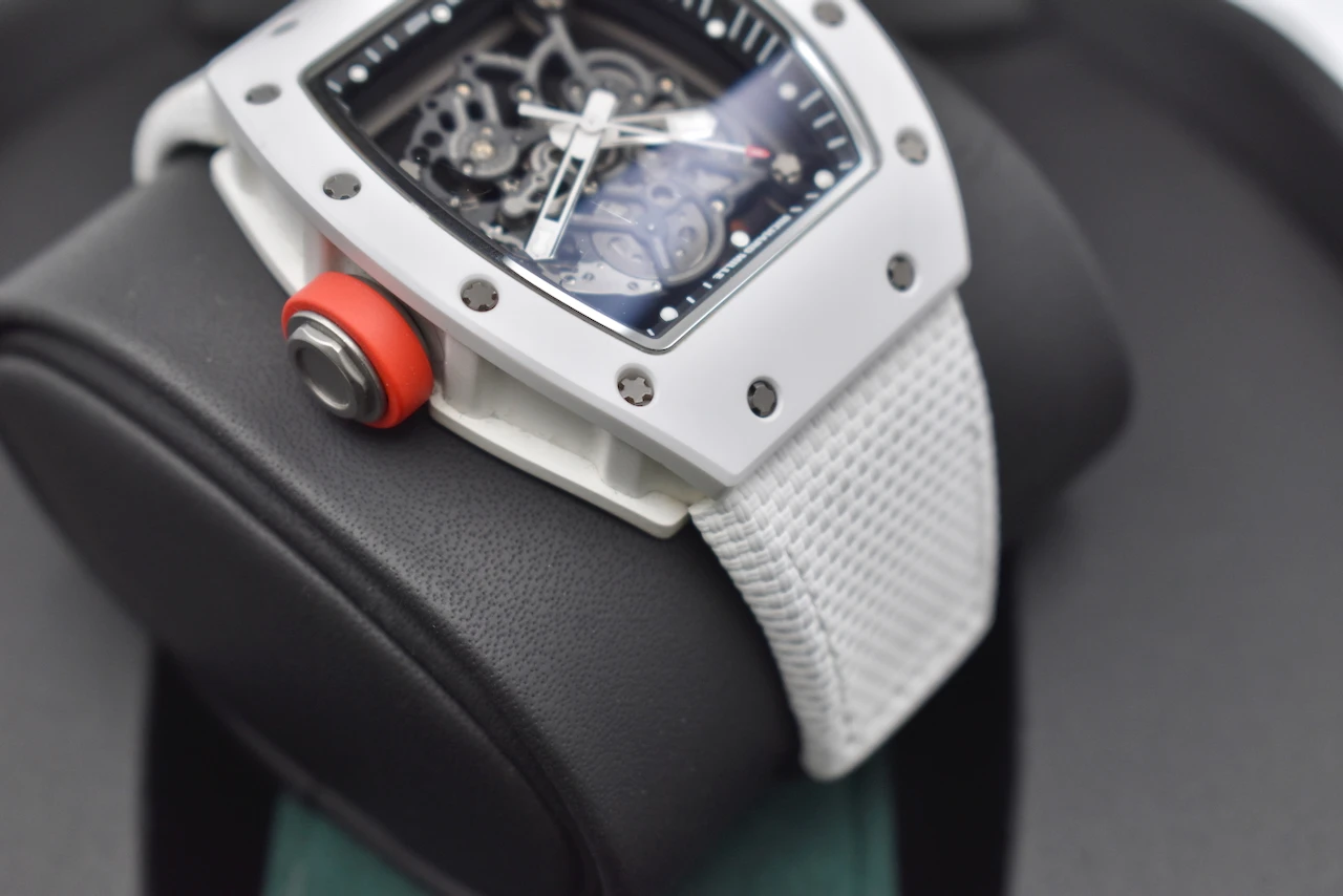 The Richard Mille RM055 Bubba Watson is a masterpiece of contemporary haute horlogerie, designed for performance, innovation, and prestige. Created in collaboration with professional golfer Bubba Watson, this model is the embodiment of Richard Mille’s philosophy of extreme technical precision and avant-garde design.The RM055 features a skeletonised manual-winding movement, crafted with titanium and ceramic for exceptional durability and ultra-light comfort. Its striking white ATZ ceramic case, contrasted with a titanium caseband and transparent sapphire elements, showcases the intricate movement within. With shock resistance built to withstand the impact of professional sports, the RM055 is not just a watch — it is a cutting-edge piece of Swiss engineering.This timepiece exemplifies Richard Mille’s commitment to innovation, exclusivity, and uncompromising quality. As a limited production model, the RM055 Bubba Watson is highly sought after by collectors worldwide, making it both a luxury lifestyle statement and an investment-grade timepiece.