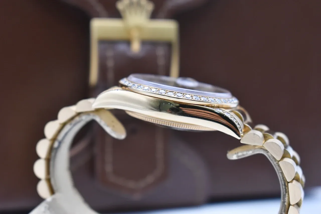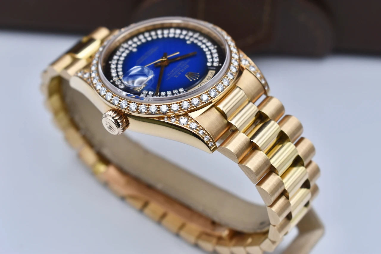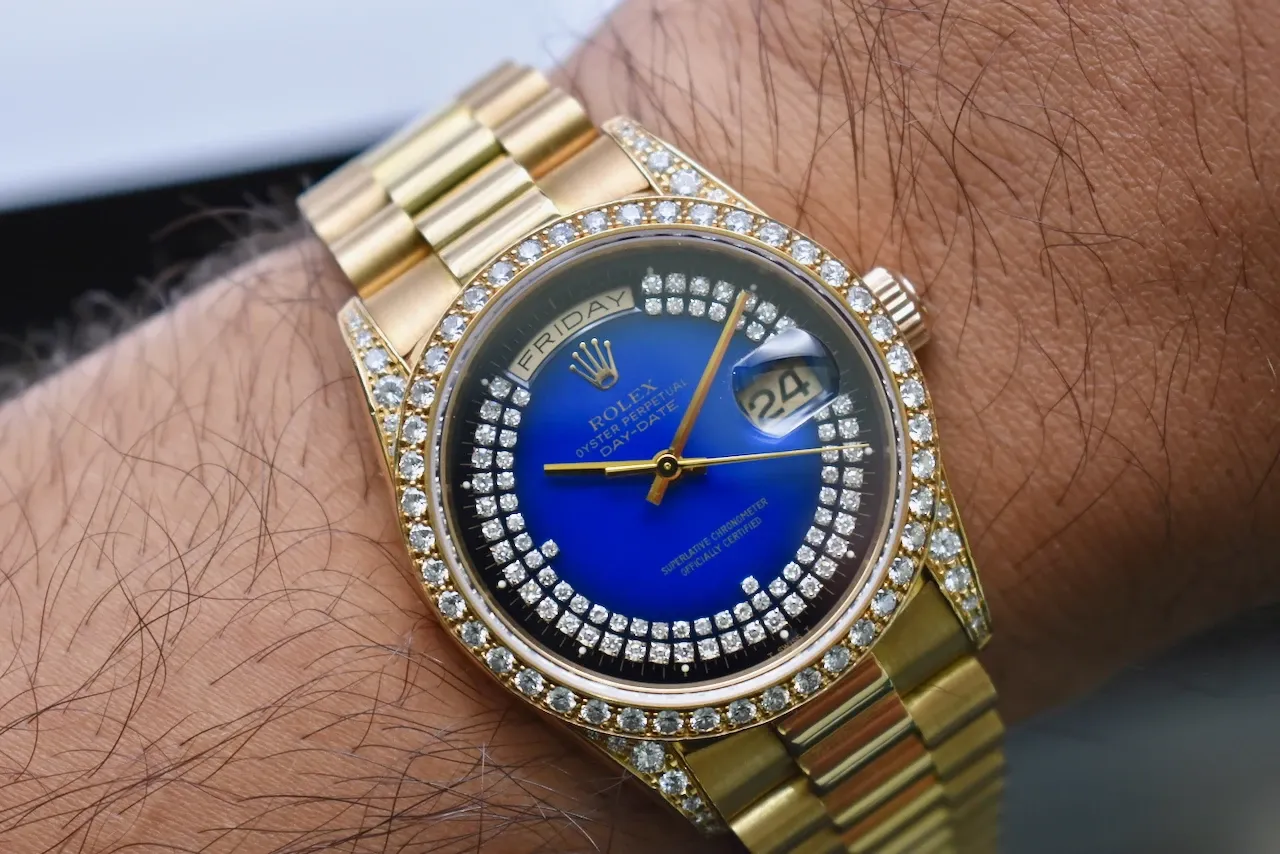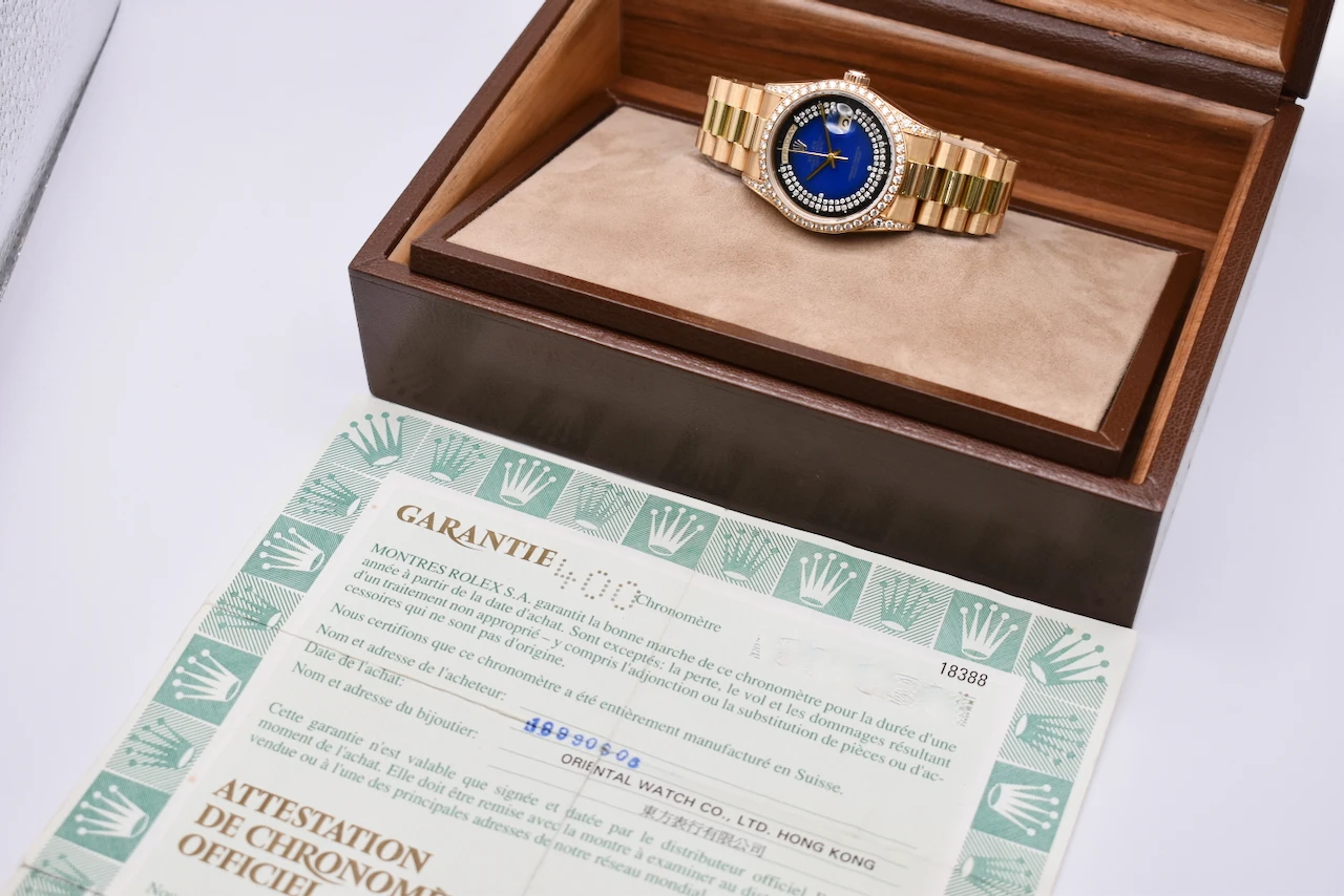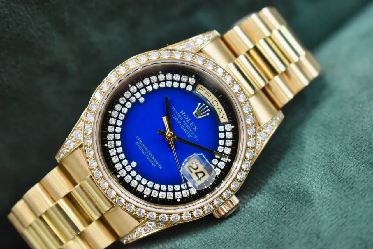 Experience the timeless prestige of Rolex with this exquisite Rolex Day-Date 36mm Ref. 18388, crafted in 18k yellow gold and adorned with a rare blue double-string diamond dial. Combining flawless craftsmanship and classic design, this remarkable Rolex Day-Date President stands as a true symbol of power, sophistication, and luxury.The Rolex Day-Date—often known as the “President’s Watch”—is celebrated for its legacy of excellence and precision. The Ref. 18388 is among the most sought-after variations, featuring a factory-set diamond bezel, brilliant-cut diamond hour markers, and the distinctive double-string diamond dial that adds striking depth and brilliance. With its solid 18k yellow gold case and President bracelet, this timepiece embodies the enduring craftsmanship of Swiss luxury watchmaking.
