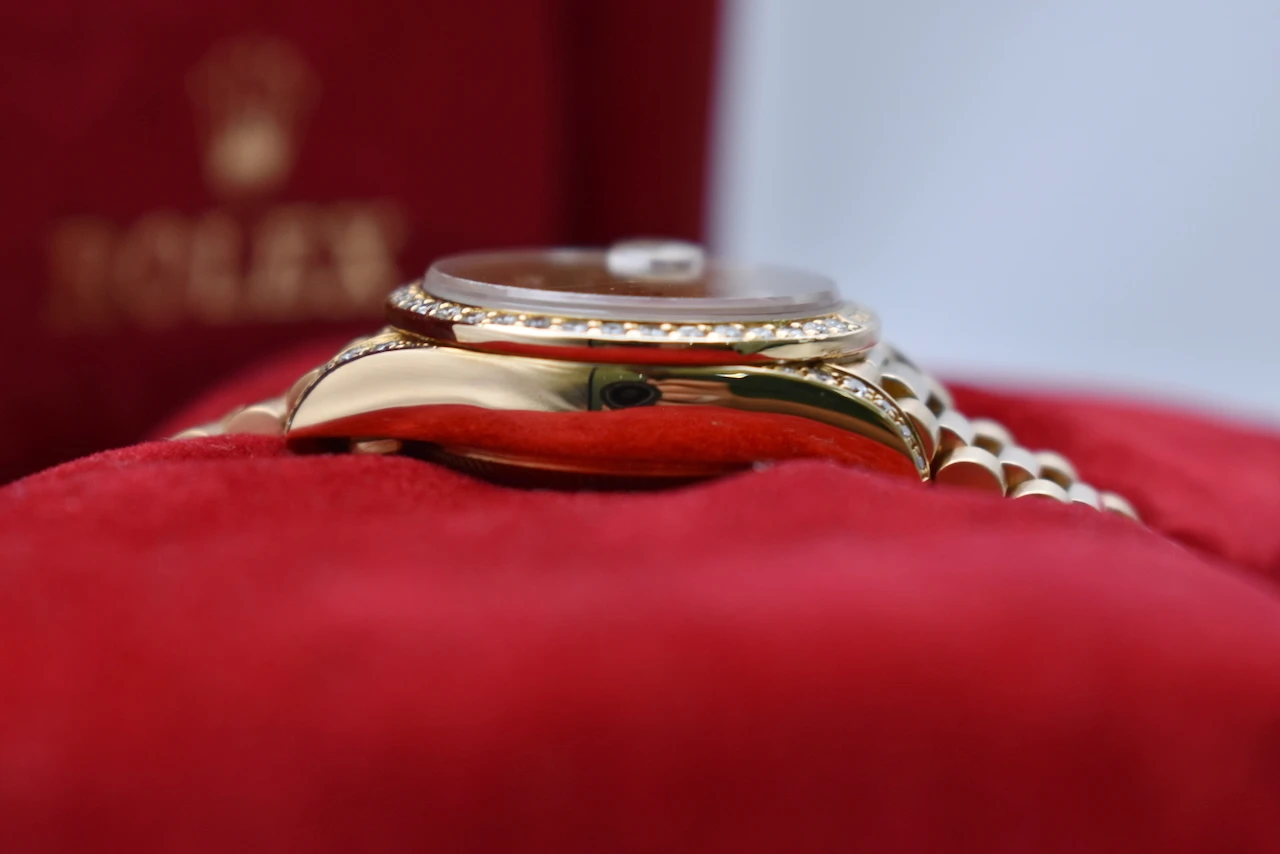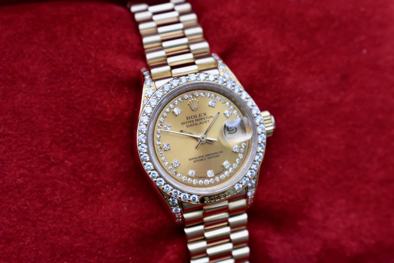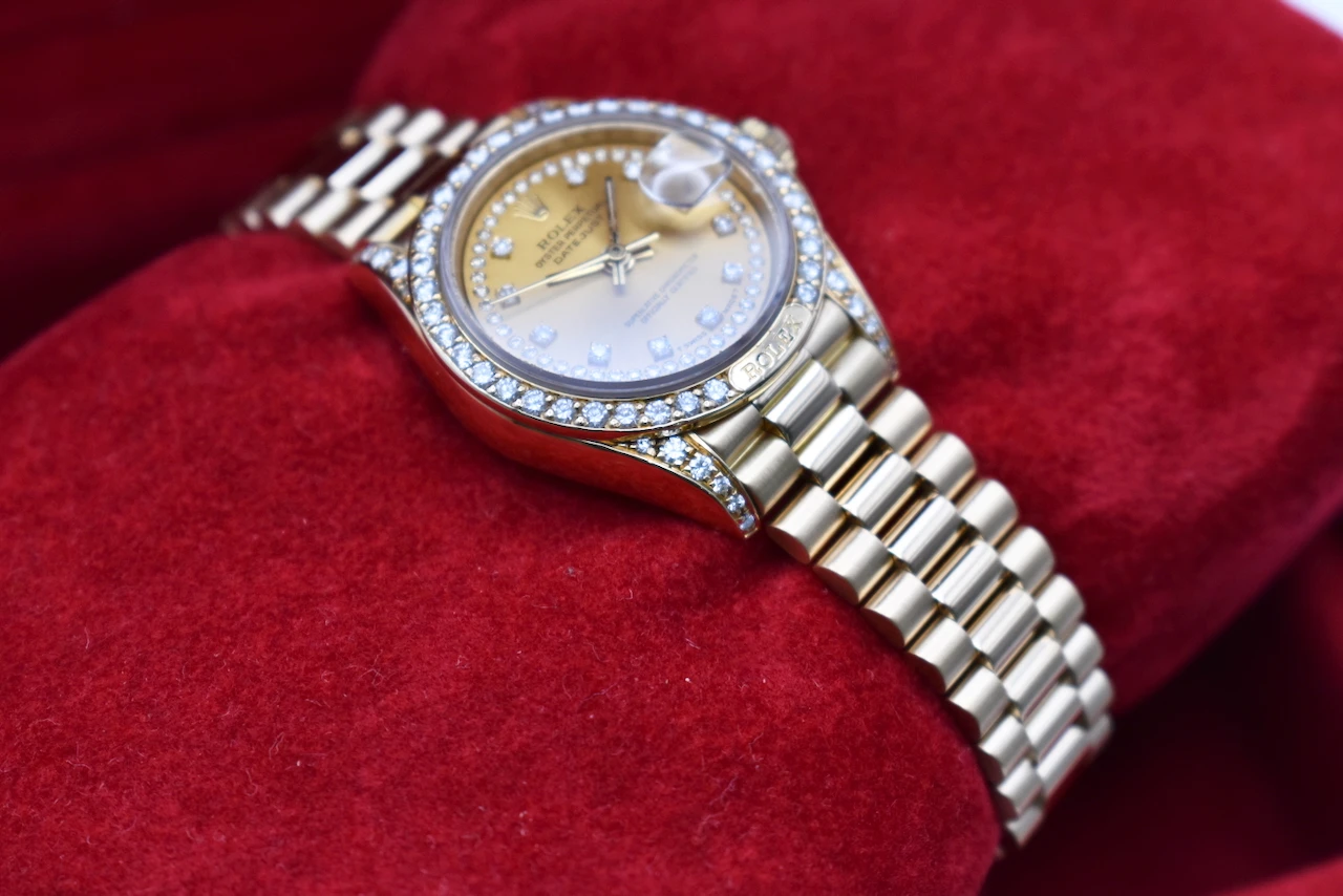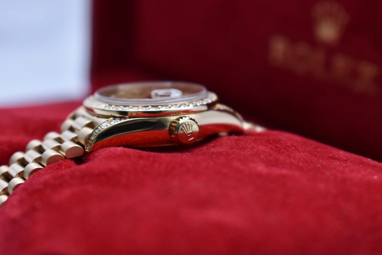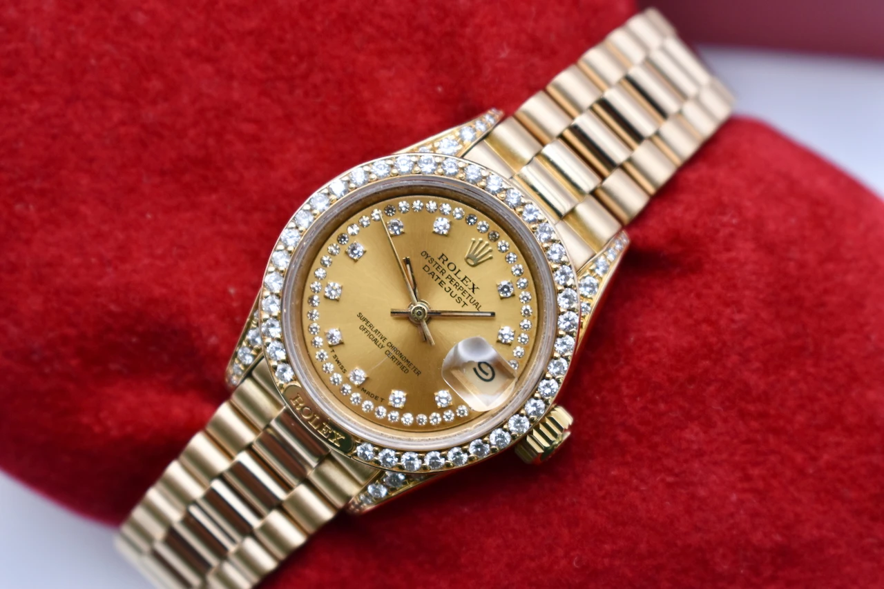 Experience one of the most captivating expressions of Rolex craftsmanship with this Rolex 18k Yellow Gold Datejust 69158, a reference celebrated for its elegance, rarity, and unmistakable presence. This exceptional ladies’ timepiece blends meticulous artistry with the enduring prestige of solid 18k yellow gold, creating a watch that truly stands apart.The highlight of this iconic model is its Diamond String Dial — an exquisite arrangement of individually set diamonds that form a delicate, flowing pattern across the dial. Every stone has been selected for clarity and brilliance, giving the watch an effortless sparkle under any light. Paired with a factory diamond-set bezel, the result is a display of sophistication that is both refined and undeniably luxurious.Crafted with Rolex’s renowned attention to detail, the 69158 is fitted with the solid 18k yellow gold President-style bracelet, offering exceptional comfort and a commanding presence on the wrist. This model is powered by Rolex’s reliable automatic movement, delivering the precision, durability, and timeless engineering the brand is known for.This is more than a watch — it is a statement piece, a jewellery-grade timepiece for the woman who appreciates rarity, craftsmanship, and status. The Rolex 69158 is increasingly sought after by collectors worldwide due to its limited availability and distinctive diamond configuration.This example is offered by Tempus Lord, trusted luxury watch specialists based in Hatton Garden, London’s historic jewellery district. Fully authenticated and inspected, this Rolex is ready to be cherished for decades to come.