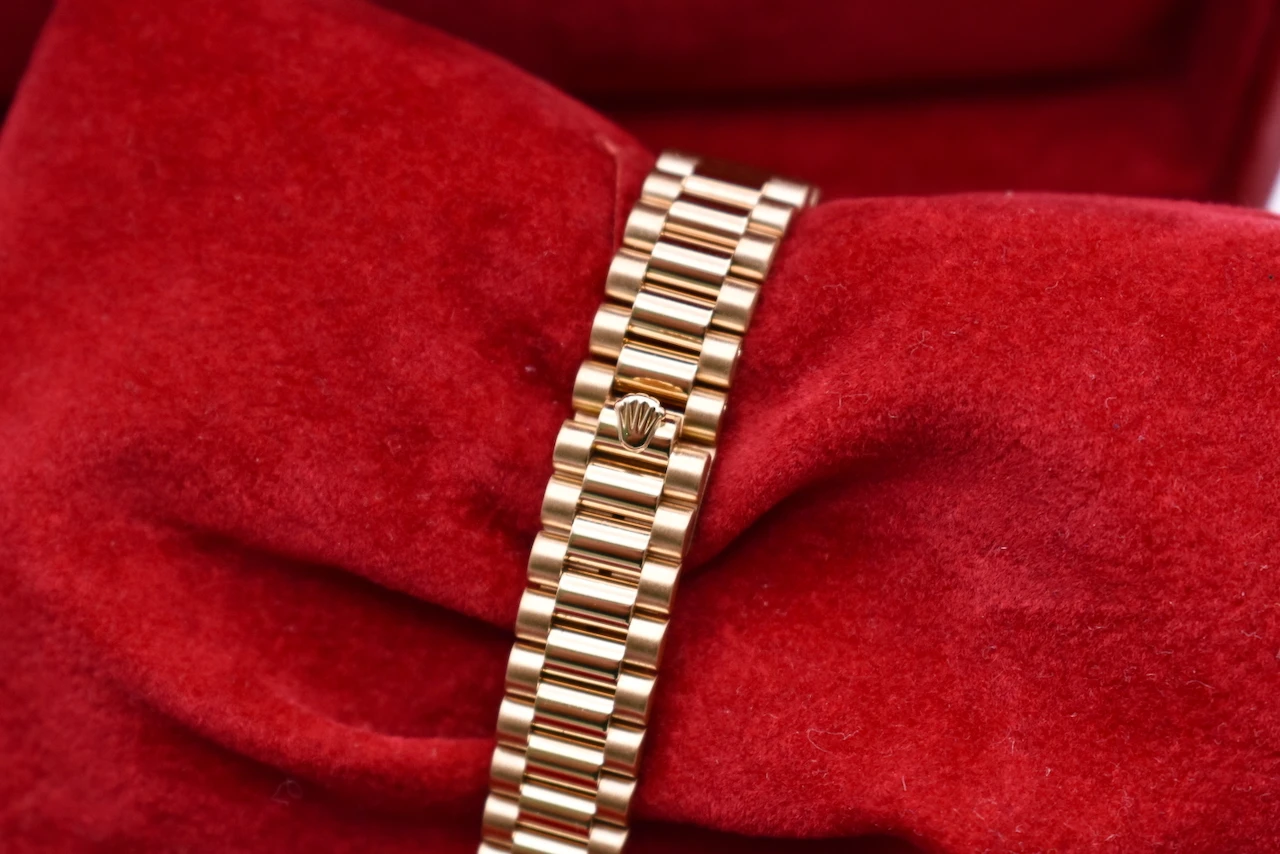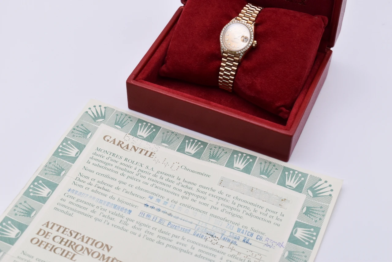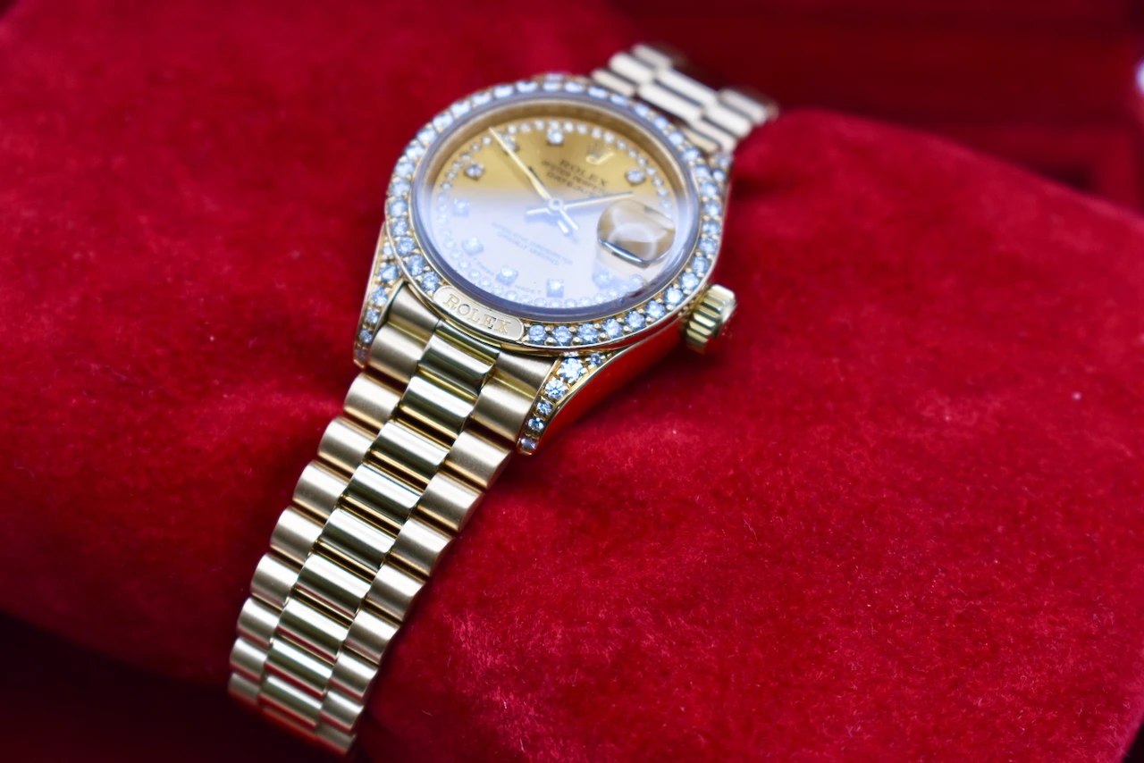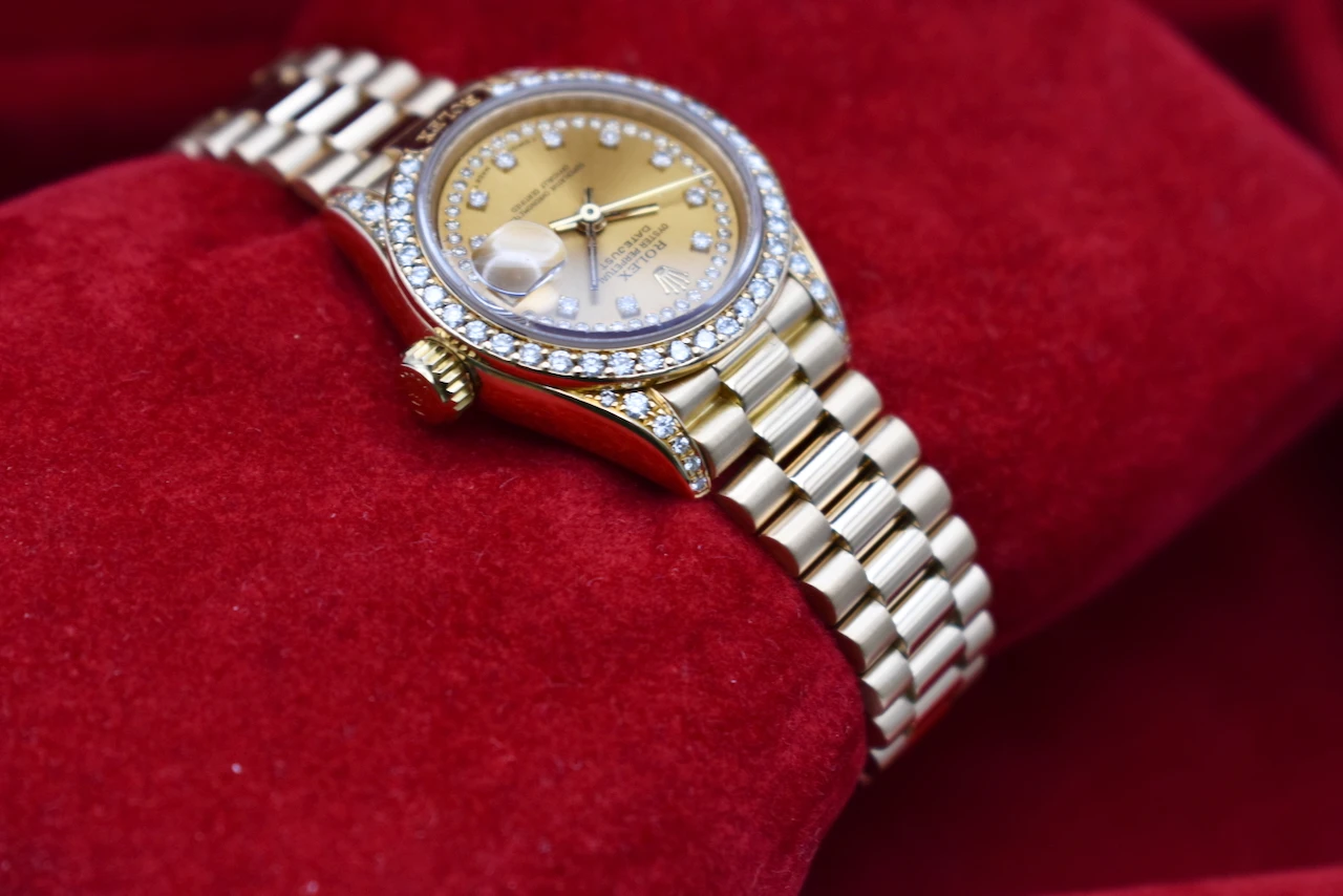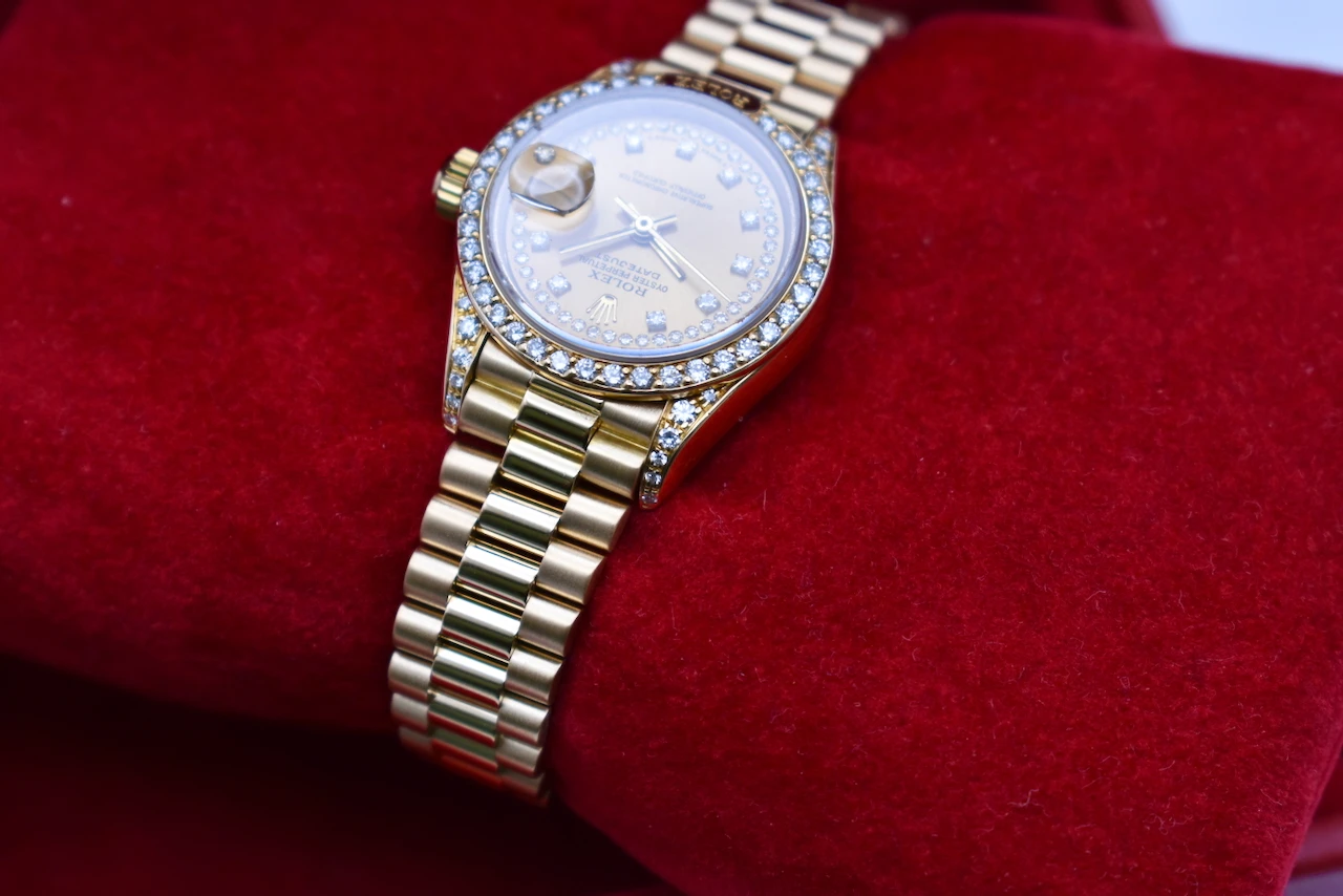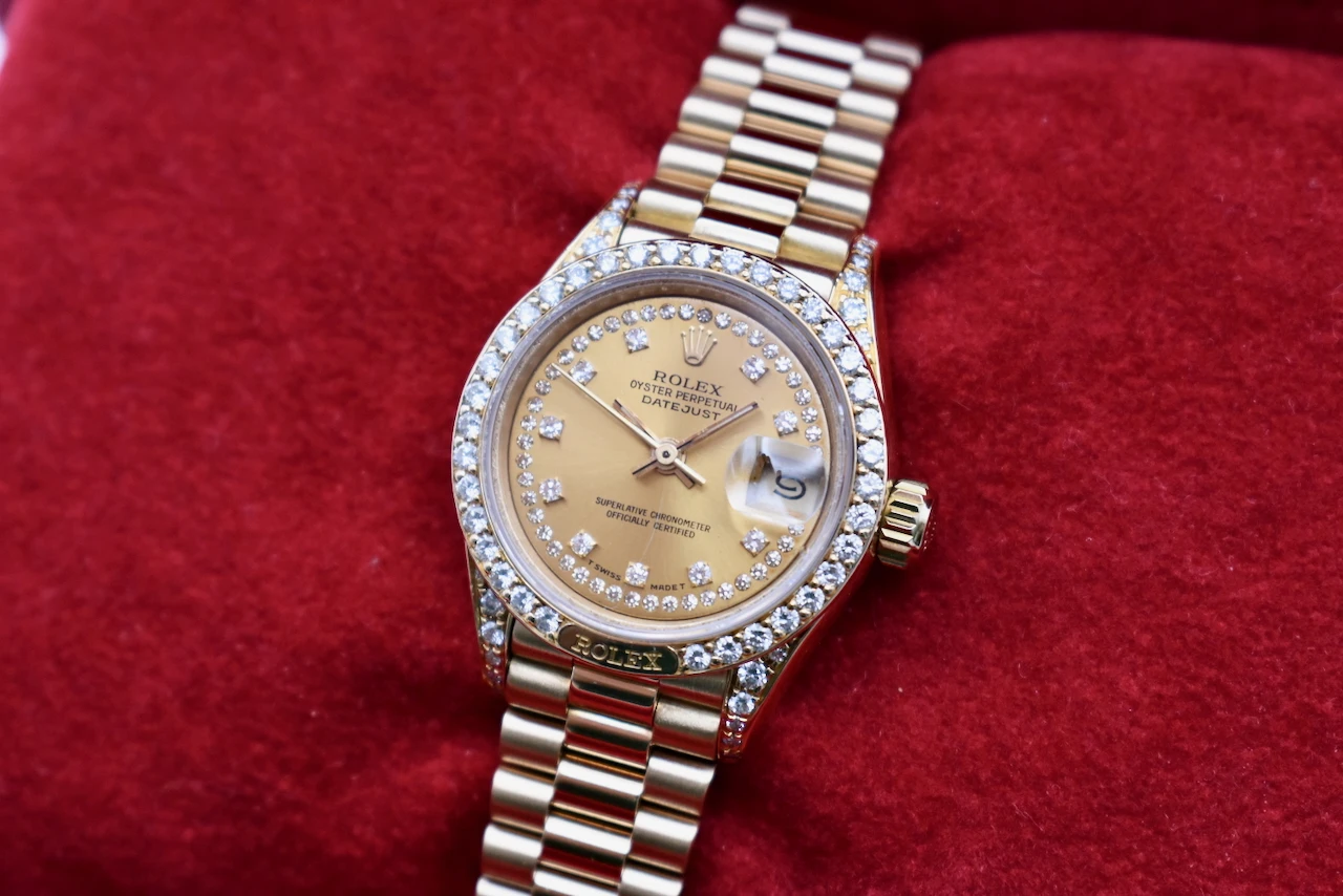 Experience one of the most captivating expressions of Rolex craftsmanship with this Rolex 18k Yellow Gold Datejust 69158, a reference celebrated for its elegance, rarity, and unmistakable presence. This exceptional ladies’ timepiece blends meticulous artistry with the enduring prestige of solid 18k yellow gold, creating a watch that truly stands apart.The highlight of this iconic model is its Diamond String Dial — an exquisite arrangement of individually set diamonds that form a delicate, flowing pattern across the dial. Every stone has been selected for clarity and brilliance, giving the watch an effortless sparkle under any light. Paired with a factory diamond-set bezel, the result is a display of sophistication that is both refined and undeniably luxurious.Crafted with Rolex’s renowned attention to detail, the 69158 is fitted with the solid 18k yellow gold President-style bracelet, offering exceptional comfort and a commanding presence on the wrist. This model is powered by Rolex’s reliable automatic movement, delivering the precision, durability, and timeless engineering the brand is known for.This is more than a watch — it is a statement piece, a jewellery-grade timepiece for the woman who appreciates rarity, craftsmanship, and status. The Rolex 69158 is increasingly sought after by collectors worldwide due to its limited availability and distinctive diamond configuration.This example is offered by Tempus Lord, trusted luxury watch specialists based in Hatton Garden, London’s historic jewellery district. Fully authenticated and inspected, this Rolex is ready to be cherished for decades to come.