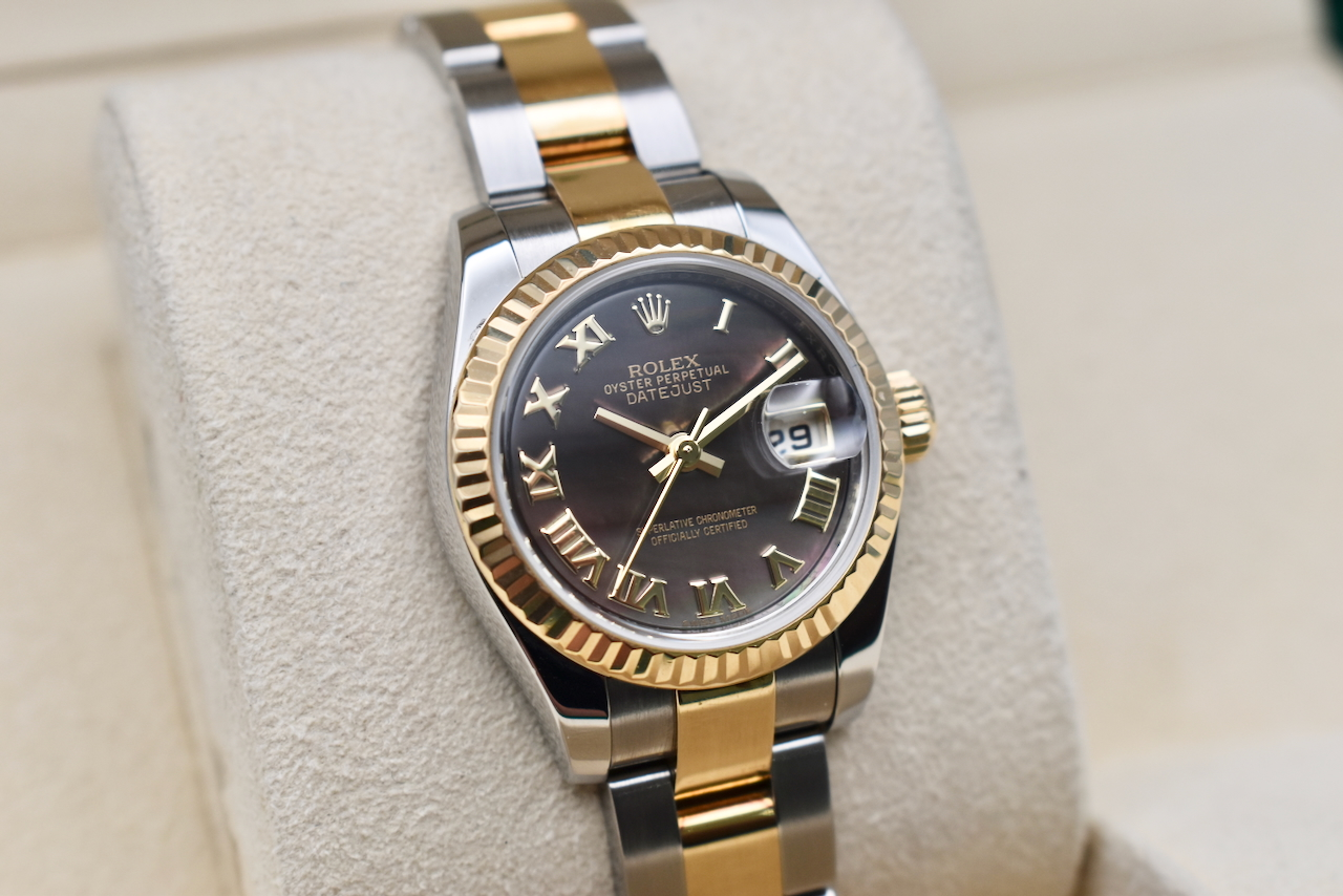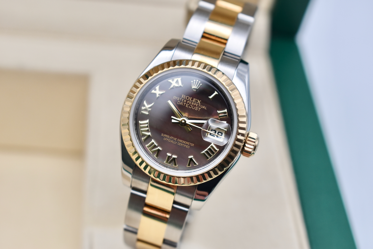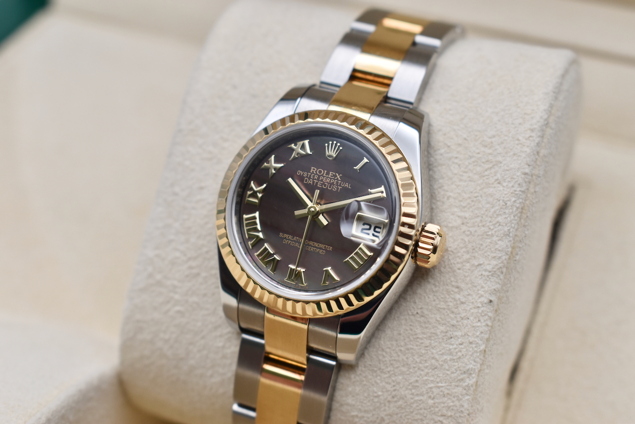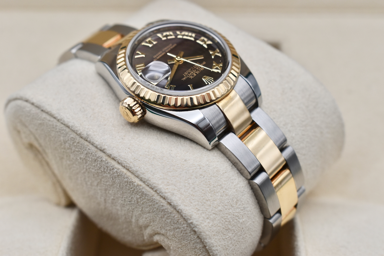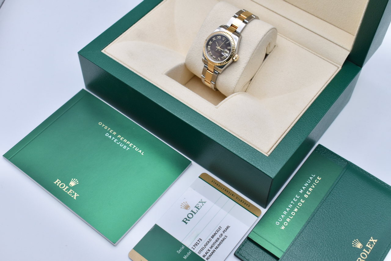 This exquisite Rolex Datejust 26mm Ladies Watch, reference 179173, is a timeless expression of elegance and luxury. Featuring a stunning black Tahitian mother of pearl dial, the watch displays beautiful natural iridescence, ensuring every dial is completely unique. The classic date display at 3 o’clock, magnified by Rolex’s iconic Cyclops lens, enhances both functionality and sophistication.Crafted from stainless steel and 18ct yellow gold, this two-tone Datejust is fitted with a Rolex Oyster bracelet, offering exceptional comfort, durability, and a refined aesthetic suitable for both everyday wear and formal occasions. The watch is completed with a yellow gold fluted bezel, a signature Rolex design element that adds timeless appeal.This watch is presented in excellent condition and has been meticulously maintained. It is supplied with original Rolex box and papers, making it an ideal choice for those seeking a truly special luxury timepiece.Offered by Tempus Lord, trusted luxury watch specialists based in Hatton Garden, London, this Rolex Datejust is guaranteed authentic and ready to wear.A classic ladies Rolex that combines heritage, beauty, and long-term value.