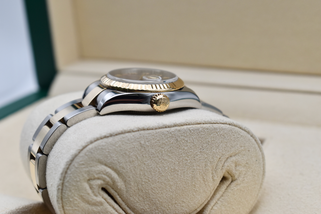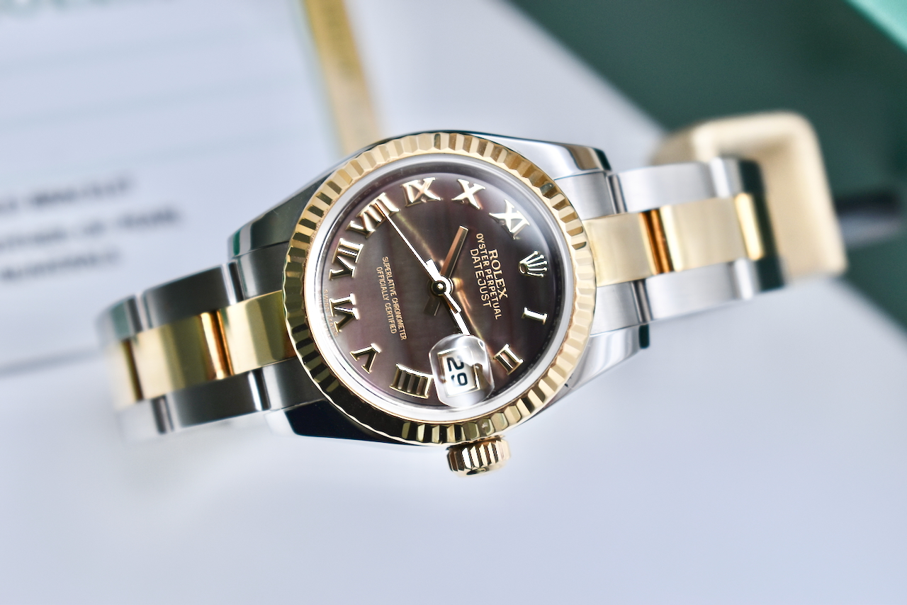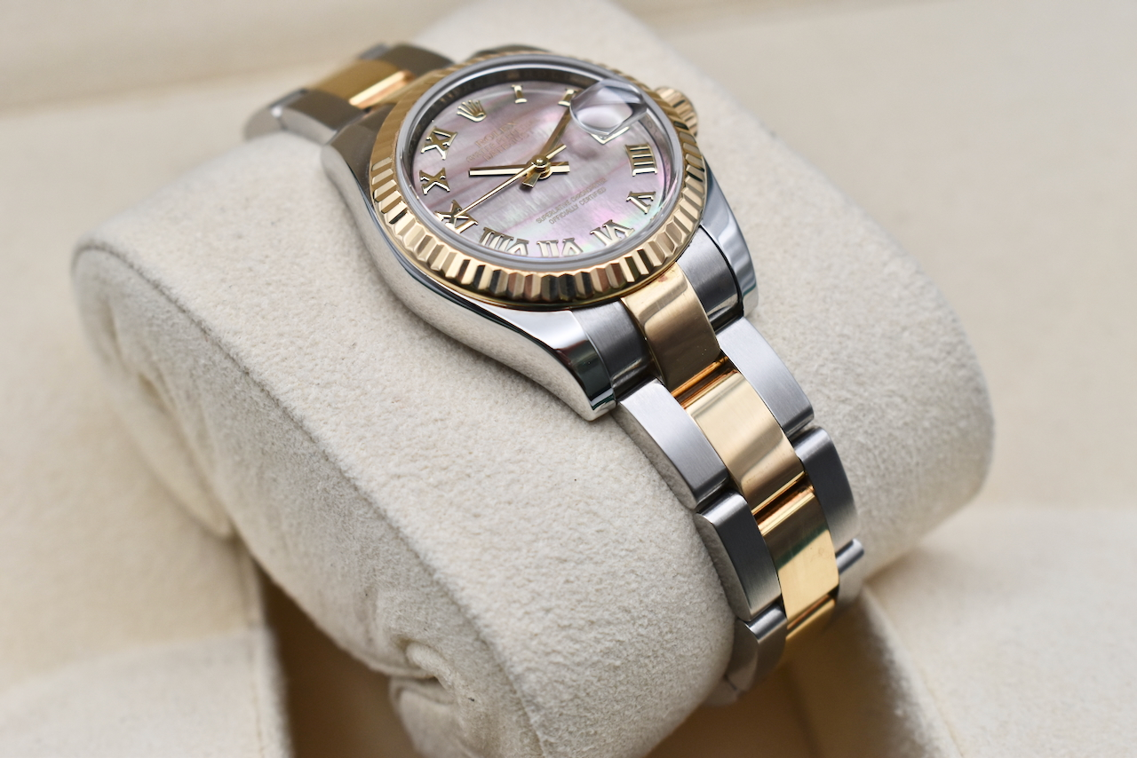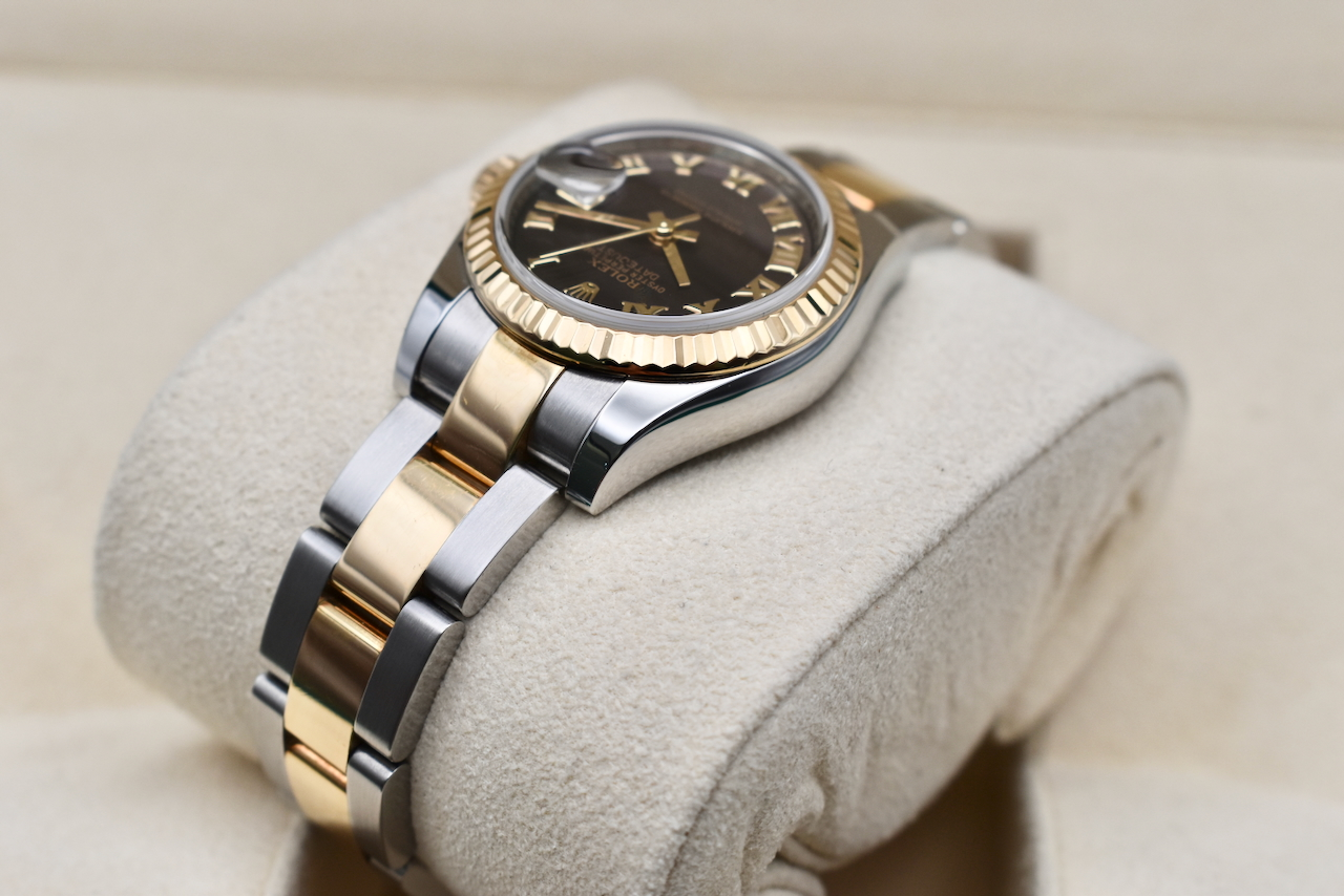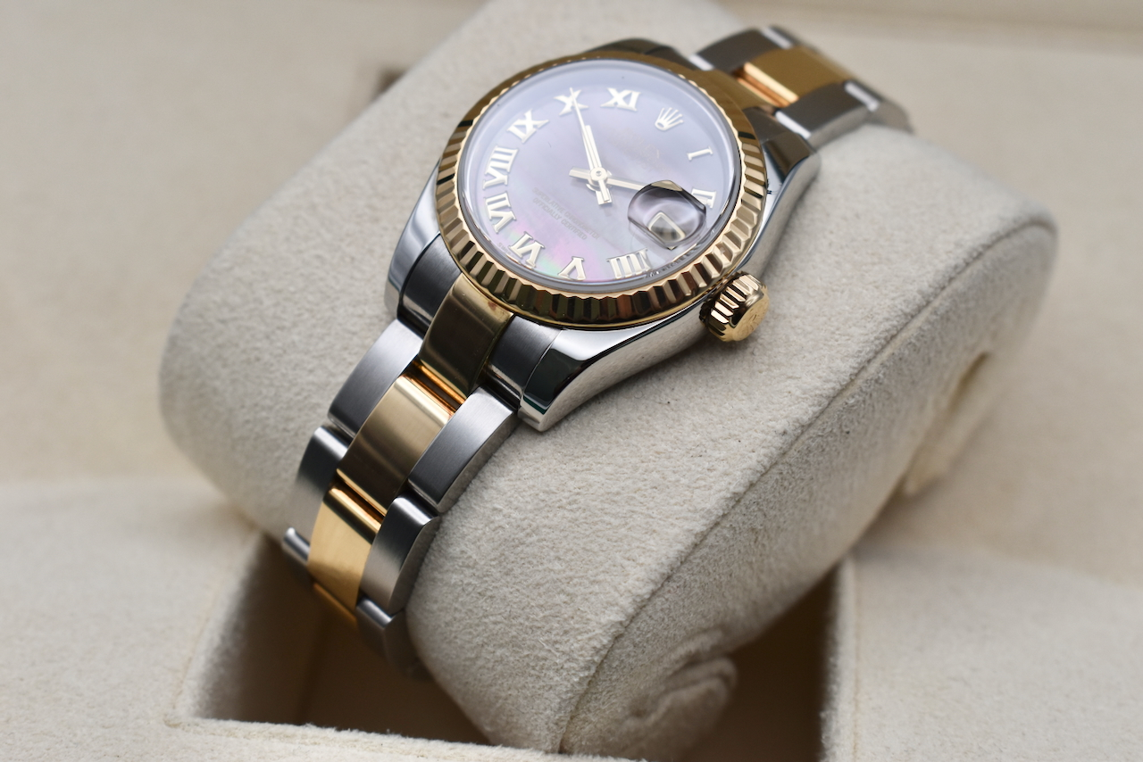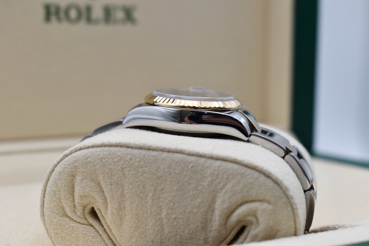 This exquisite Rolex Datejust 26mm Ladies Watch, reference 179173, is a timeless expression of elegance and luxury. Featuring a stunning black Tahitian mother of pearl dial, the watch displays beautiful natural iridescence, ensuring every dial is completely unique. The classic date display at 3 o’clock, magnified by Rolex’s iconic Cyclops lens, enhances both functionality and sophistication.Crafted from stainless steel and 18ct yellow gold, this two-tone Datejust is fitted with a Rolex Oyster bracelet, offering exceptional comfort, durability, and a refined aesthetic suitable for both everyday wear and formal occasions. The watch is completed with a yellow gold fluted bezel, a signature Rolex design element that adds timeless appeal.This watch is presented in excellent condition and has been meticulously maintained. It is supplied with original Rolex box and papers, making it an ideal choice for those seeking a truly special luxury timepiece.Offered by Tempus Lord, trusted luxury watch specialists based in Hatton Garden, London, this Rolex Datejust is guaranteed authentic and ready to wear.A classic ladies Rolex that combines heritage, beauty, and long-term value.