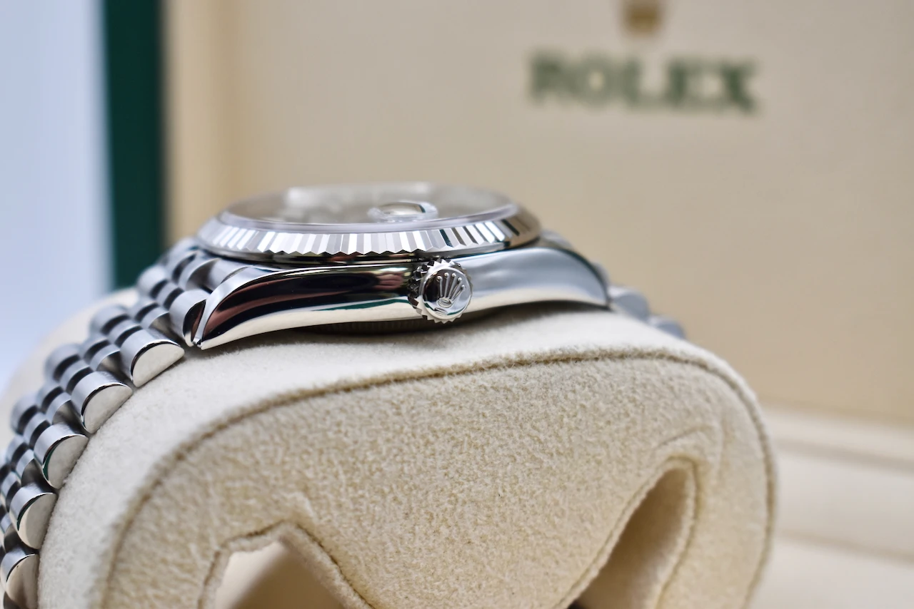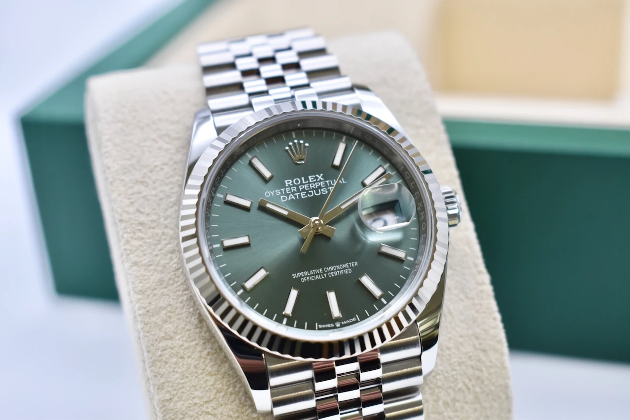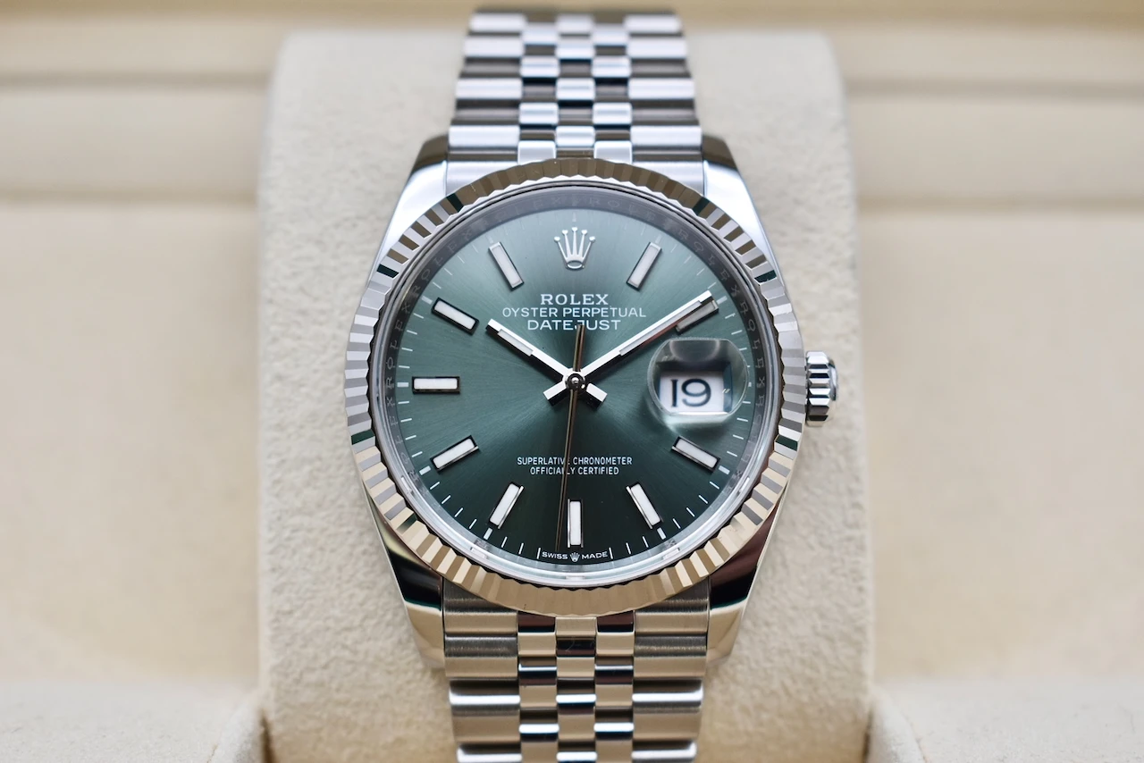 The Rolex Datejust 36 Stainless Steel Mint Green (Ref. 126234) is a modern classic that perfectly balances timeless Rolex heritage with contemporary elegance. This example features the highly sought-after mint green dial, a fresh and refined colour that catches the light beautifully and has become one of the most desirable Datejust configurations in recent years.Crafted from Rolex’s signature Oystersteel, the 36mm case is complemented by a white gold fluted bezel and paired with the iconic Jubilee bracelet, offering exceptional comfort and unmistakable sophistication. Powered by Rolex’s in-house automatic movement, this watch delivers outstanding precision, reliability, and everyday wearability.This particular piece is unworn, dated 2025, and is presented in brand-new condition. It comes complete with its original Rolex box and papers, making it an ideal choice for both collectors and those seeking a flawless first luxury timepiece.Offered for sale by Tempus Lord, a trusted independent luxury watch specialist based in Hatton Garden, London, this Rolex Datejust 36 represents a rare opportunity to acquire a pristine example of one of Rolex’s most iconic models with full provenance and peace of mind.A perfect blend of elegance, investment potential, and everyday luxury — the Rolex Datejust 36 Mint Green is a watch that will never go out of style.