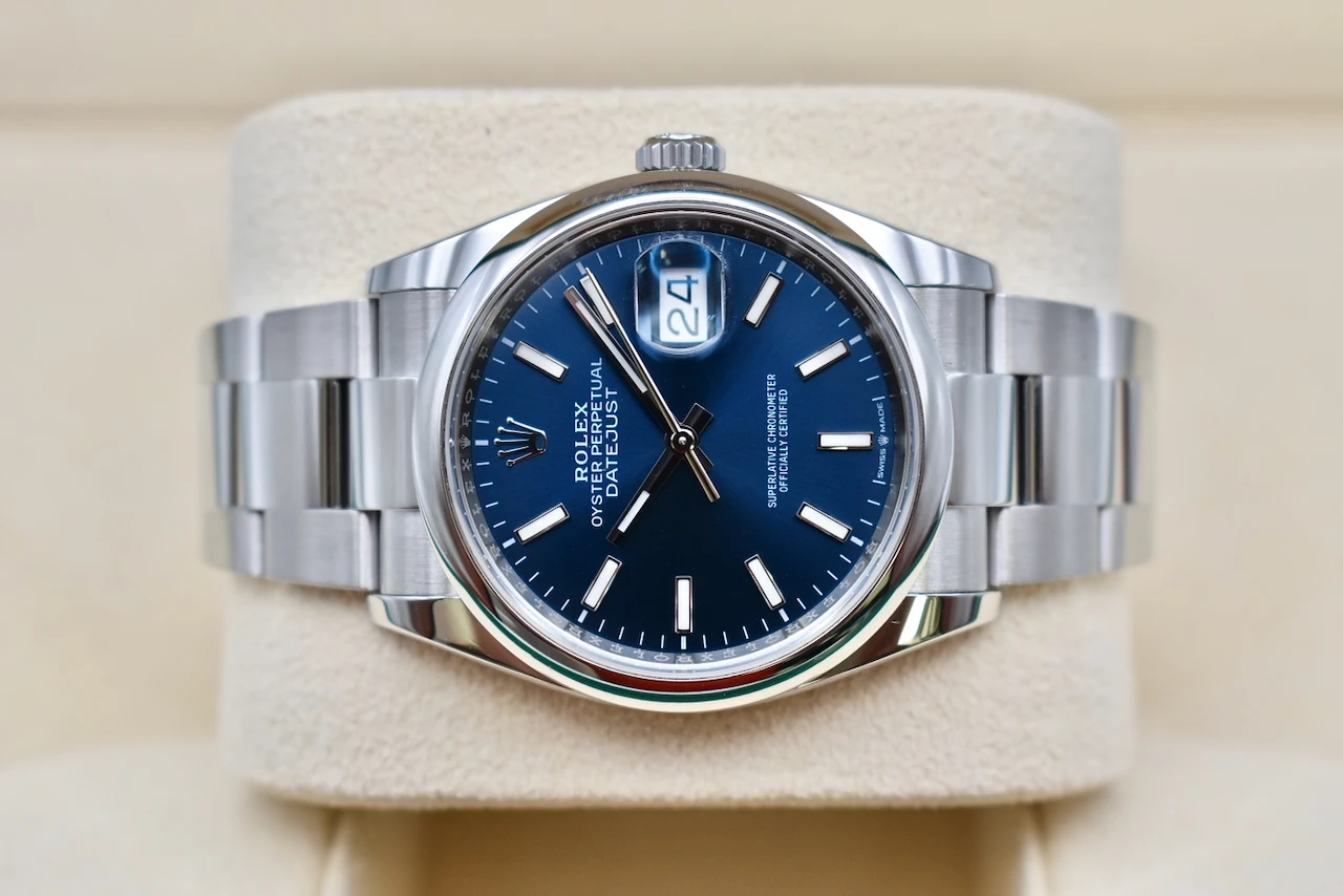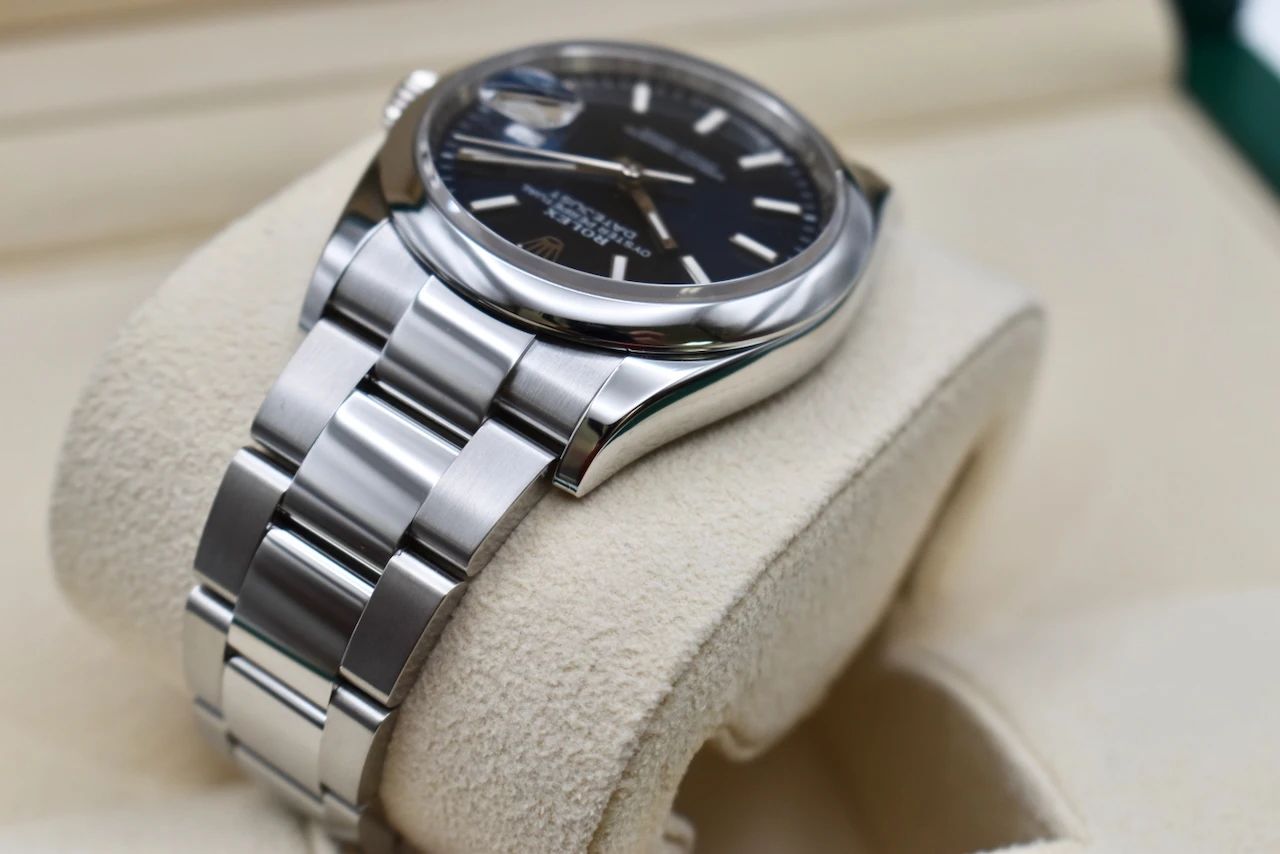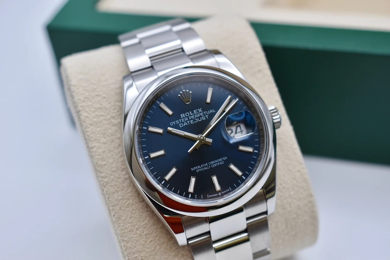 Timeless. Elegant. Instantly recognisable. The Rolex Datejust 36mm Blue Baton Dial (Ref. 126200) represents the perfect harmony between classic design and modern innovation. Crafted in stainless steel (Oystersteel) with a vibrant sunray blue dial and baton hour markers, this Rolex Datejust is the ultimate symbol of understated luxury and precision engineering.Powered by the Rolex Calibre 3235 automatic movement, the Datejust 126200 offers exceptional accuracy, a 70-hour power reserve, and a flawless sweep of the seconds hand — hallmarks of Swiss watchmaking excellence. Its smooth bezel and Oyster bracelet complete the refined aesthetic that has made the Rolex Datejust a cornerstone of luxury watch collections for decades.