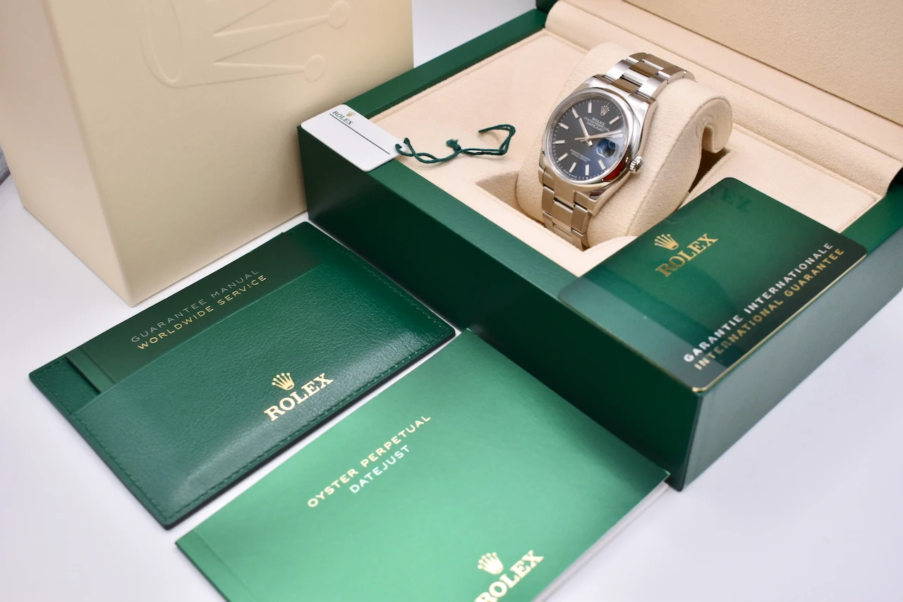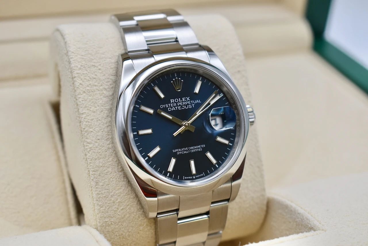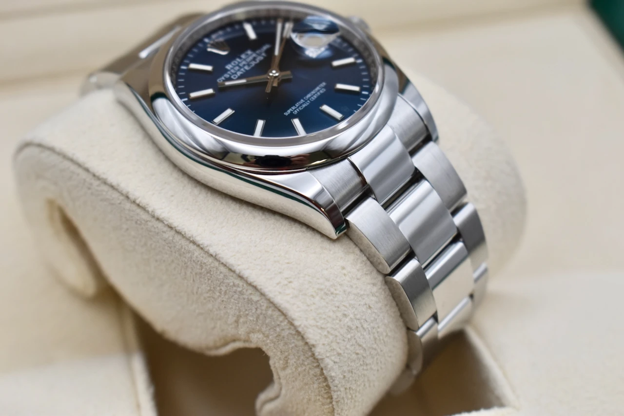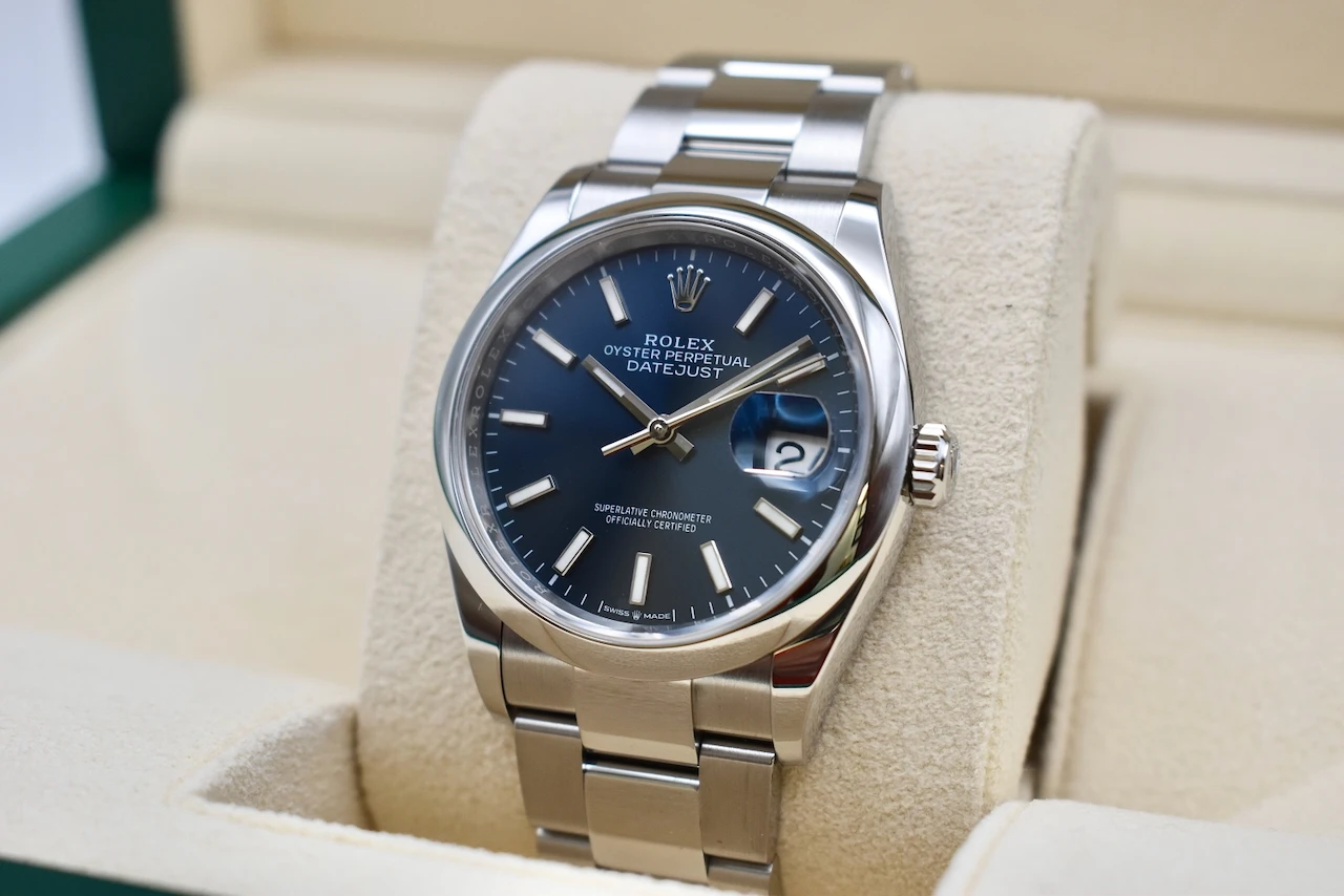 Timeless. Elegant. Instantly recognisable. The Rolex Datejust 36mm Blue Baton Dial (Ref. 126200) represents the perfect harmony between classic design and modern innovation. Crafted in stainless steel (Oystersteel) with a vibrant sunray blue dial and baton hour markers, this Rolex Datejust is the ultimate symbol of understated luxury and precision engineering.Powered by the Rolex Calibre 3235 automatic movement, the Datejust 126200 offers exceptional accuracy, a 70-hour power reserve, and a flawless sweep of the seconds hand — hallmarks of Swiss watchmaking excellence. Its smooth bezel and Oyster bracelet complete the refined aesthetic that has made the Rolex Datejust a cornerstone of luxury watch collections for decades.