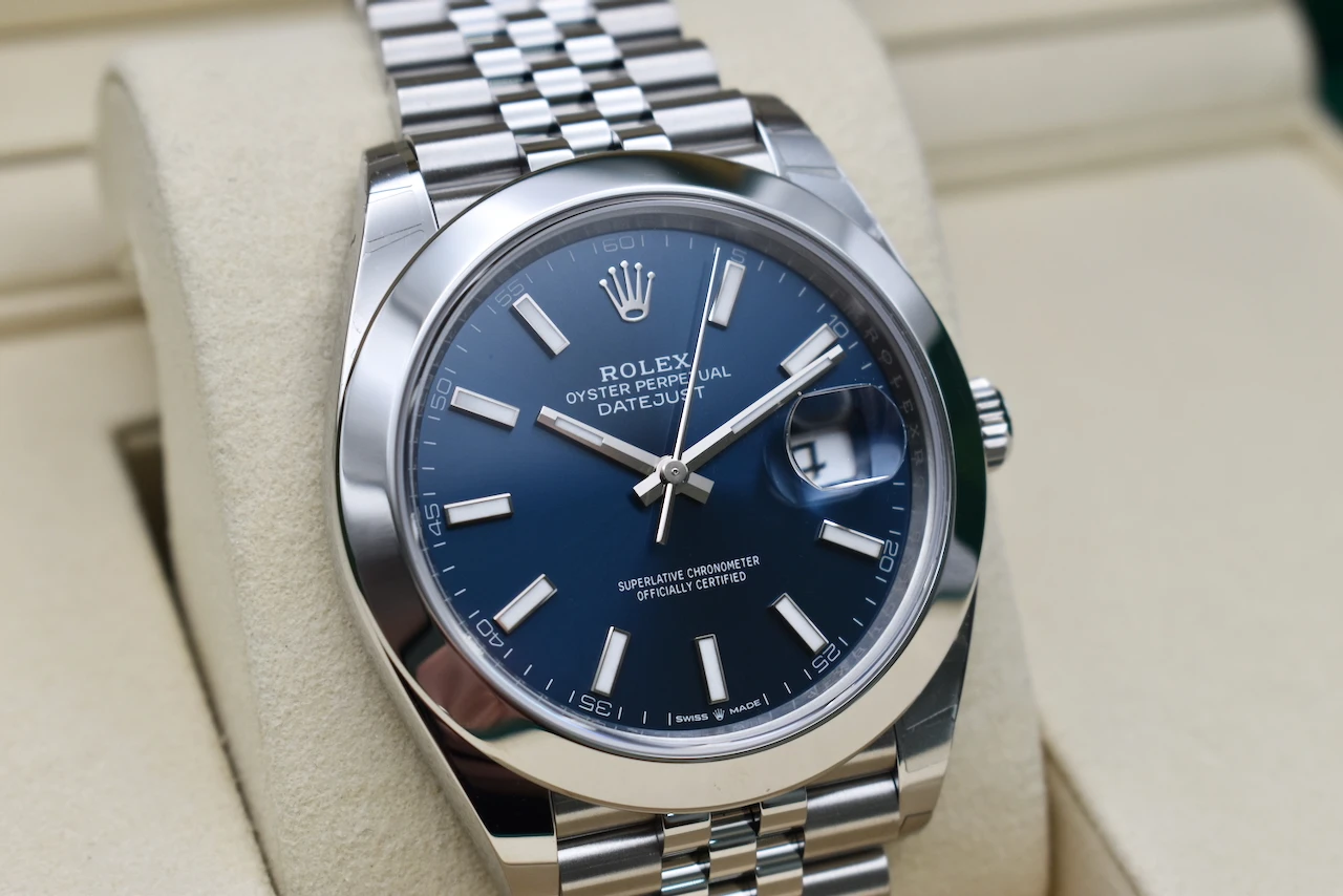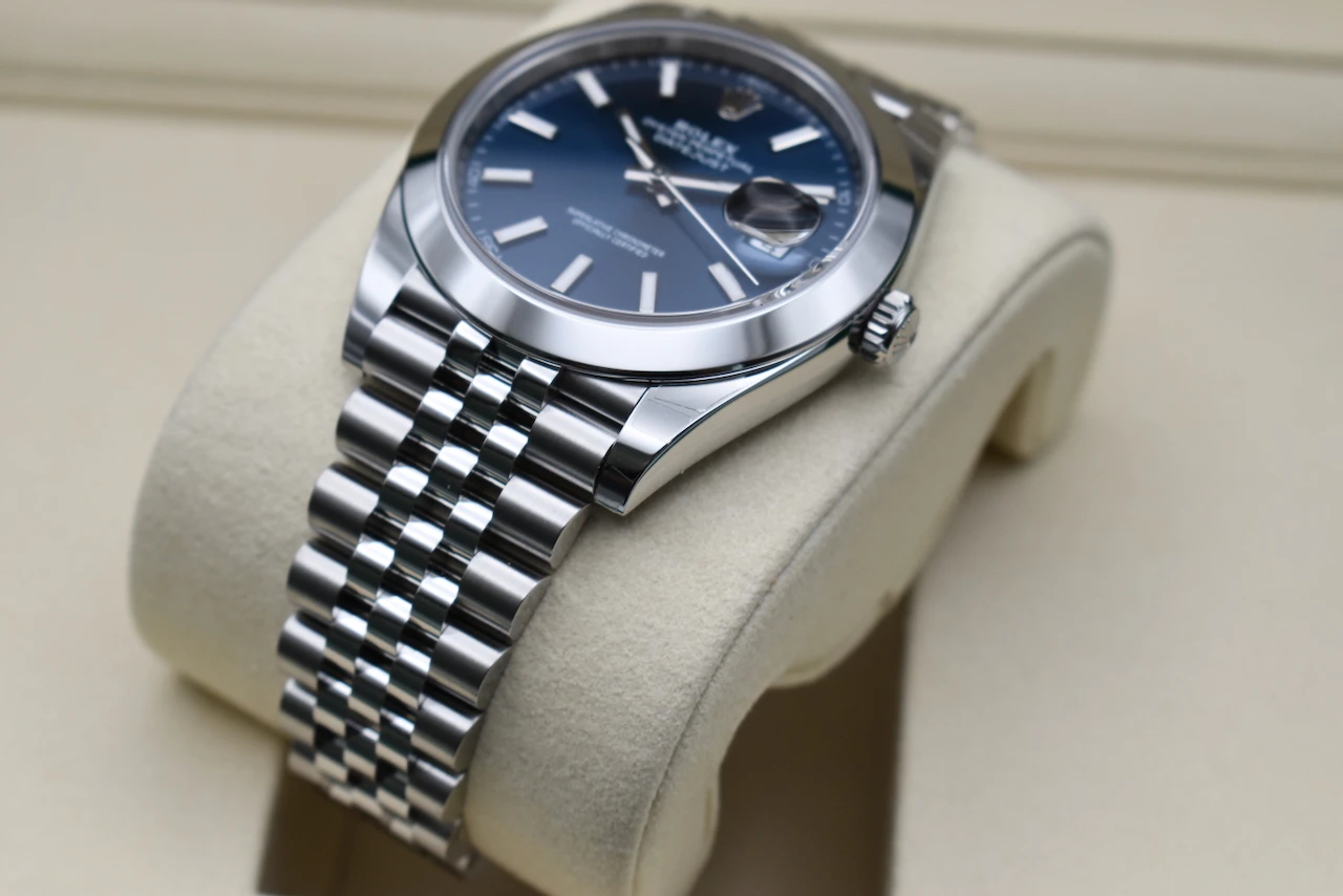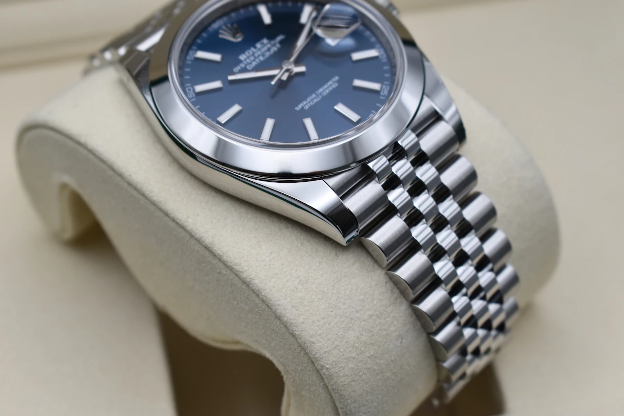 Discover timeless elegance with the Rolex Datejust 41 reference 126300, featuring a striking blue baton dial paired with robust Oystersteel construction. This unworn piece offers the perfect blend of classic design and modern sophistication, making it an exceptional addition to any luxury watch collection.Presented as a full set, this watch comes complete with its original Rolex box, warranty card, manuals, and all accompanying accessories—ensuring authenticity, provenance, and long-term value. Powered by Rolex’s dependable self-winding calibre 3235 movement, the Datejust 41 delivers outstanding precision, durability, and a 70-hour power reserve.Offered by Tempus Lord, trusted luxury watch specialists based in Hatton Garden, London’s world-renowned jewellery district. We guarantee a secure, transparent buying experience and the highest standards of customer care.Elevate your collection with a modern Rolex icon—unworn, fully complete, and ready for its first wrist.