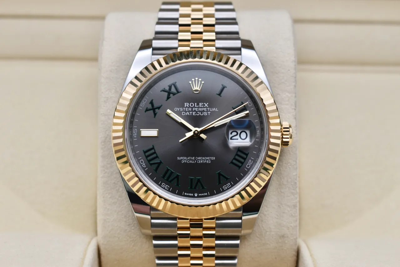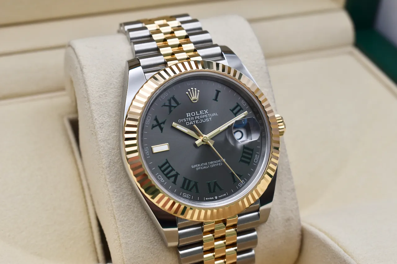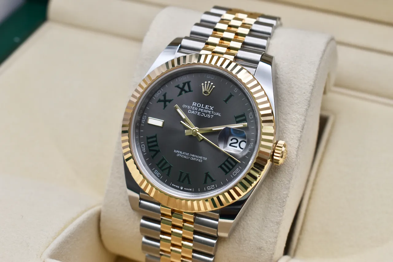 A true icon of timeless design and modern luxury, this Rolex Datejust 41 reference 126333 showcases the highly desirable “Wimbledon” dial—one of the most recognisable and sought-after configurations in the Datejust lineup.Featuring a sophisticated slate grey dial with striking green Roman numerals, this model perfectly balances classic elegance with a contemporary edge. The combination of Oystersteel and 18ct yellow gold creates Rolex’s signature Rolesor finish, offering both durability and unmistakable prestige.This particular watch is a 2025 model and is presented in excellent condition. It comes as a complete full set, including its original box and papers, making it an outstanding option for both collectors and first-time luxury buyers seeking confidence and long-term value.Powered by Rolex’s in-house automatic movement, the Datejust delivers exceptional precision, reliability, and everyday wearability. Paired with the iconic fluted bezel and Jubilee bracelet, this watch embodies everything that has made the Datejust a cornerstone of luxury watchmaking.