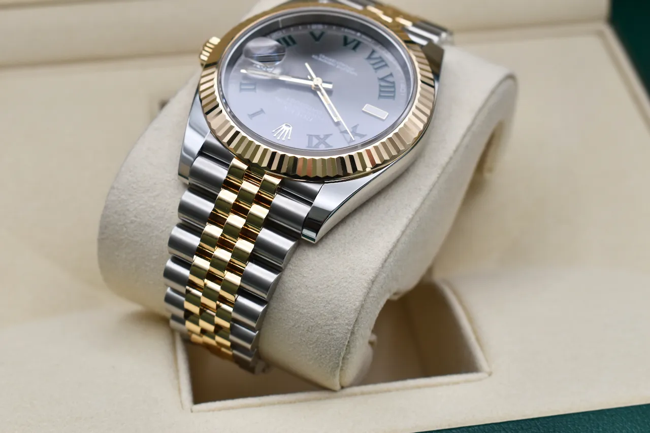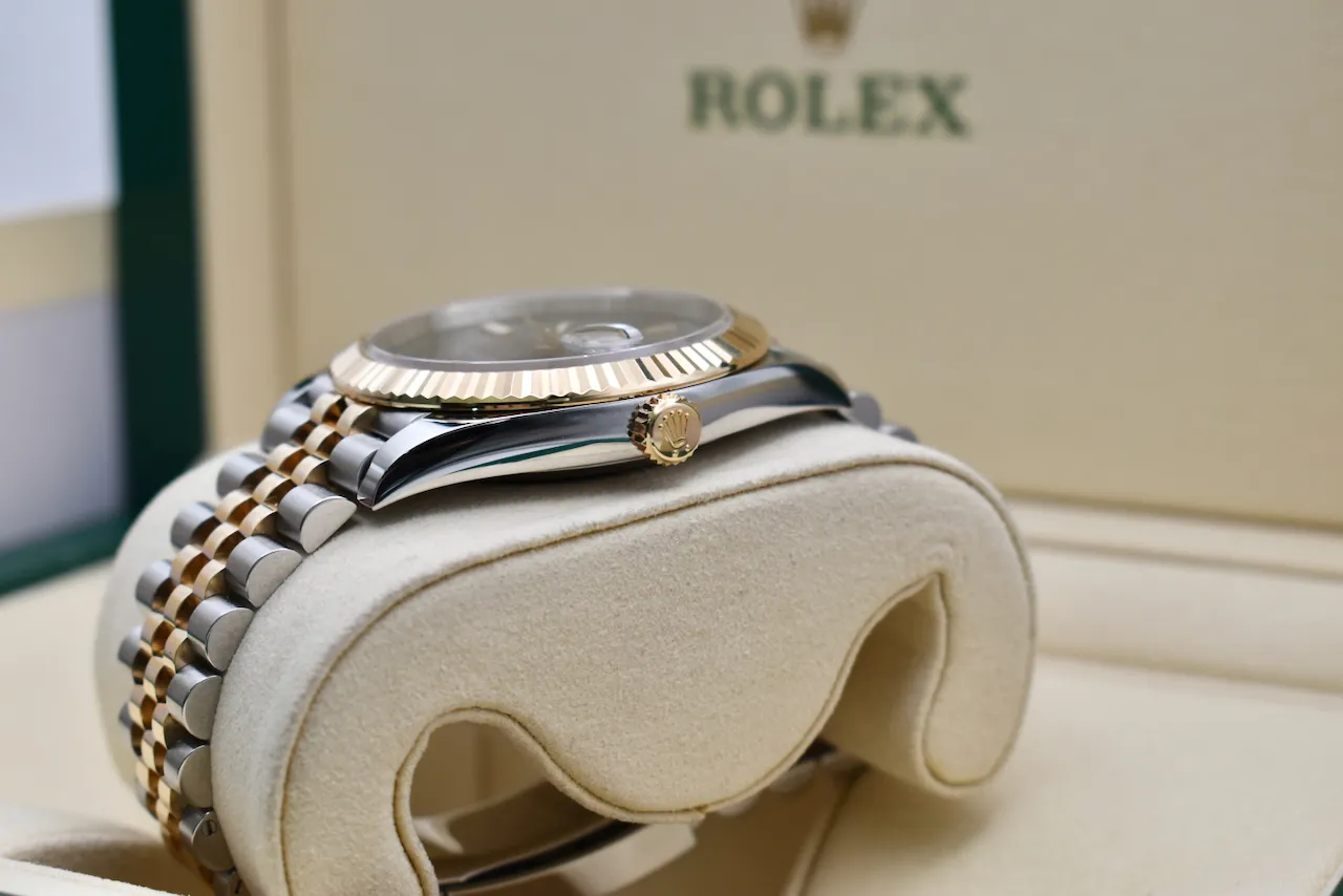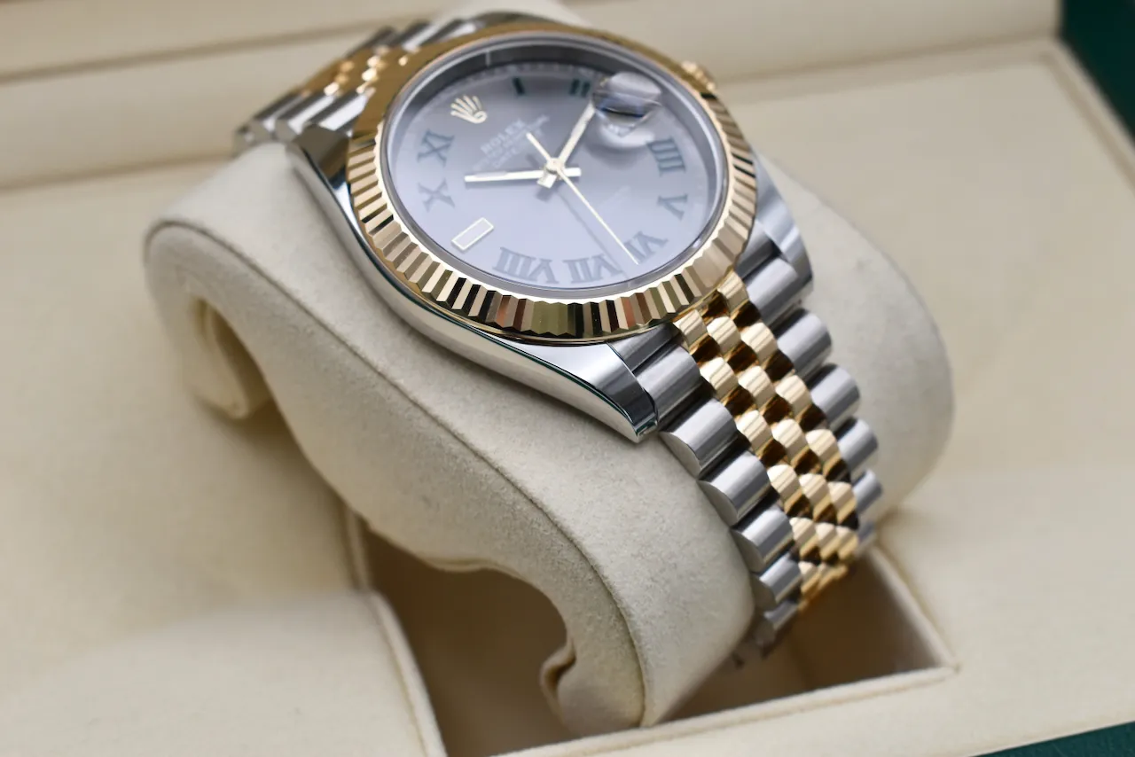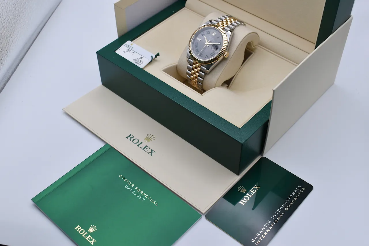 A true icon of timeless design and modern luxury, this Rolex Datejust 41 reference 126333 showcases the highly desirable “Wimbledon” dial—one of the most recognisable and sought-after configurations in the Datejust lineup.Featuring a sophisticated slate grey dial with striking green Roman numerals, this model perfectly balances classic elegance with a contemporary edge. The combination of Oystersteel and 18ct yellow gold creates Rolex’s signature Rolesor finish, offering both durability and unmistakable prestige.This particular watch is a 2025 model and is presented in excellent condition. It comes as a complete full set, including its original box and papers, making it an outstanding option for both collectors and first-time luxury buyers seeking confidence and long-term value.Powered by Rolex’s in-house automatic movement, the Datejust delivers exceptional precision, reliability, and everyday wearability. Paired with the iconic fluted bezel and Jubilee bracelet, this watch embodies everything that has made the Datejust a cornerstone of luxury watchmaking.