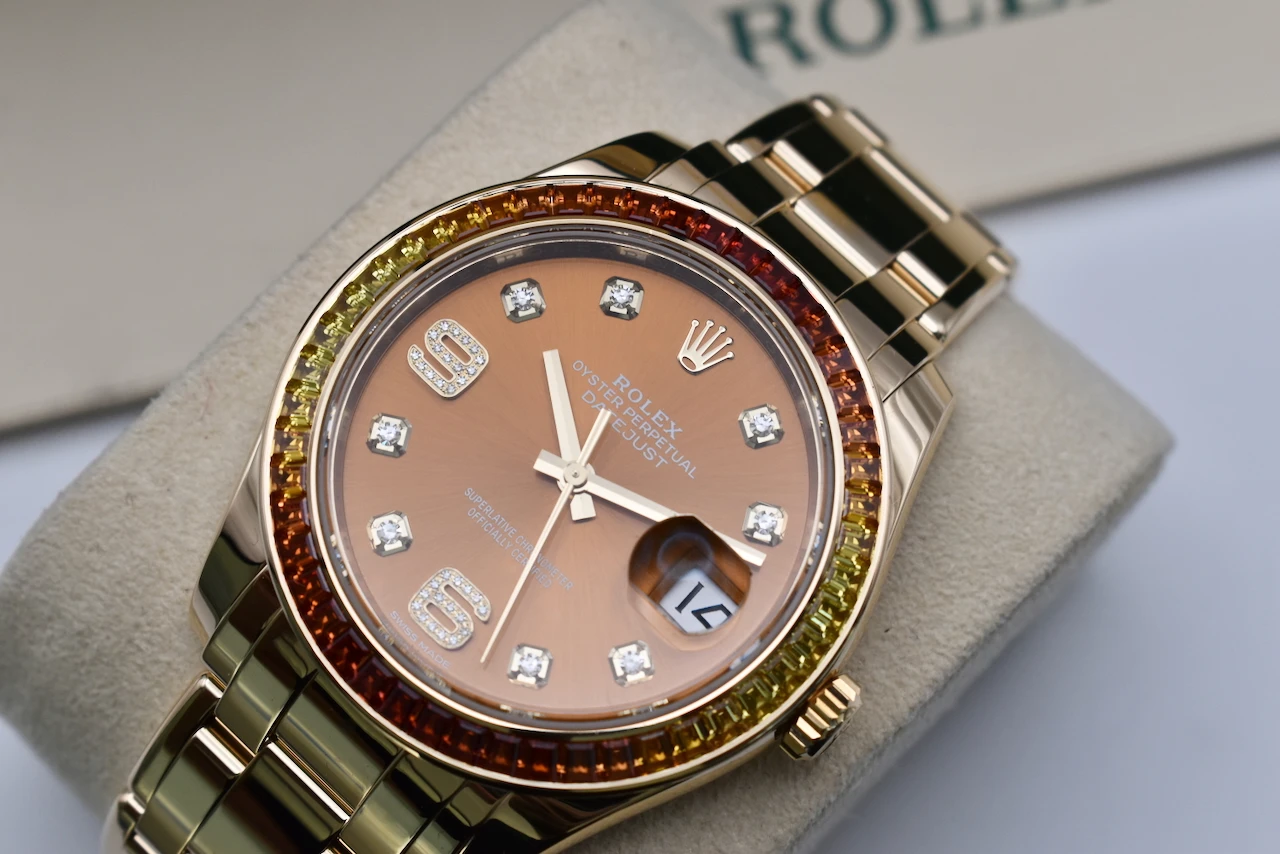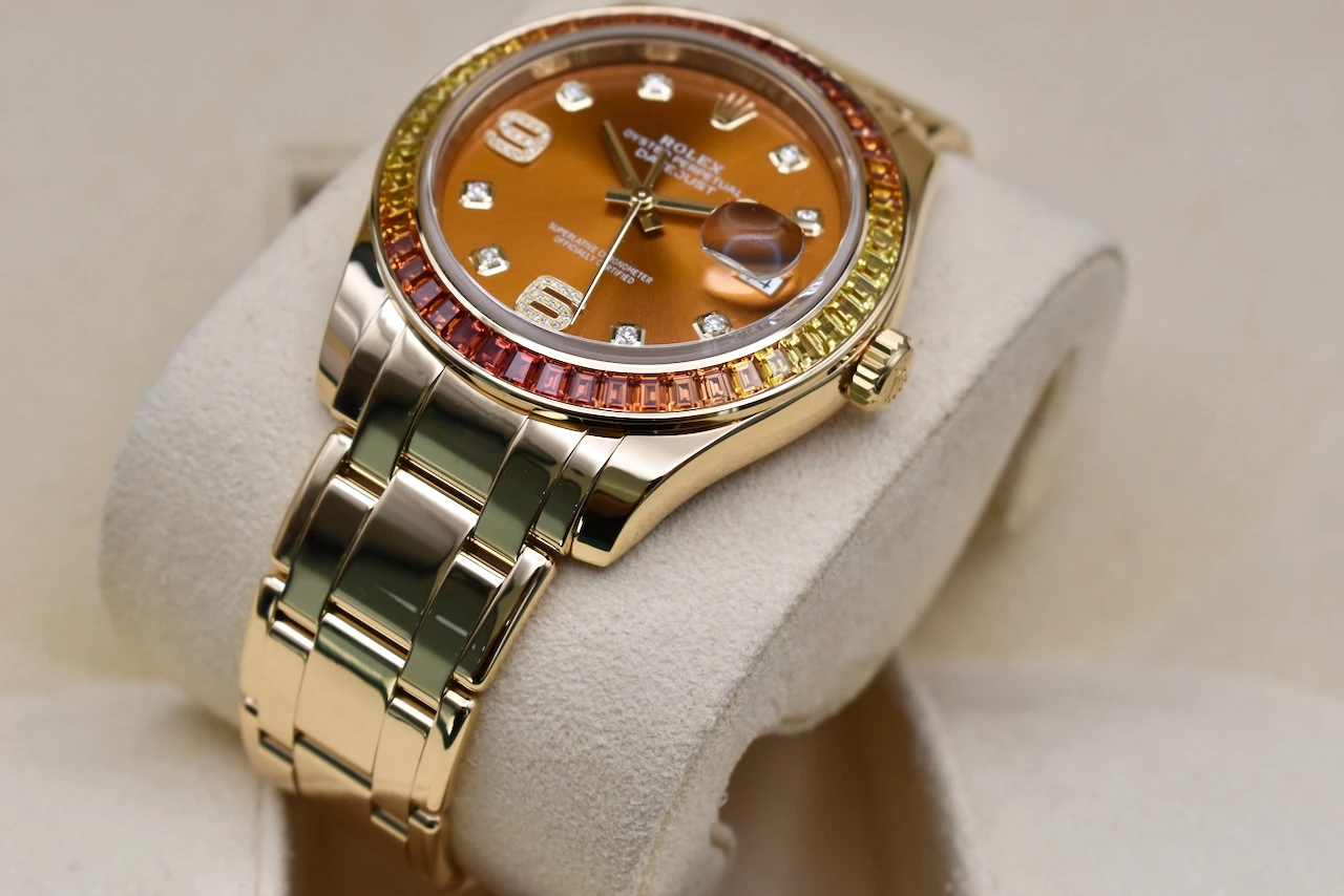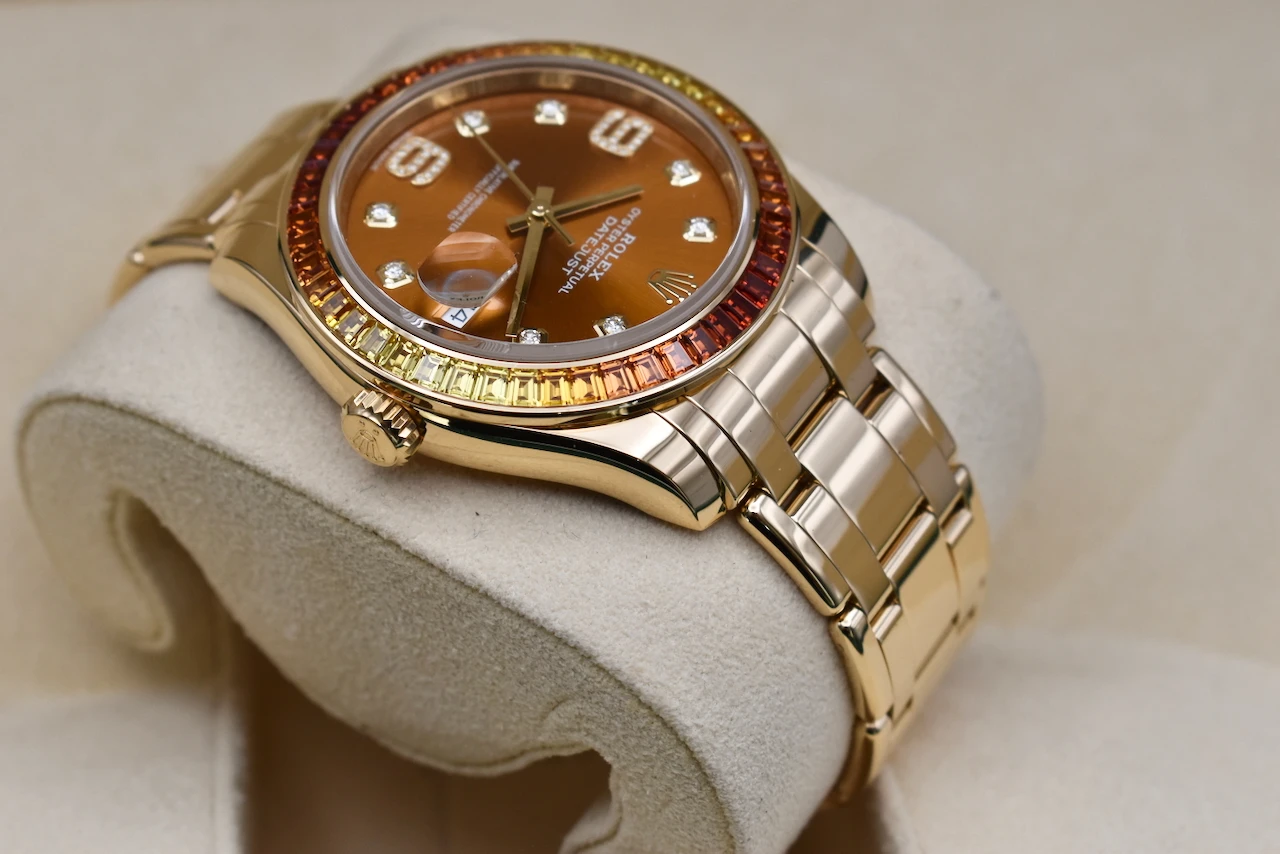 Elevate your collection with the Rolex Datejust Pearlmaster 18ct Gold Watch 86348SAJOR, a true masterpiece of luxury and craftsmanship. This 2021 model is in excellent condition and comes complete with original box and papers, offering full authenticity and peace of mind.The watch features a striking yellow-to-orange gradient sapphire bezel, creating a vibrant, eye-catching effect that perfectly complements its cognac dial adorned with brilliant diamond hour markers. This combination of warm tones and luxurious gemstones makes the Pearlmaster 86348SAJOR a statement piece that exudes elegance and sophistication.Crafted in 18ct gold, the Pearlmaster bracelet and case reflect Rolex’s legendary attention to detail and premium quality. Whether for daily wear or a collector’s showcase, this timepiece blends style, precision, and investment potential seamlessly.Sold by Tempus Lord, based in the prestigious Hatton Garden, London, this Rolex Datejust Pearlmaster is ideal for connoisseurs seeking a rare and luxurious Swiss watch.
