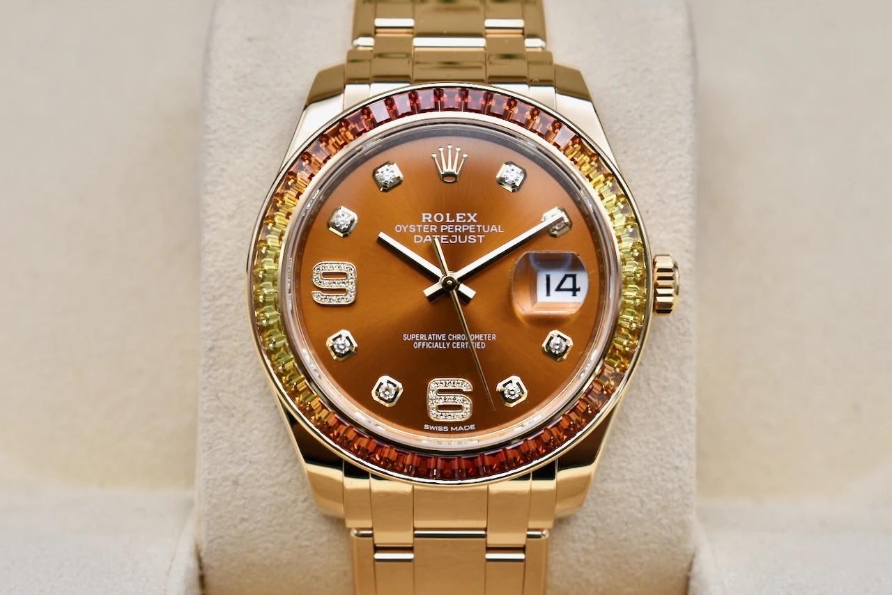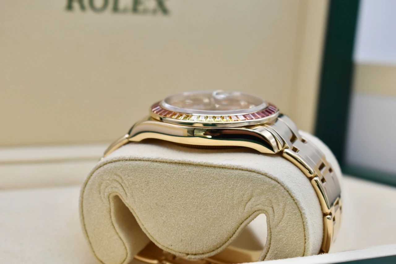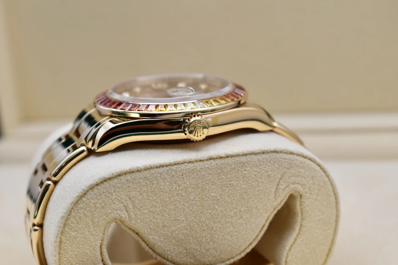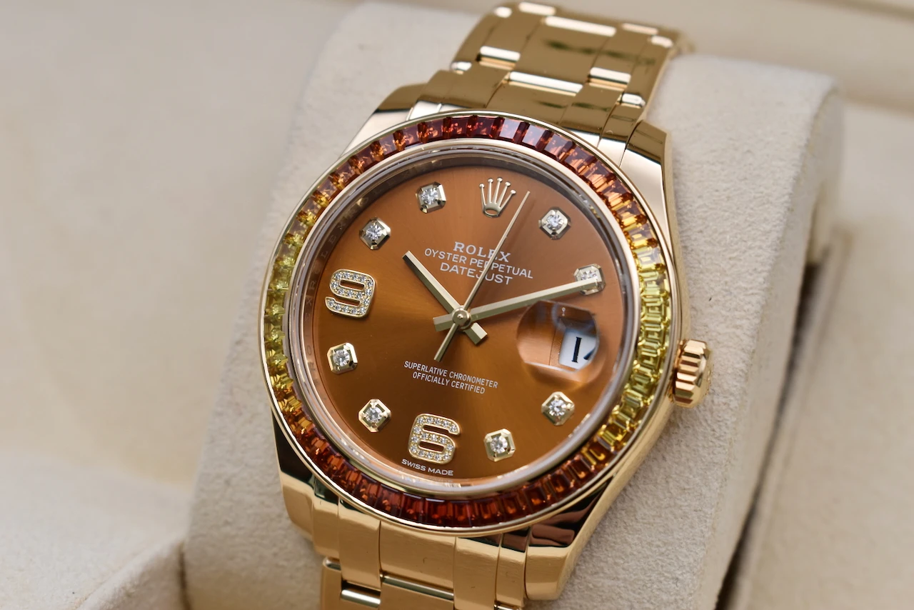 Elevate your collection with the Rolex Datejust Pearlmaster 18ct Gold Watch 86348SAJOR, a true masterpiece of luxury and craftsmanship. This 2021 model is in excellent condition and comes complete with original box and papers, offering full authenticity and peace of mind.The watch features a striking yellow-to-orange gradient sapphire bezel, creating a vibrant, eye-catching effect that perfectly complements its cognac dial adorned with brilliant diamond hour markers. This combination of warm tones and luxurious gemstones makes the Pearlmaster 86348SAJOR a statement piece that exudes elegance and sophistication.Crafted in 18ct gold, the Pearlmaster bracelet and case reflect Rolex’s legendary attention to detail and premium quality. Whether for daily wear or a collector’s showcase, this timepiece blends style, precision, and investment potential seamlessly.Sold by Tempus Lord, based in the prestigious Hatton Garden, London, this Rolex Datejust Pearlmaster is ideal for connoisseurs seeking a rare and luxurious Swiss watch.