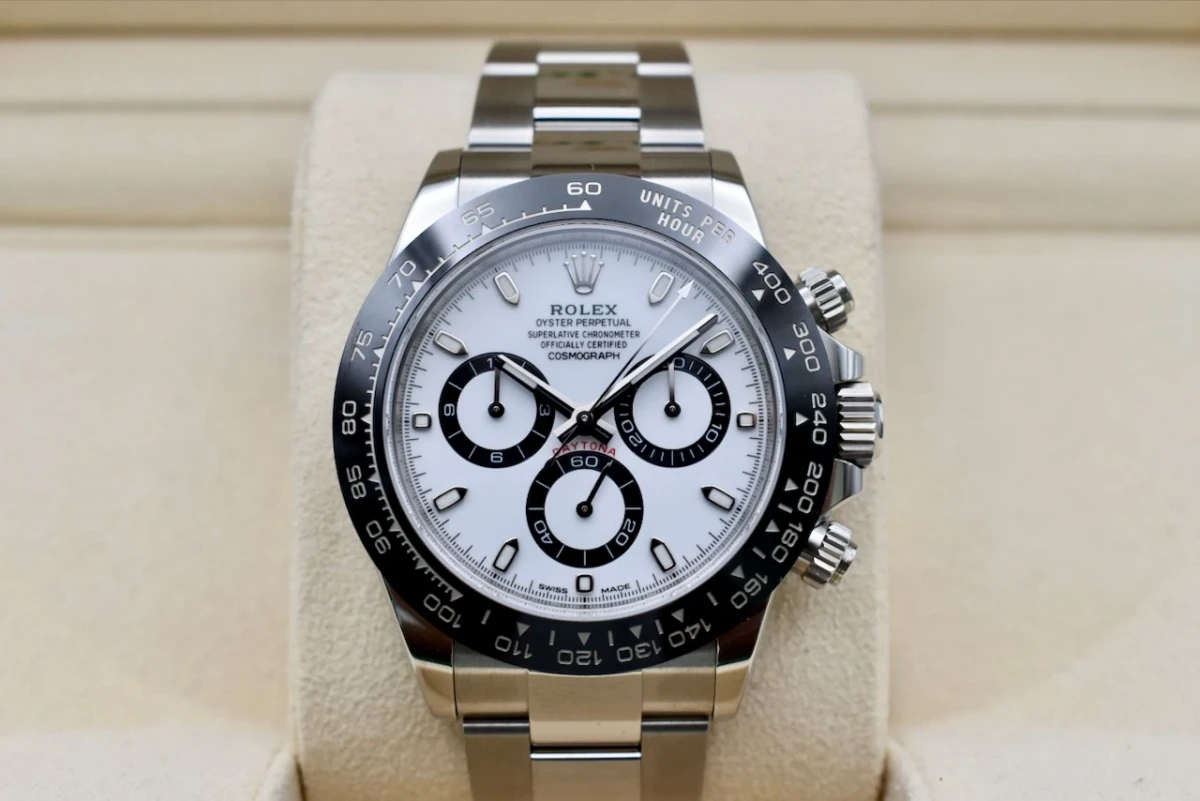 The Rolex Cosmograph Daytona “Panda” (Ref. 116500LN) is one of the most sought-after modern Rolex watches, blending timeless design with professional chronograph performance. Featuring a 40mm stainless steel Oyster case, a striking white dial with black sub-dials (“Panda” configuration), and a robust black Cerachrom ceramic bezel, this model has become a legend in both motorsport and luxury watch collecting.Launched as part of Rolex’s professional chronograph line, the Daytona Panda 116500LN is powered by the in-house Rolex Calibre 4130 automatic movement, known for its precision, durability, and 72-hour power reserve. Built for racing heritage yet designed for everyday luxury, the Panda Daytona remains one of the most desirable stainless steel watches in the world.