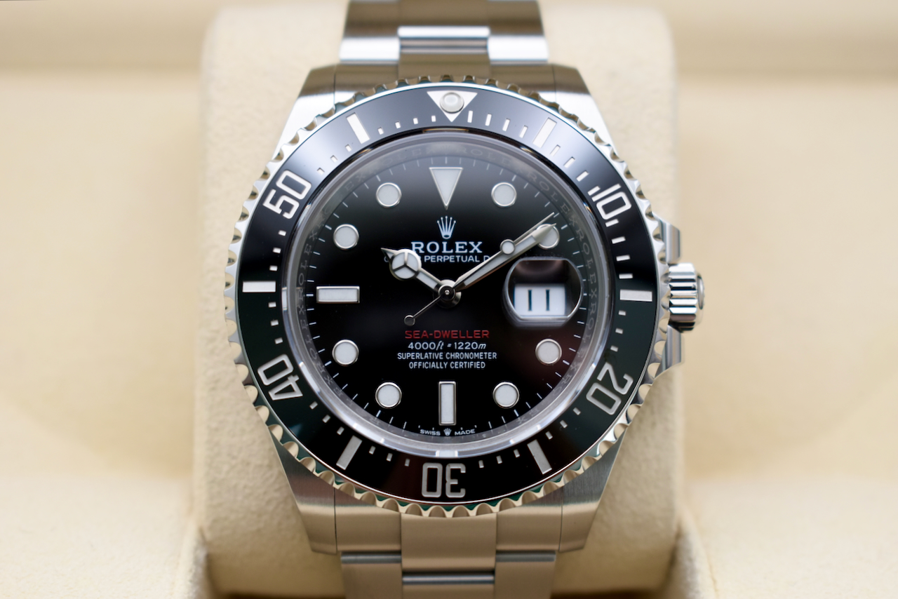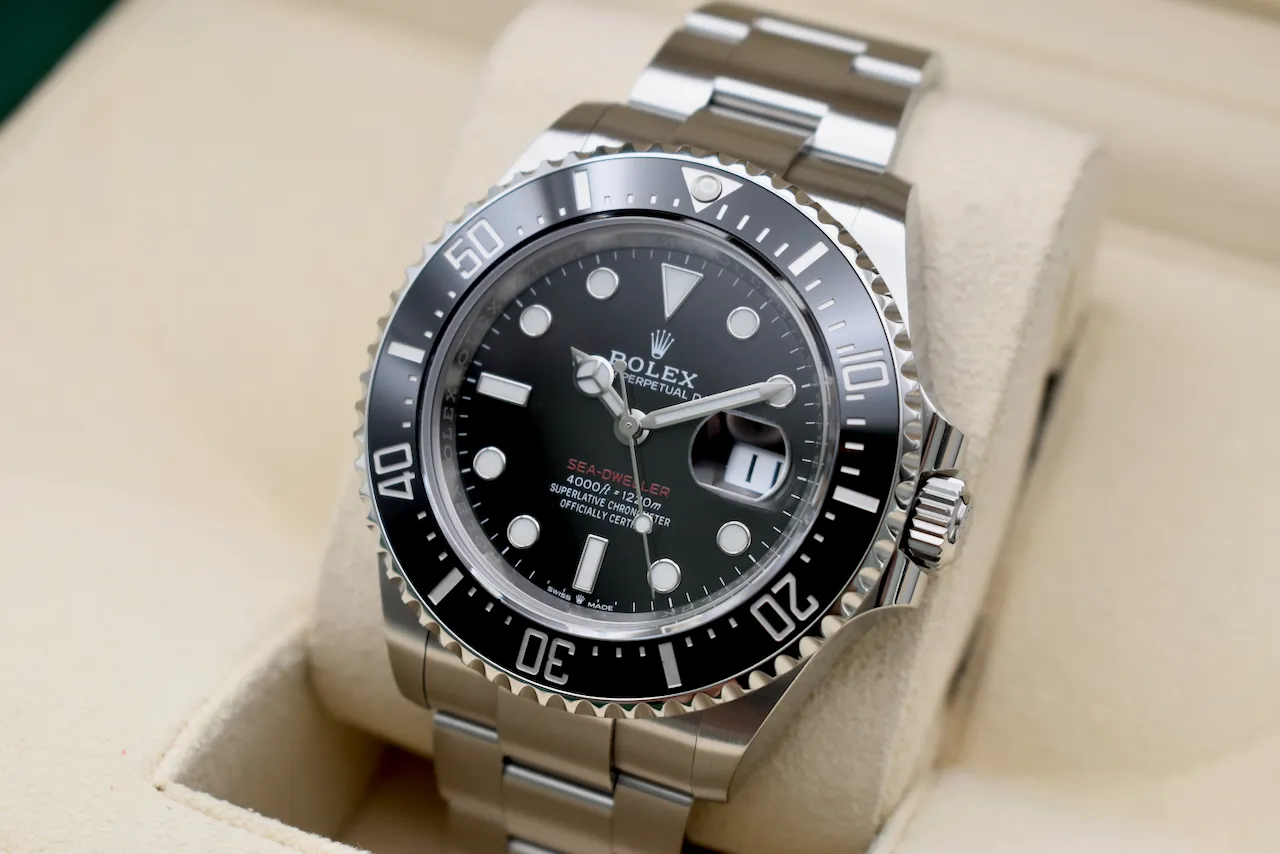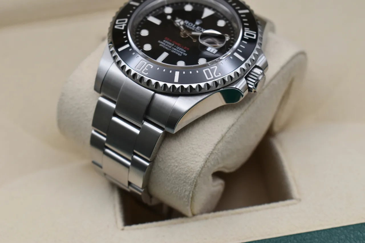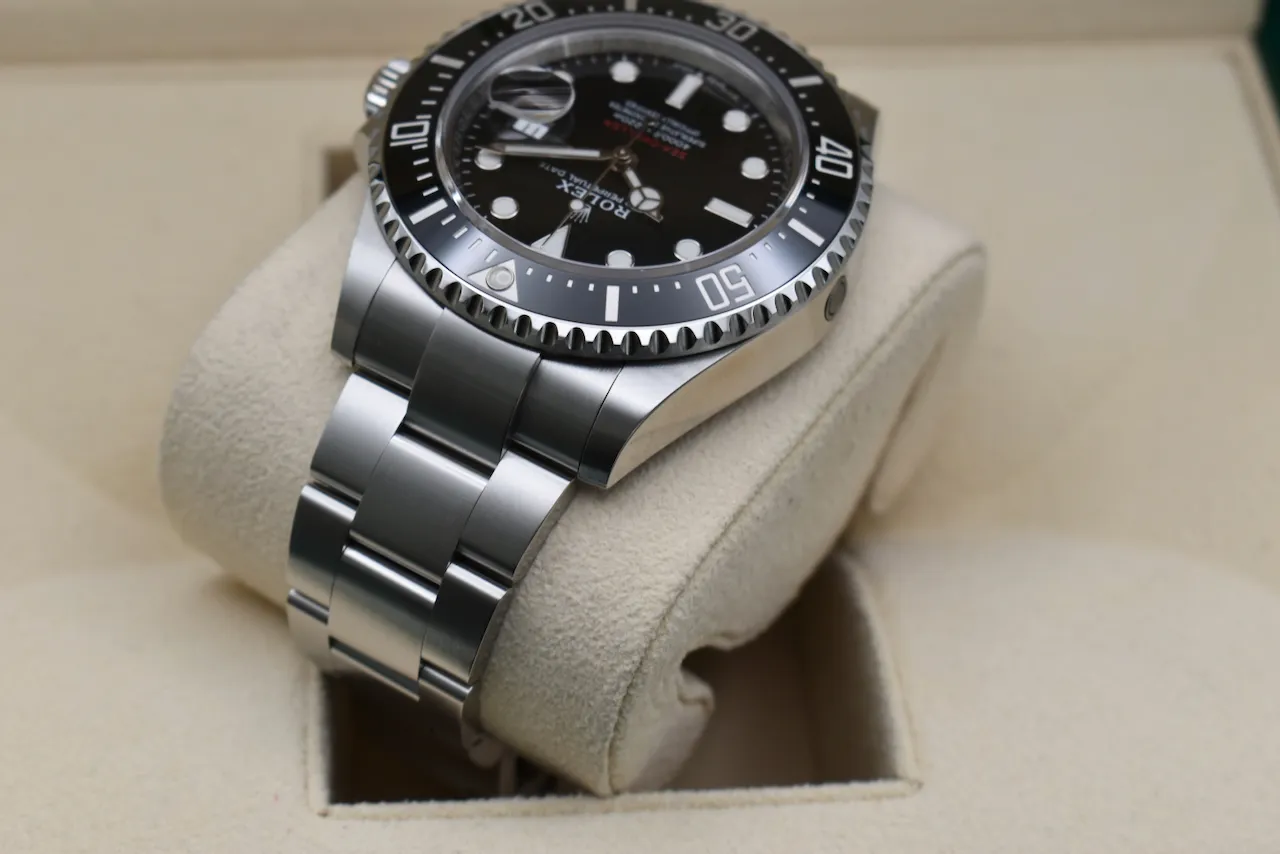 Discover the unmistakable presence of the Rolex Sea-Dweller 43 ‘Big Red’ Ref. 126600 — a modern icon engineered for performance, precision, and prestige. Crafted from robust Oystersteel and measuring a commanding 43mm, this professional diver’s watch is built to withstand extreme depths of up to 1,220 metres (4,000 feet), making it one of Rolex’s most capable and sought-after tool watches.What truly sets this model apart is the return of the legendary “Sea-Dweller” name in striking red text across the dial — a subtle yet powerful nod to vintage Rolex heritage, earning it the coveted “Big Red” nickname among collectors. The bold black dial is complemented by Chromalight luminous markers for exceptional visibility, while the unidirectional ceramic bezel ensures precise dive timing in any condition.Powered by Rolex’s in-house Calibre 3235 automatic movement, this watch delivers outstanding accuracy, reliability, and an impressive 70-hour power reserve. The Oyster bracelet, equipped with the Glidelock extension system, provides both comfort and adaptability, whether worn daily or over a diving suit.This particular example is a 2021 model and comes complete with its original box and papers, offering peace of mind and added collectability for discerning buyers. Presented in excellent condition, it represents a superb opportunity to own one of Rolex’s most desirable modern sports watches.Available now from Tempus Lord, a trusted luxury watch specialist based in Hatton Garden, London — the heart of the UK’s fine watch and jewellery district.A true statement piece that blends heritage, innovation, and enduring value, the Rolex Sea-Dweller 43 ‘Big Red’ is more than a watch — it’s an investment in timeless excellence.