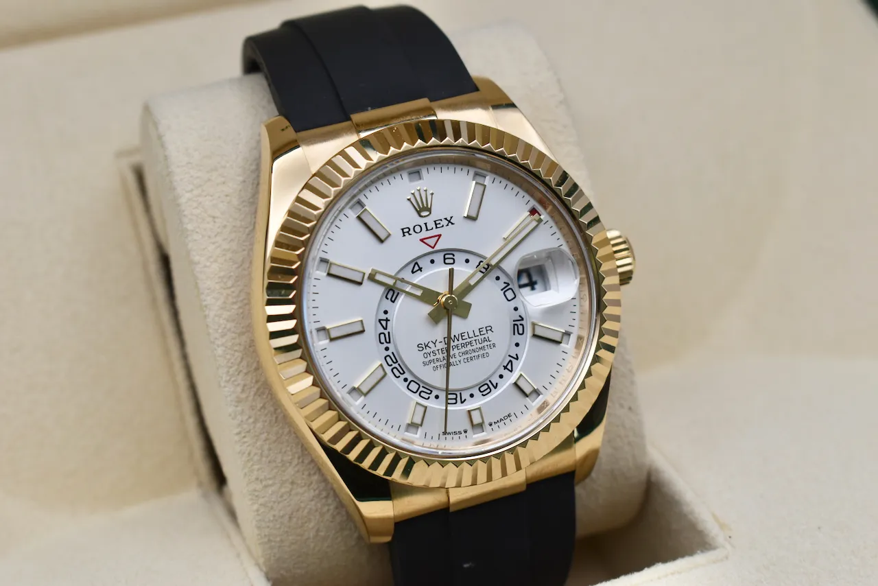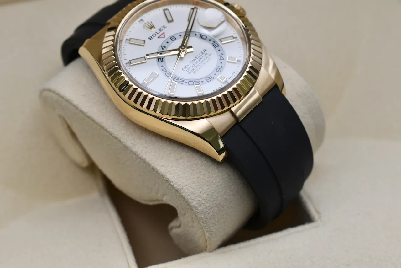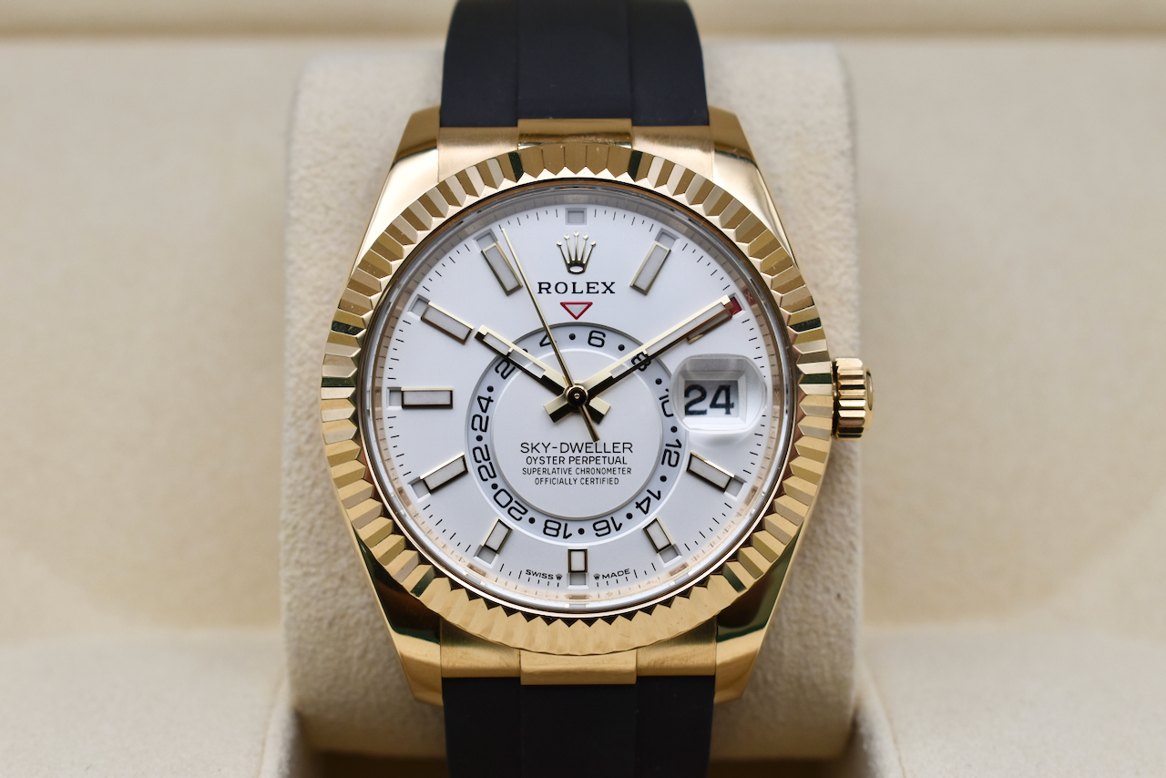 Introducing the exceptional Rolex Sky-Dweller 336238 in solid 18K yellow gold, paired with the sporty yet refined Oysterflex bracelet and presented with a striking white dial. A perfect fusion of technical innovation and bold luxury, this is one of Rolex’s most sophisticated and desirable modern timepieces.Designed for world travellers and high achievers, the Sky-Dweller features Rolex’s ingenious annual calendar and dual time zone display, all controlled effortlessly via the signature Ring Command fluted bezel. The crisp white dial enhances legibility while providing a clean, contemporary contrast against the warmth of the yellow gold case.