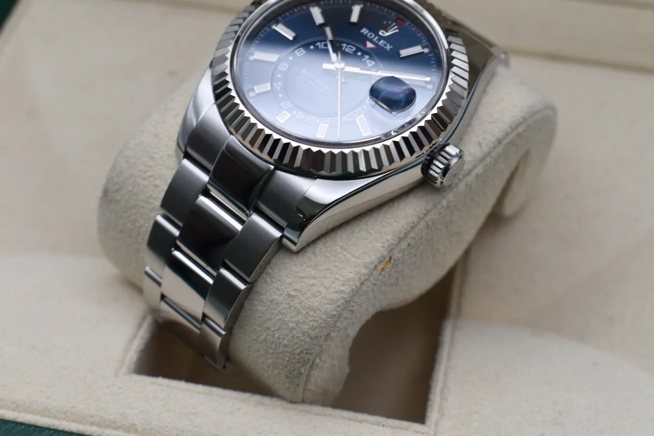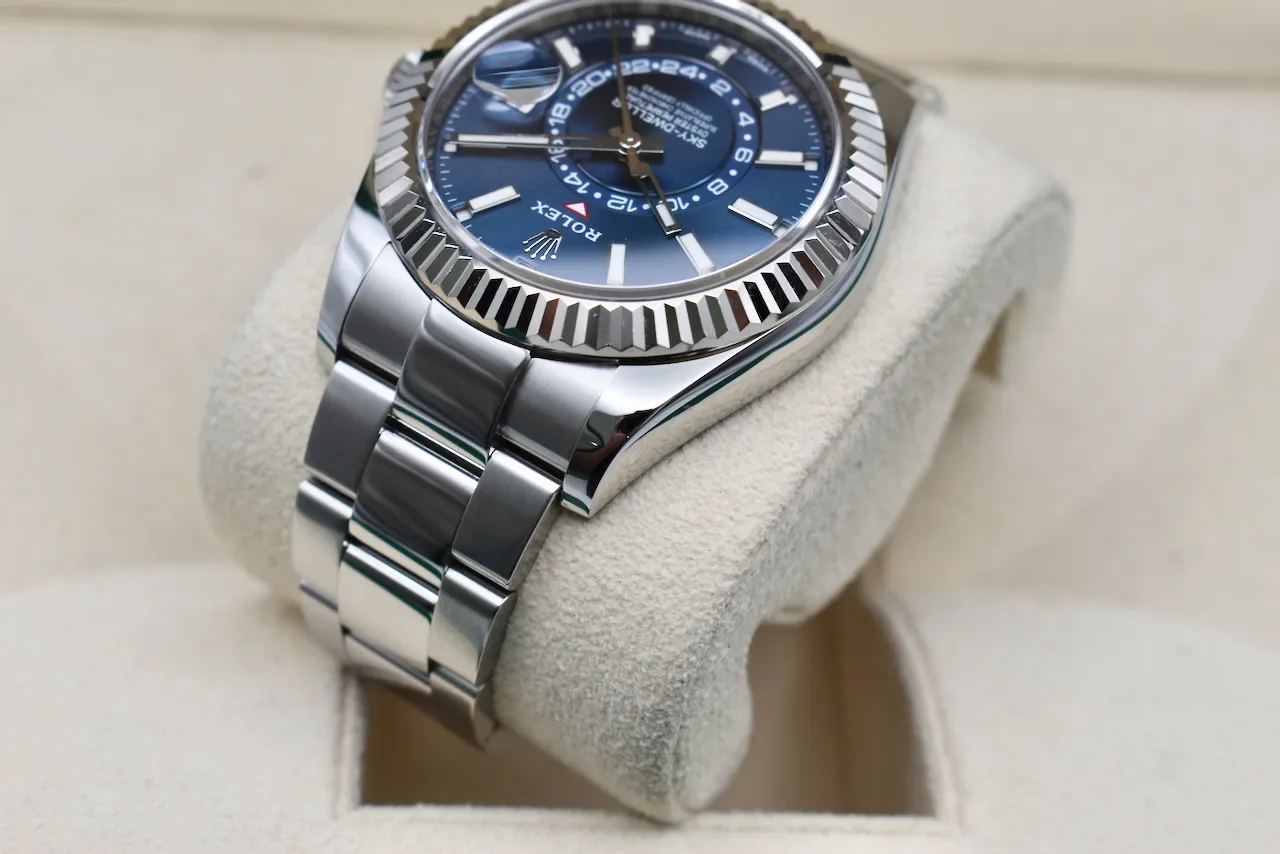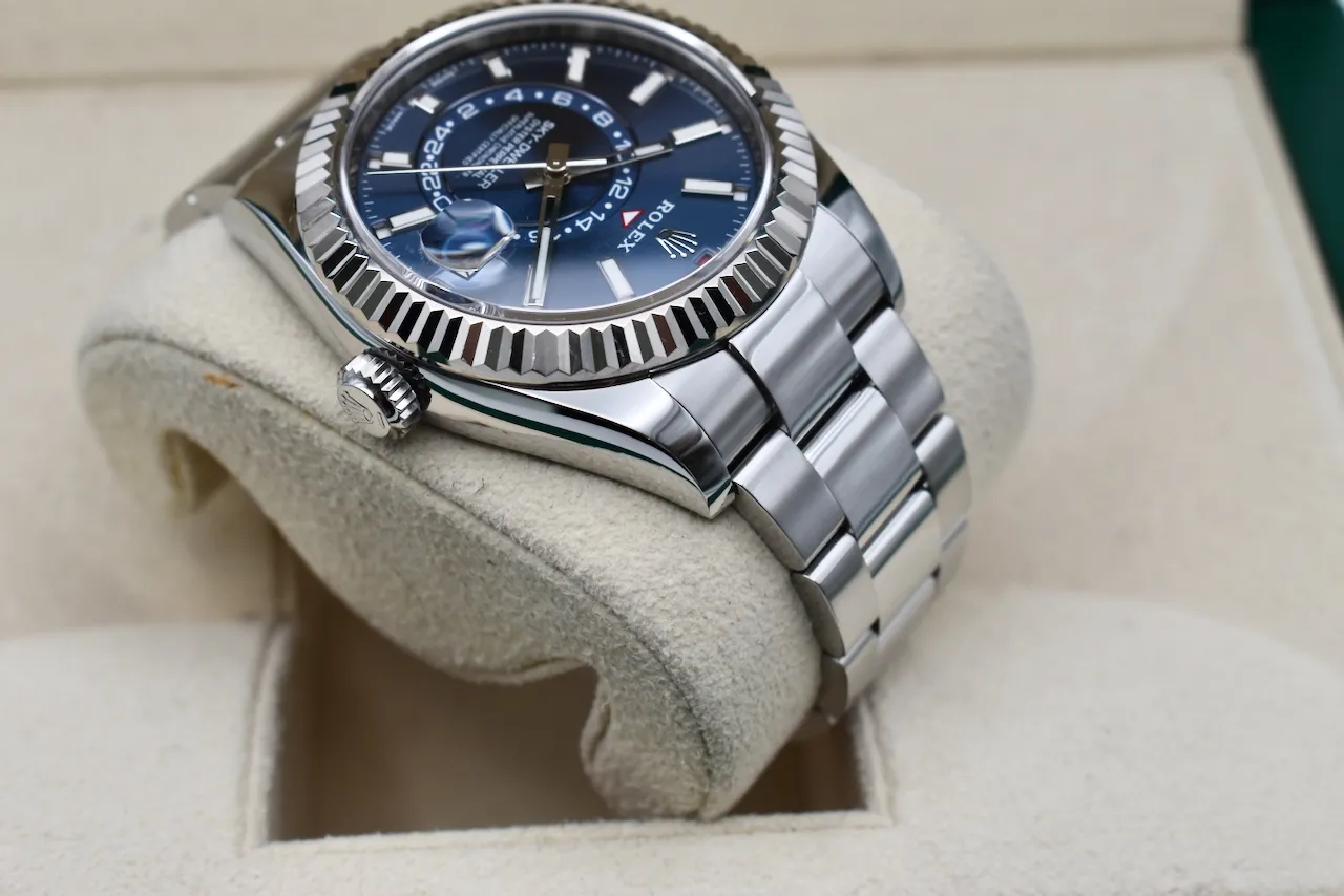Experience the perfect blend of luxury, innovation, and style with the Rolex Skydweller 326934. This 2021 model features a striking blue dial that exudes elegance and modern sophistication, paired with a robust stainless steel case and bracelet. Designed for the discerning traveler, the Skydweller combines Rolex’s signature Annual Calendar and dual time zone functionality, making it as practical as it is prestigious.This watch comes complete with its original box and papers, and is in excellent condition, ensuring authenticity and peace of mind for collectors and enthusiasts alike. Whether for daily wear or as a statement piece, the Skydweller 326934 stands out with its timeless design and impeccable craftsmanship.Available exclusively at Tempus Lord in Hatton Garden, your trusted destination for luxury watches in London. Elevate your collection with this exceptional Rolex today.