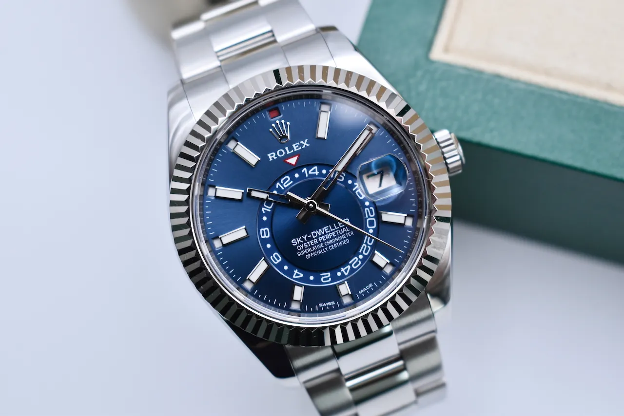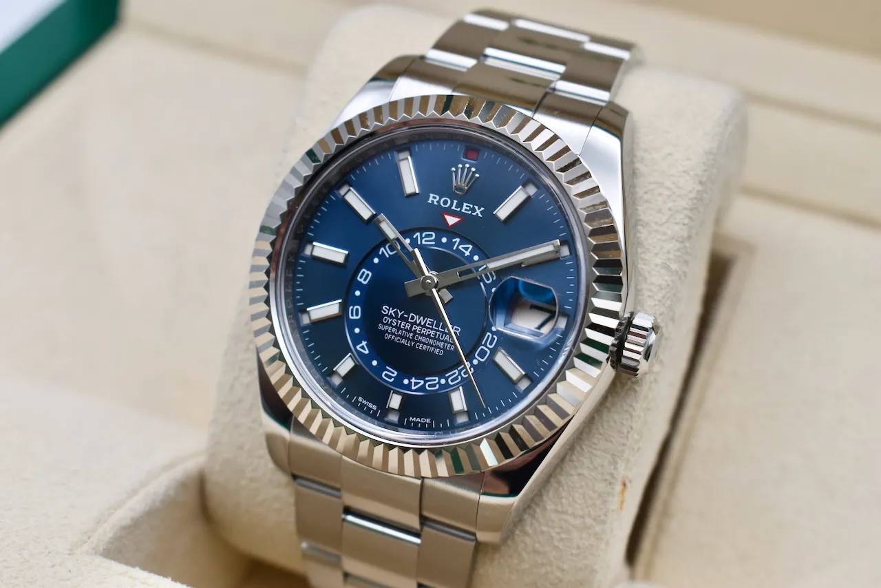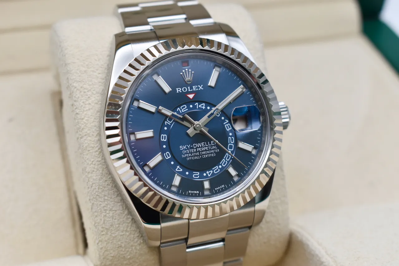 Experience the perfect blend of luxury, innovation, and style with the Rolex Skydweller 326934. This 2021 model features a striking blue dial that exudes elegance and modern sophistication, paired with a robust stainless steel case and bracelet. Designed for the discerning traveler, the Skydweller combines Rolex’s signature Annual Calendar and dual time zone functionality, making it as practical as it is prestigious.This watch comes complete with its original box and papers, and is in excellent condition, ensuring authenticity and peace of mind for collectors and enthusiasts alike. Whether for daily wear or as a statement piece, the Skydweller 326934 stands out with its timeless design and impeccable craftsmanship.Available exclusively at Tempus Lord in Hatton Garden, your trusted destination for luxury watches in London. Elevate your collection with this exceptional Rolex today.