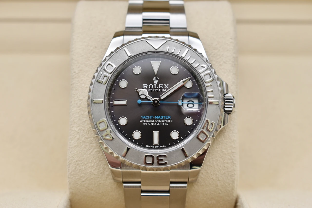 The Rolex Yacht-Master 37 Ref. 268622 is a refined yet sporty timepiece that perfectly balances luxury and performance. Crafted in stainless steel and finished with Rolex’s signature platinum bidirectional bezel, this model offers a sleek, modern aesthetic that remains unmistakably Rolex.The standout feature is the rhodium dial, delivering a sophisticated sunburst finish that changes character beautifully in different lighting. Accented by the highly desirable Tiffany blue ticker seconds hand, the dial gains a subtle pop of colour that elevates the watch and sets it apart from more conventional Yacht-Master models. Applied luminous hour markers and Mercedes hands ensure excellent legibility, whether on land or at sea.This example is a 2021 model, powered by Rolex’s in-house automatic movement, offering exceptional precision, reliability, and everyday wearability. Sized at 37mm, it is perfectly proportioned for those seeking a versatile and elegant sports watch.Offered in good condition, this watch comes complete with its original box and papers, making it an excellent choice for both collectors and first-time Rolex buyers alike.Available through Tempus Lord, based in the heart of Hatton Garden, London, ensuring authenticity, trust, and exceptional service.