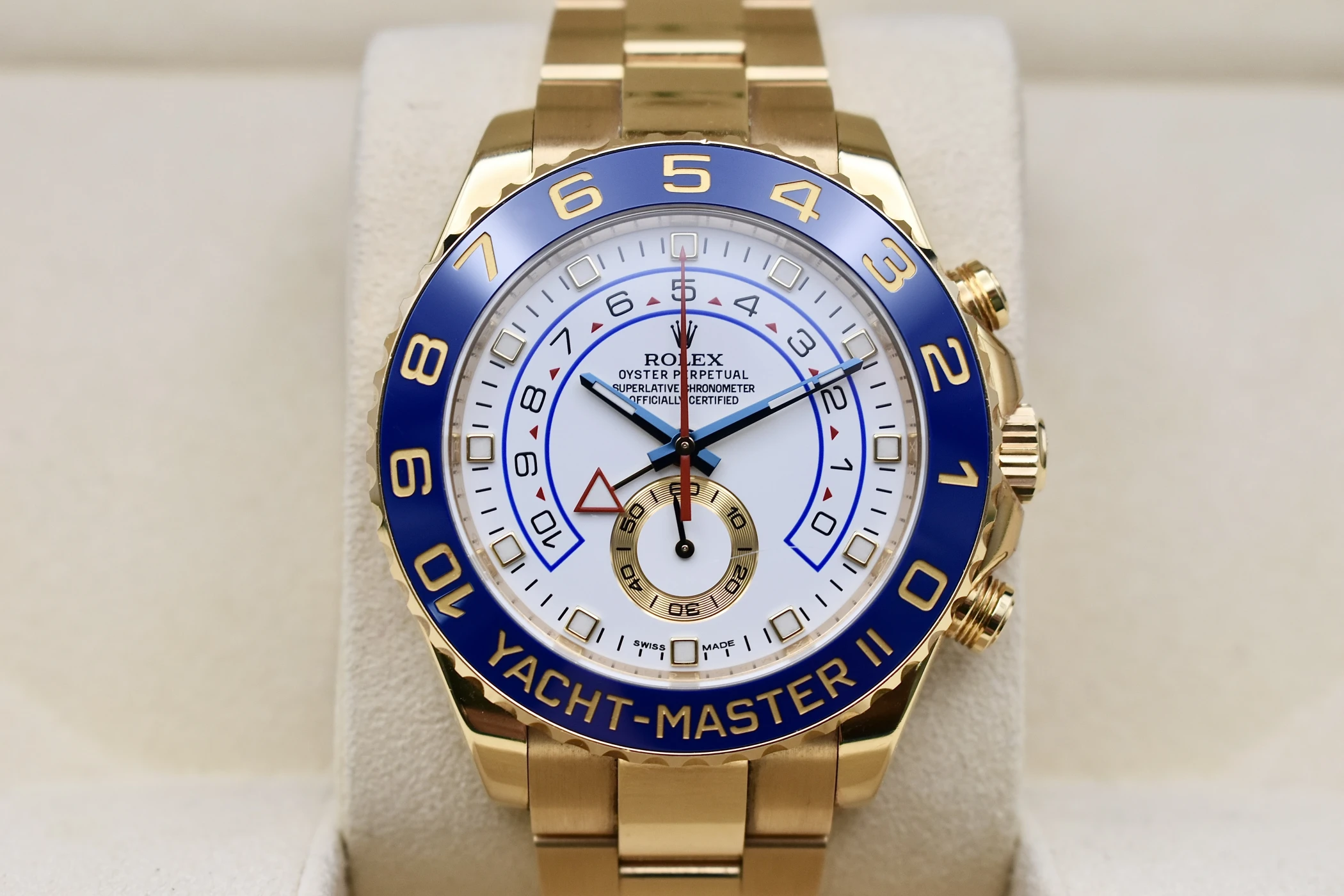 Command the seas — and the skyline — with the Rolex Yacht-Master II 18ct Gold (Ref. 116688), an extraordinary expression of precision, innovation, and prestige. Crafted entirely from 18-carat yellow gold, this Rolex professional regatta chronograph stands as a symbol of power, performance, and impeccable craftsmanship.Driven by the Rolex Calibre 4161 automatic movement, the Yacht-Master II is engineered with a programmable countdown timer and mechanical memory, designed specifically for competitive sailing. The bold 44mm Oyster case, striking blue Cerachrom bezel, and gleaming gold Oyster bracelet ensure a commanding presence — whether on deck or at the boardroom table.The Rolex Yacht-Master II 116688 perfectly embodies Rolex’s maritime spirit, combining high-end Swiss watchmaking with an unmistakably luxurious aesthetic. This model is the ultimate men’s gold sports watch, sought after by collectors and connoisseurs alike for its exclusivity, durability, and design excellence.Available now from Tempus Lord, a trusted luxury watch specialist based in the heart of Hatton Garden, London’s iconic jewellery district. Tempus Lord offers only authentic, certified Rolex watches, sourced with integrity and delivered with exceptional service.