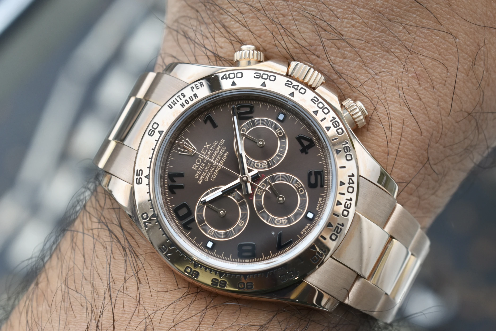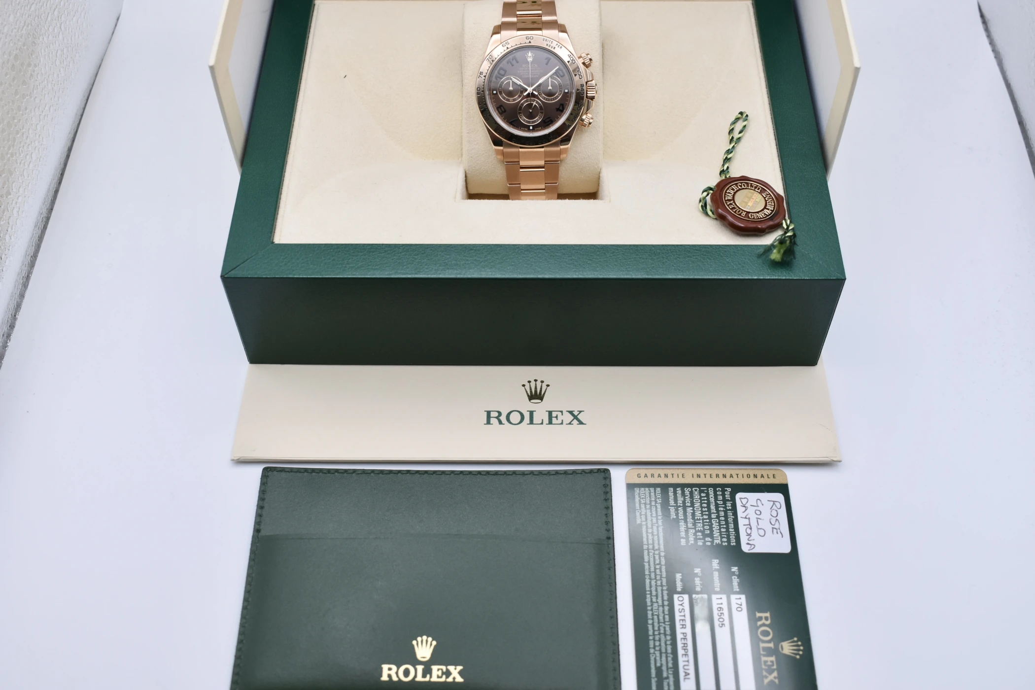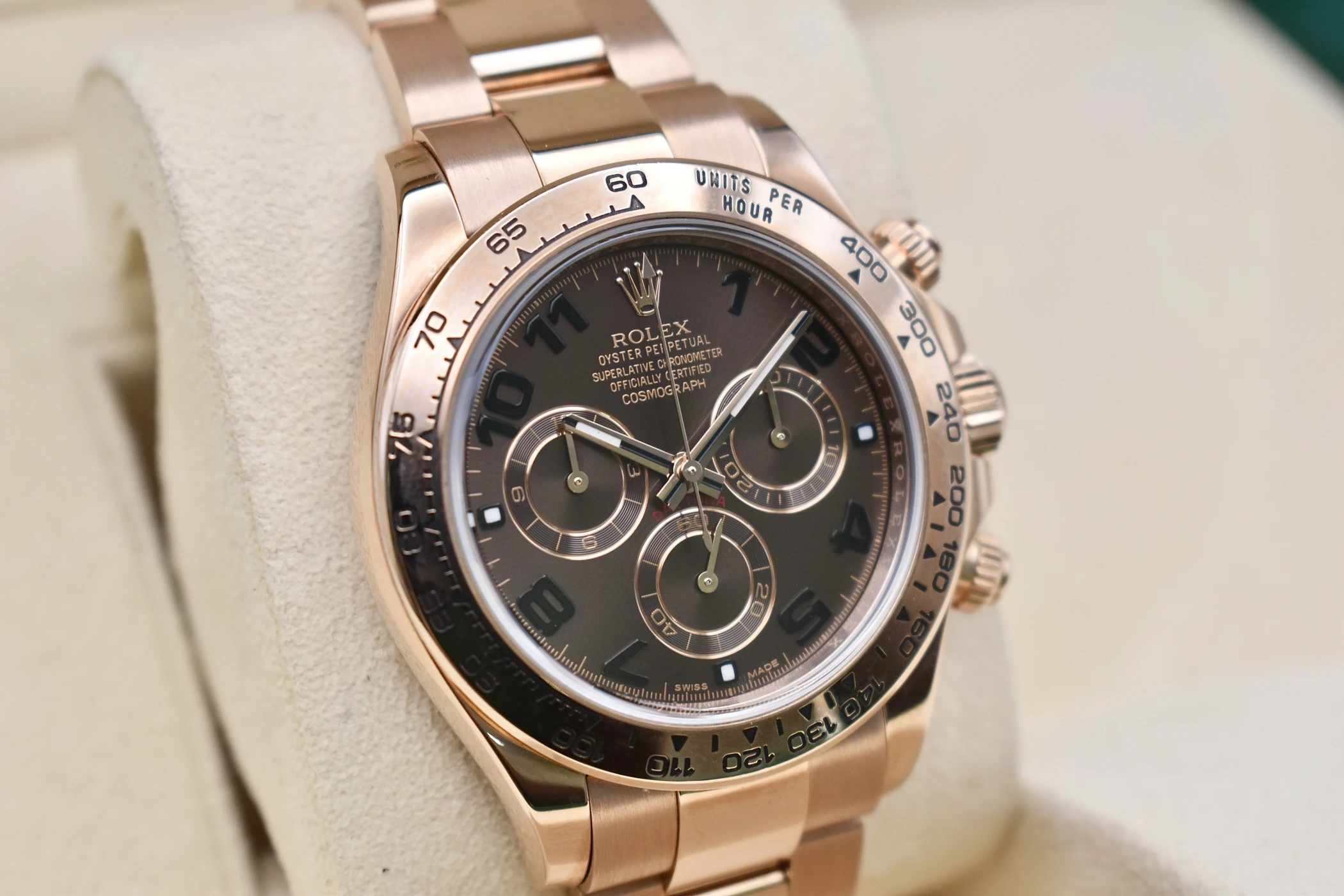 Experience the pinnacle of horological excellence with the Rolex Cosmograph Daytona Everose Gold Chocolate Arabic Dial (Ref. 116505) — a timepiece that unites precision, prestige, and power. Crafted entirely in 18k Everose gold, Rolex’s exclusive rose gold alloy, this model features a rich chocolate brown dial with Arabic numerals, exuding sophistication and warmth.Originally designed for professional racing drivers, the Rolex Daytona has evolved into one of the most sought-after luxury chronographs in the world. The 116505 perfectly balances sporty performance with elegant design, making it a timeless investment for collectors and enthusiasts alike.The chocolate Arabic dial version is one of the most desirable Daytona configurations, offering both rarity and distinction. The contrasting black sub-dials and polished Everose gold Oyster bracelet create a harmonious look that reflects Rolex’s legendary craftsmanship.Available exclusively from Tempus Lord, a trusted luxury watch retailer based in Hatton Garden, London’s iconic jewellery district. Each Rolex Daytona offered by Tempus Lord is 100% authentic, meticulously inspected, and presented in immaculate condition — complete with box and papers for absolute peace of mind.