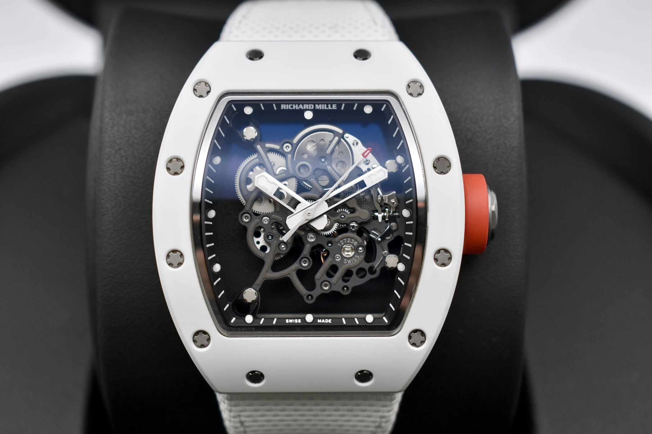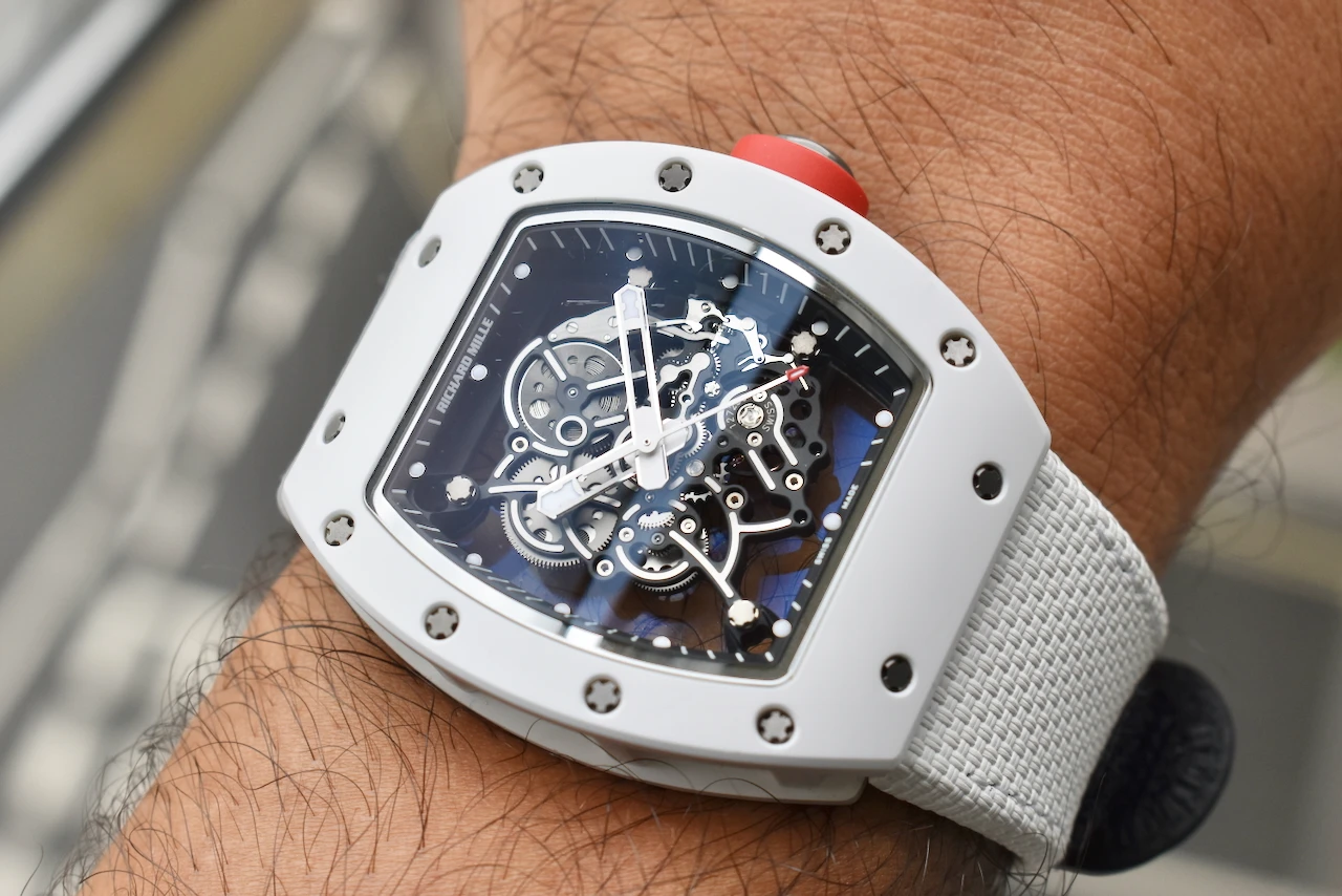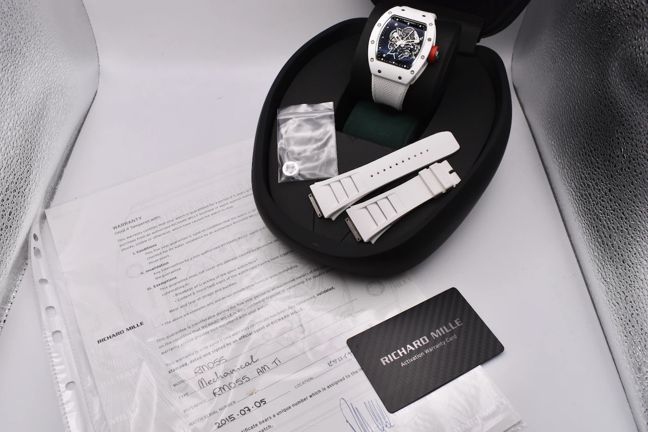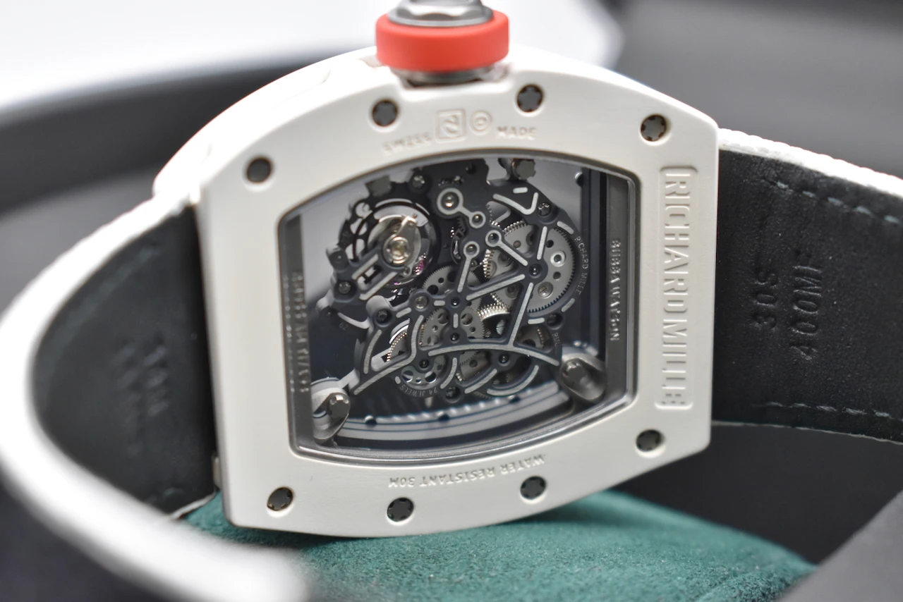 The Richard Mille RM055 Bubba Watson is a masterpiece of contemporary haute horlogerie, designed for performance, innovation, and prestige. Created in collaboration with professional golfer Bubba Watson, this model is the embodiment of Richard Mille’s philosophy of extreme technical precision and avant-garde design.The RM055 features a skeletonised manual-winding movement, crafted with titanium and ceramic for exceptional durability and ultra-light comfort. Its striking white ATZ ceramic case, contrasted with a titanium caseband and transparent sapphire elements, showcases the intricate movement within. With shock resistance built to withstand the impact of professional sports, the RM055 is not just a watch — it is a cutting-edge piece of Swiss engineering.This timepiece exemplifies Richard Mille’s commitment to innovation, exclusivity, and uncompromising quality. As a limited production model, the RM055 Bubba Watson is highly sought after by collectors worldwide, making it both a luxury lifestyle statement and an investment-grade timepiece.