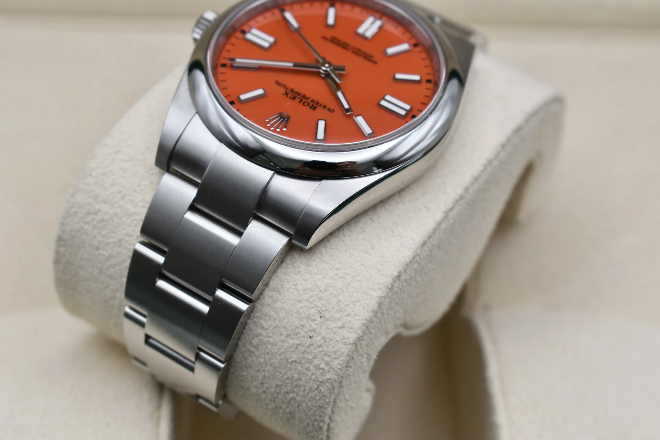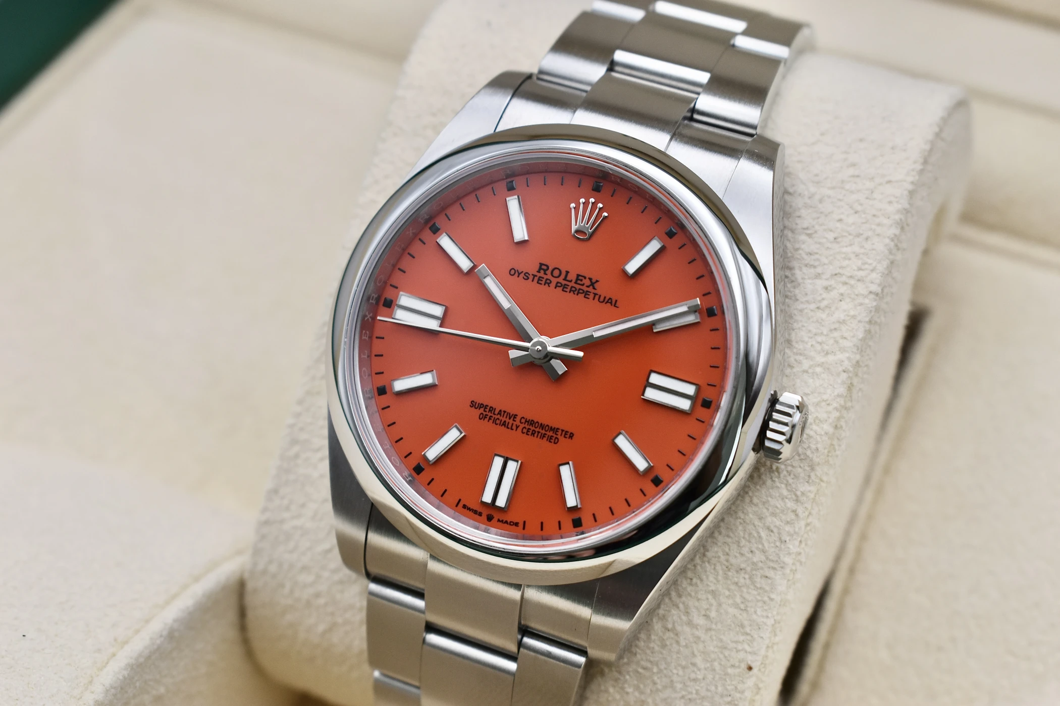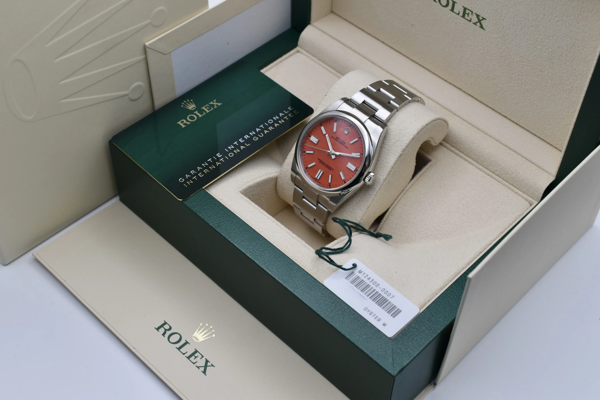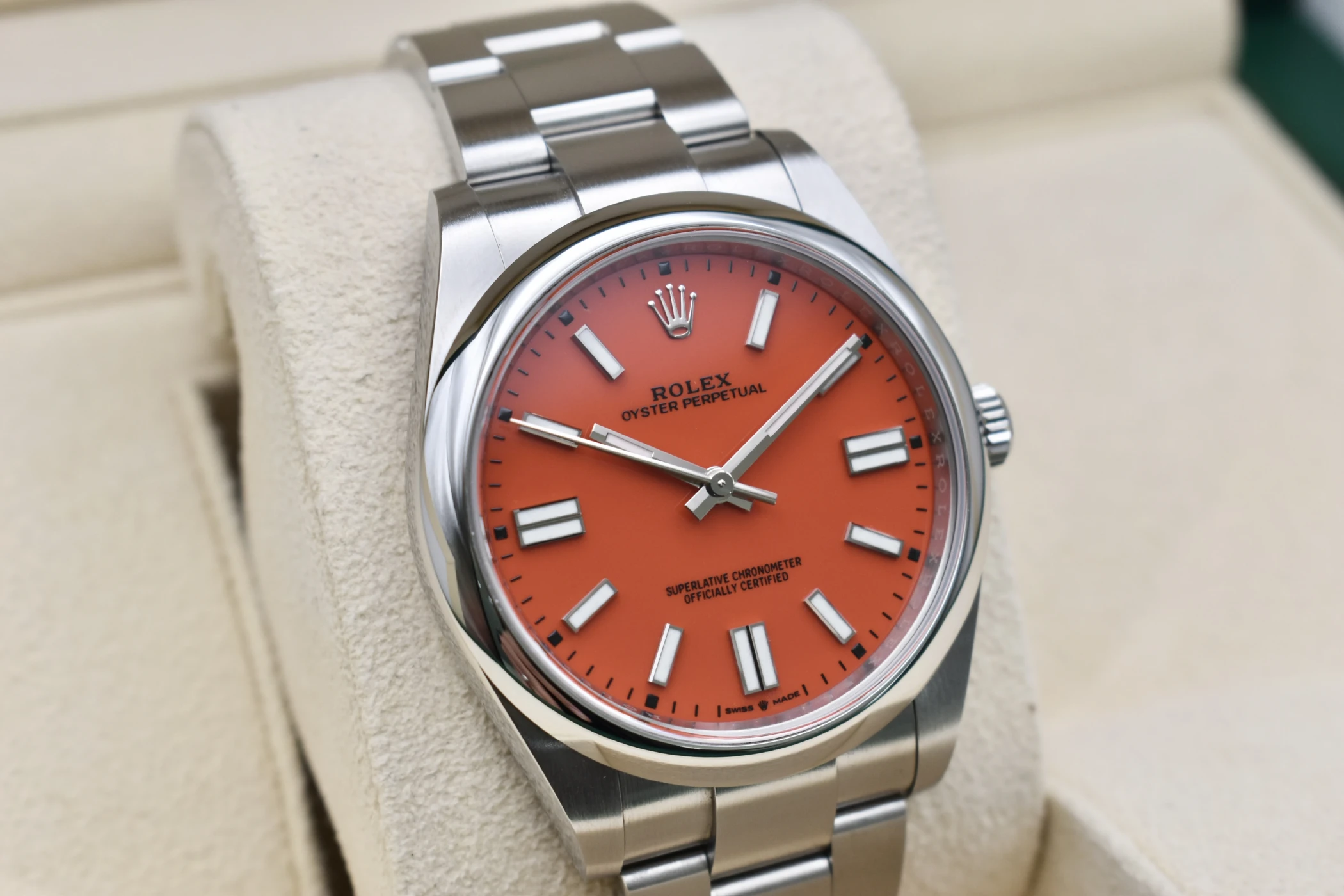 Experience timeless style and precision with the Rolex Oyster Perpetual 41 “Coral” (Ref. 124300), one of the most sought-after modern classics from the Rolex Oyster Perpetual collection. Crafted in stainless steel with a vibrant Coral Red dial, this 41mm masterpiece perfectly captures the spirit of Rolex — a fusion of heritage, innovation, and enduring design.The Coral dial version of the Oyster Perpetual 124300 has become an icon among collectors for its bold colour palette and discontinued status. Its clean, symmetrical lines and Oystersteel case showcase Rolex’s signature craftsmanship, while the Oyster bracelet delivers both comfort and durability. Inside, the watch houses the Rolex Calibre 3230, a self-winding mechanical movement certified as a Superlative Chronometer, offering outstanding precision and reliability.This Rolex Oyster Perpetual 41 Coral Red is a symbol of individuality and sophistication — equally at home as an everyday luxury watch or special occasion piece.