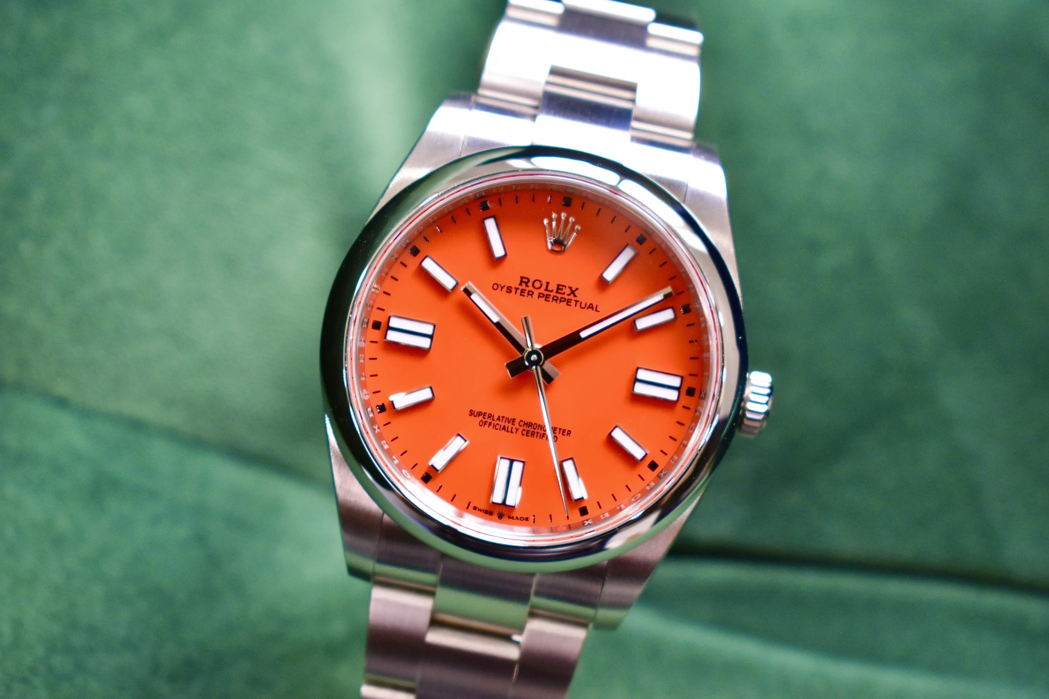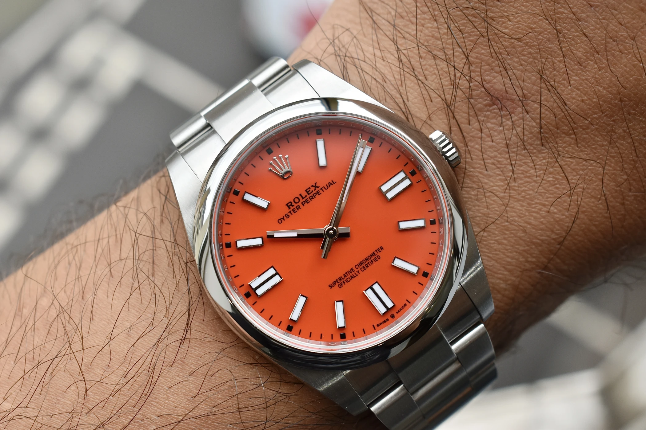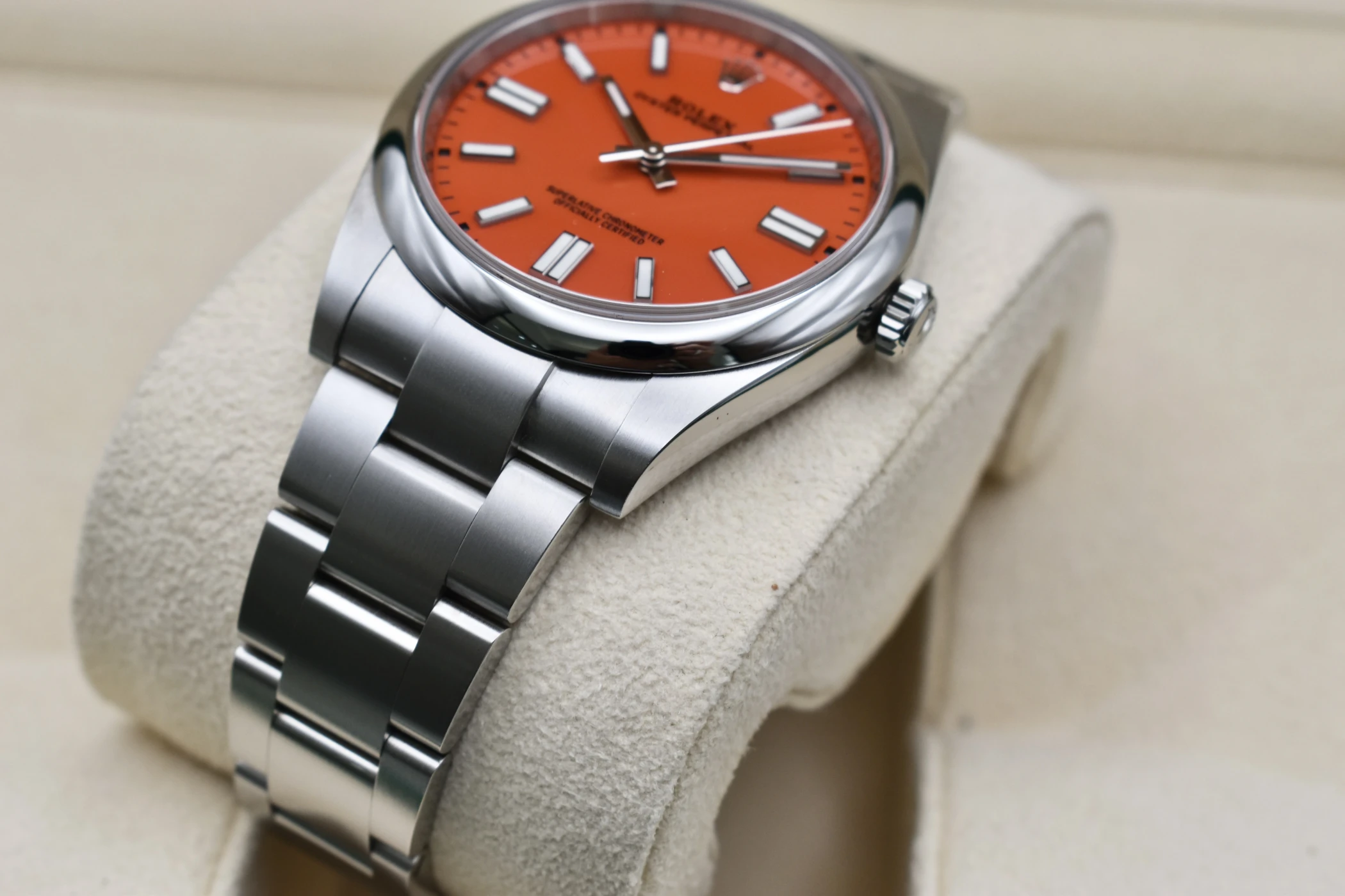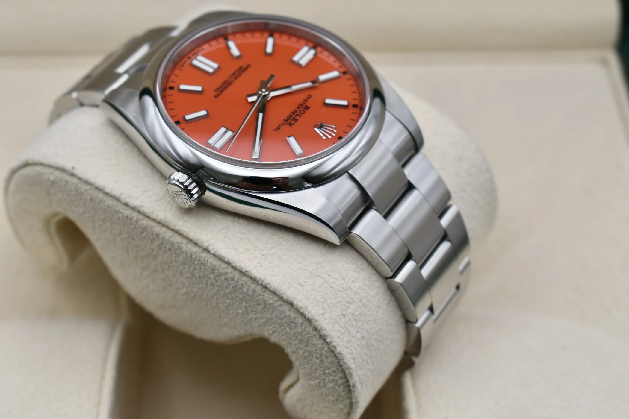 Experience timeless style and precision with the Rolex Oyster Perpetual 41 “Coral” (Ref. 124300), one of the most sought-after modern classics from the Rolex Oyster Perpetual collection. Crafted in stainless steel with a vibrant Coral Red dial, this 41mm masterpiece perfectly captures the spirit of Rolex — a fusion of heritage, innovation, and enduring design.The Coral dial version of the Oyster Perpetual 124300 has become an icon among collectors for its bold colour palette and discontinued status. Its clean, symmetrical lines and Oystersteel case showcase Rolex’s signature craftsmanship, while the Oyster bracelet delivers both comfort and durability. Inside, the watch houses the Rolex Calibre 3230, a self-winding mechanical movement certified as a Superlative Chronometer, offering outstanding precision and reliability.This Rolex Oyster Perpetual 41 Coral Red is a symbol of individuality and sophistication — equally at home as an everyday luxury watch or special occasion piece.